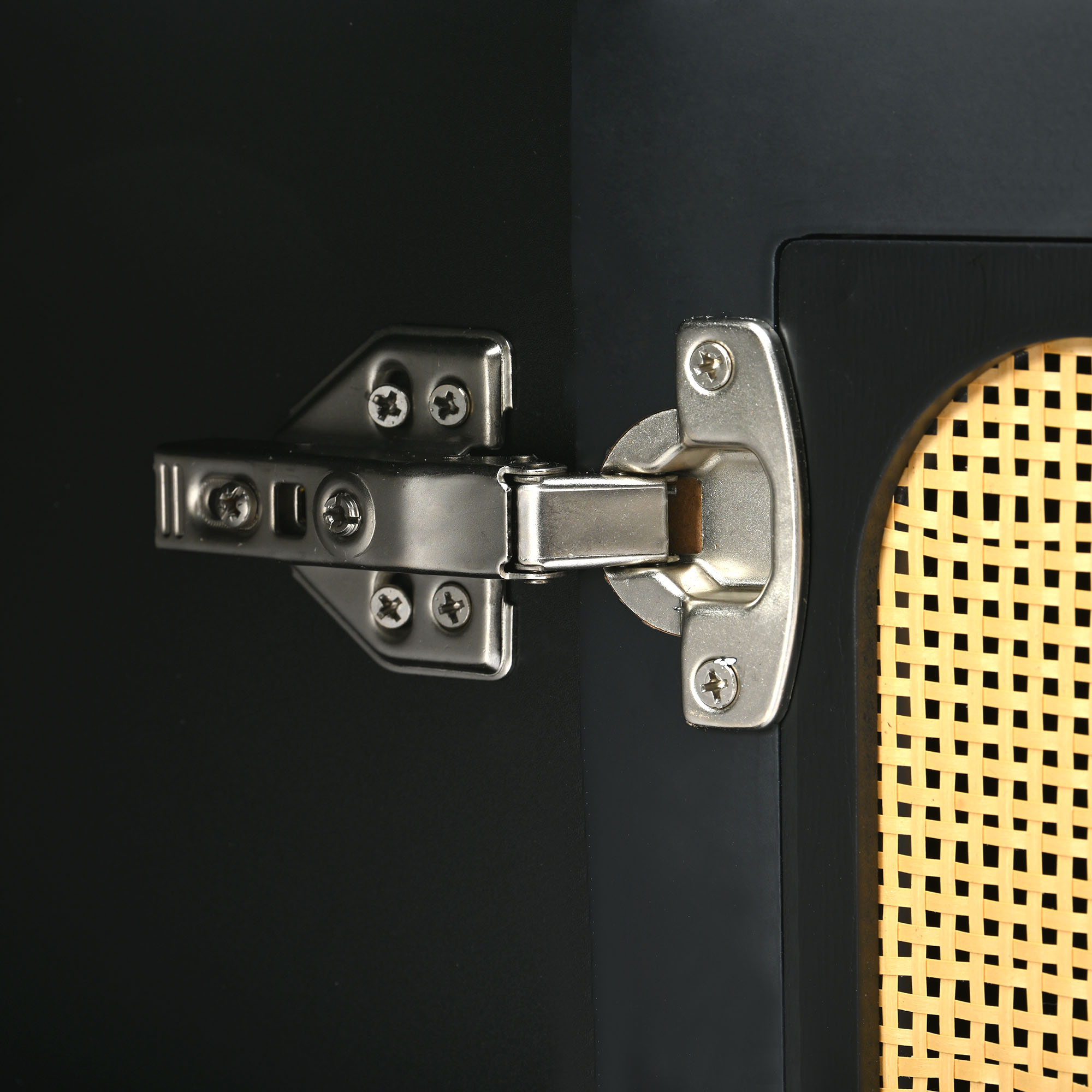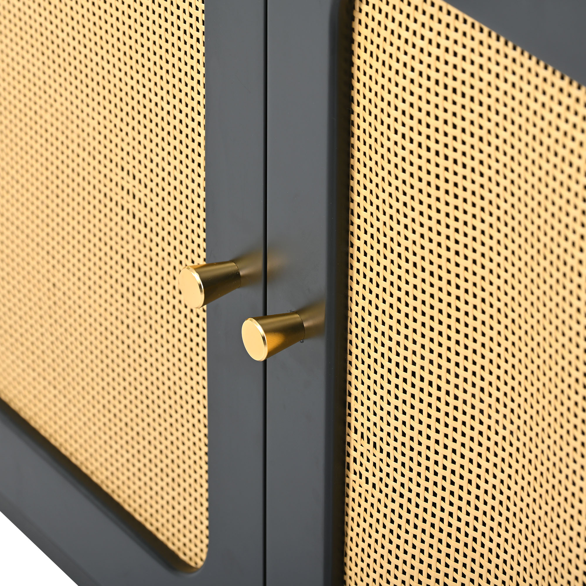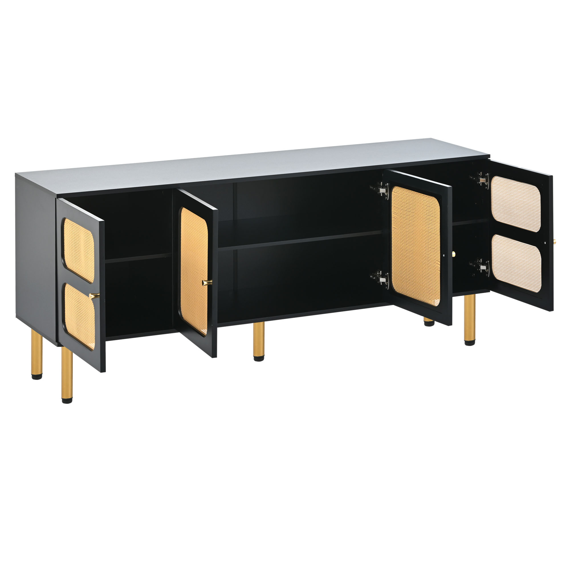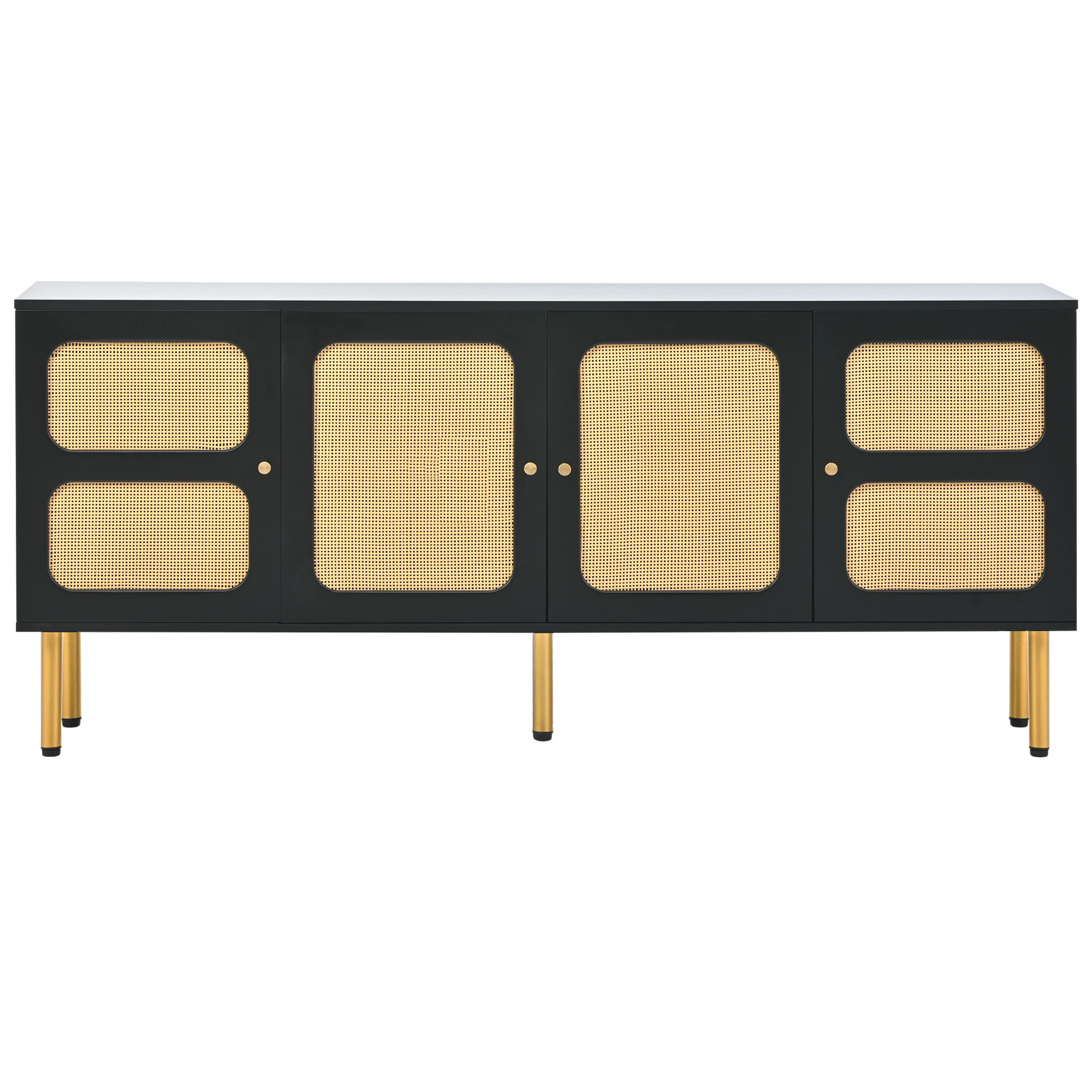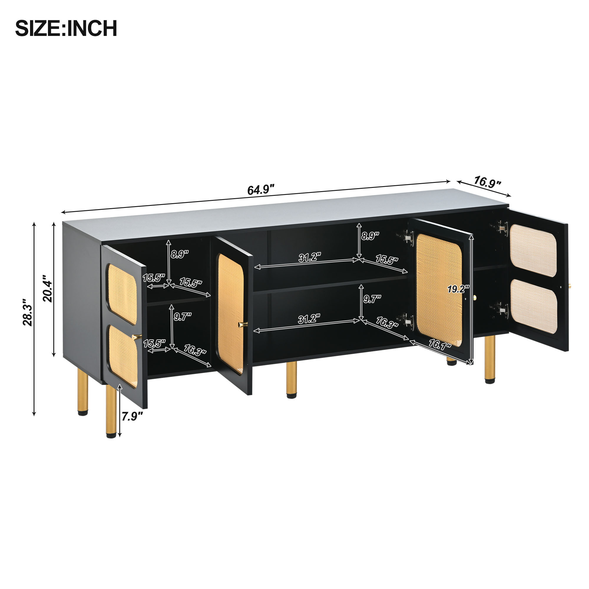 ON-TREND Boho style TV Stand with Rattan Door, Woven Media Console Table for TVs Up to 70”, Country Style Design Side Board with Gold Metal Base for Living Room, Black.