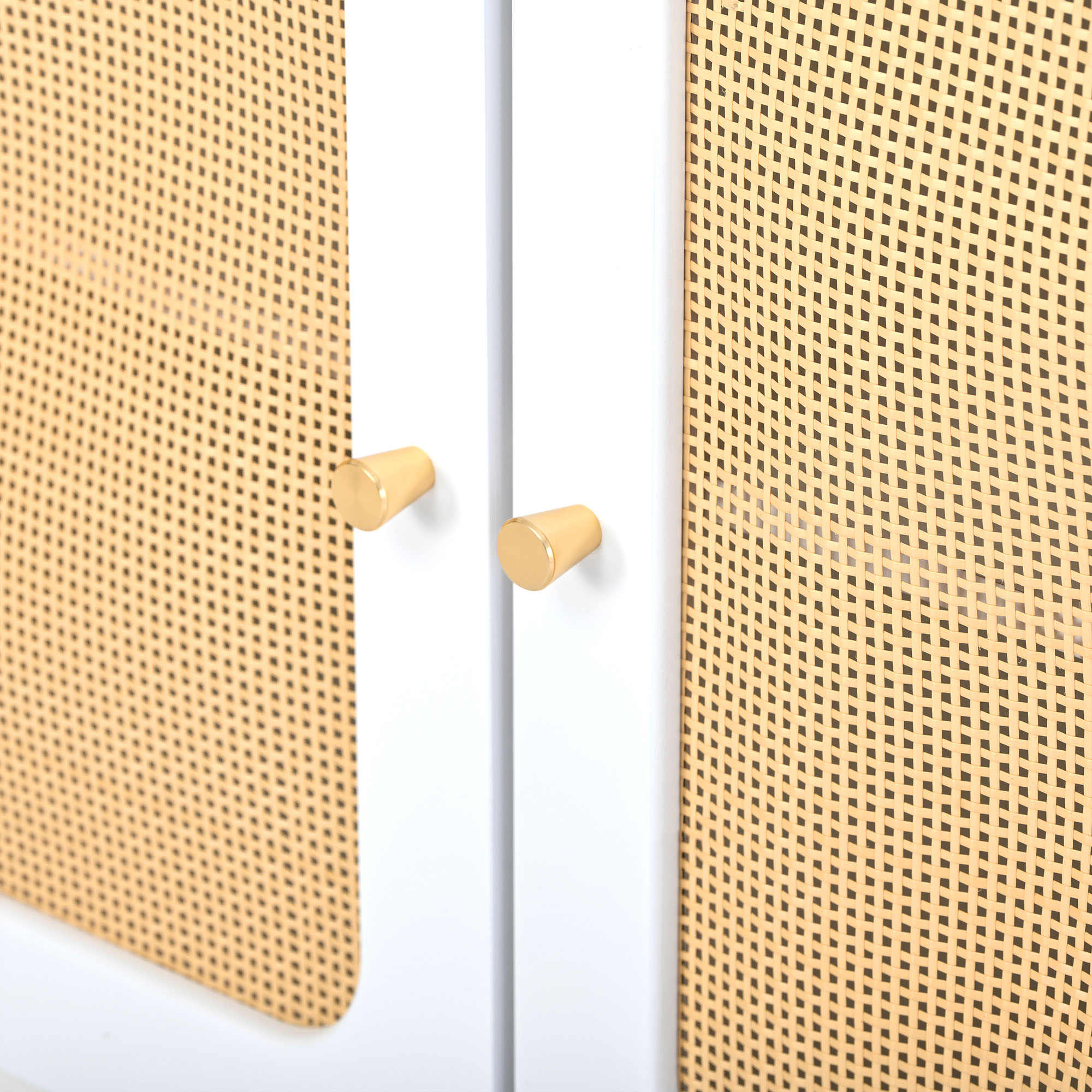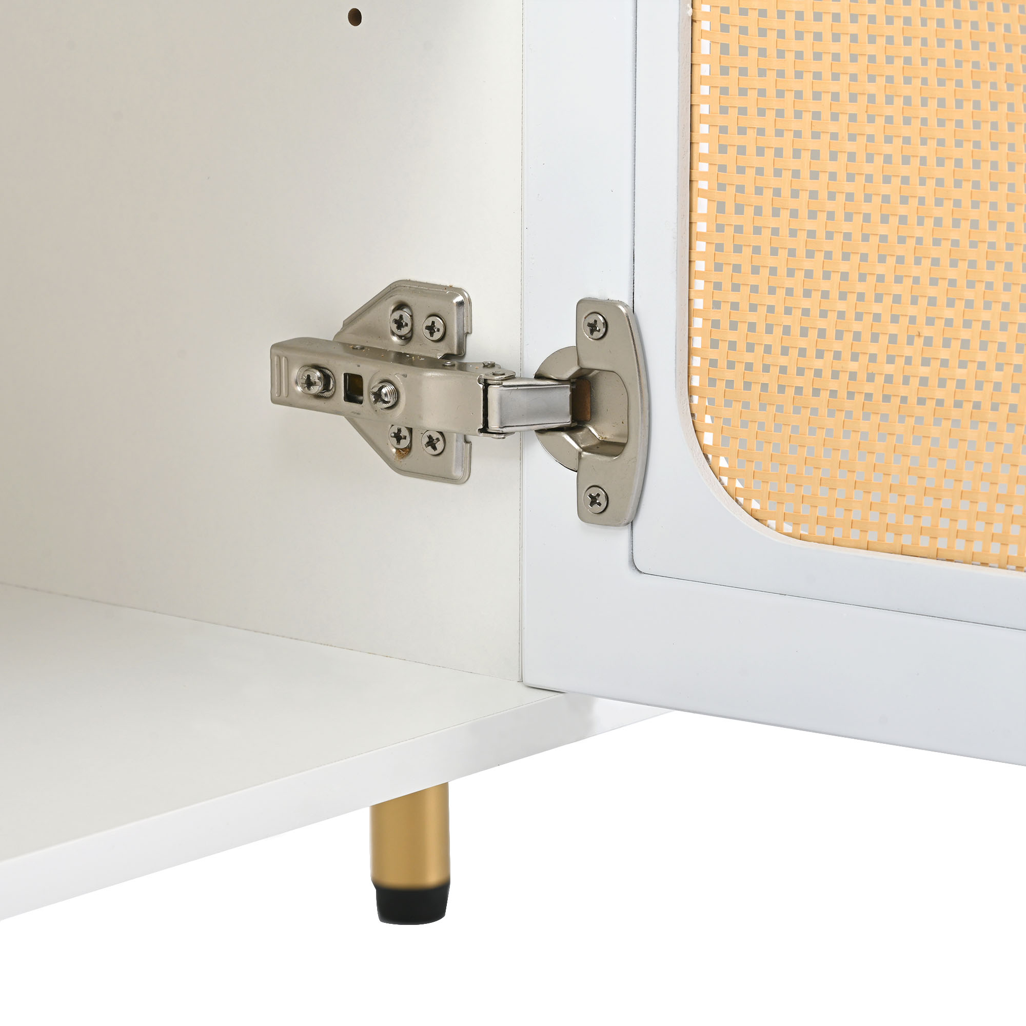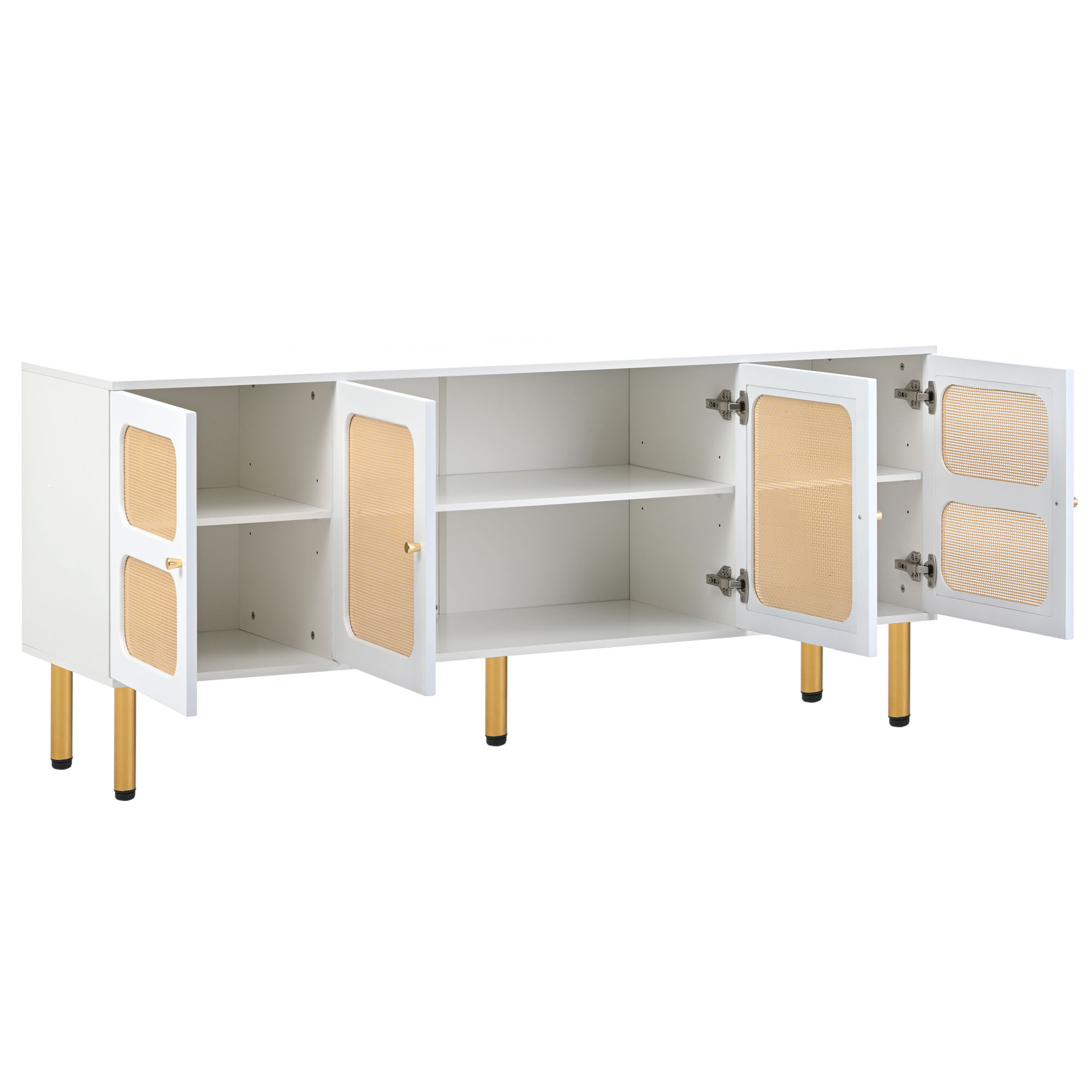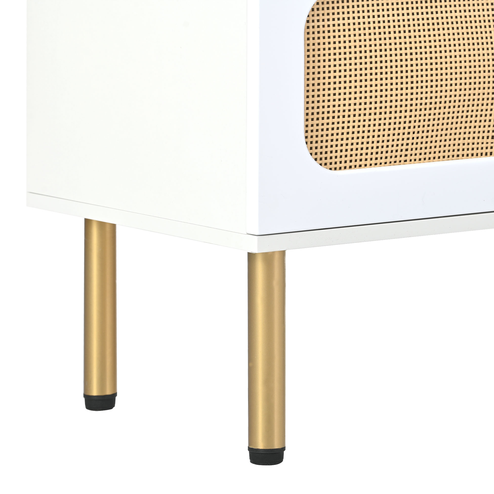 ON-TREND Boho style TV Stand with Rattan Door, Woven Media Console Table for TVs Up to 70”, Country Style Design Side Board with Gold Metal Base for Living Room, White.