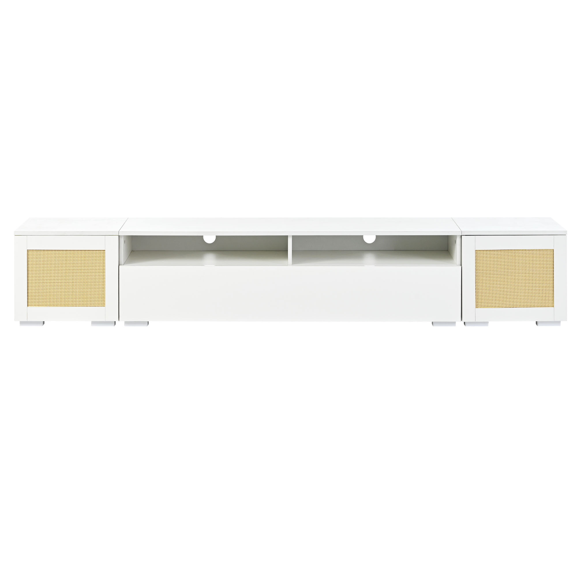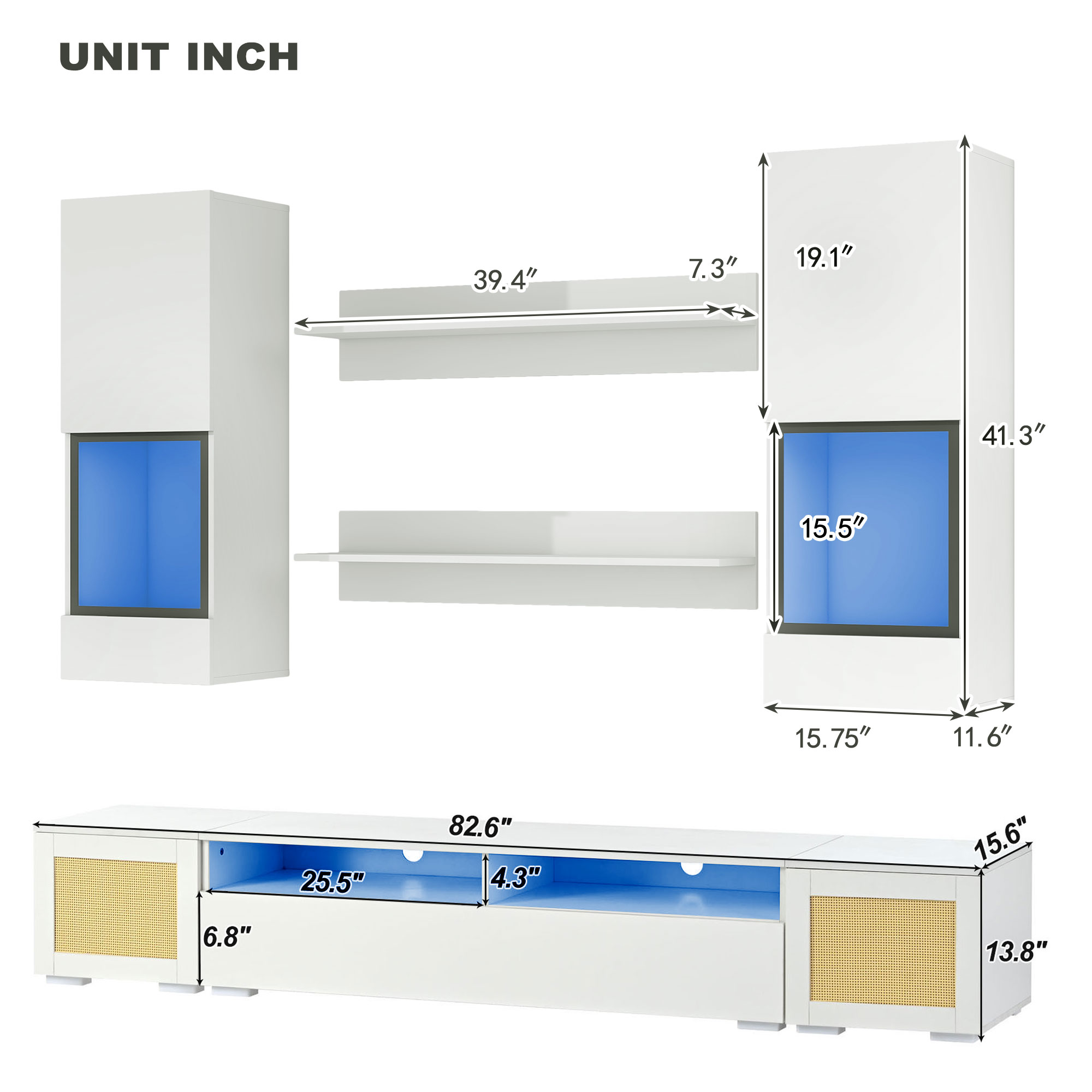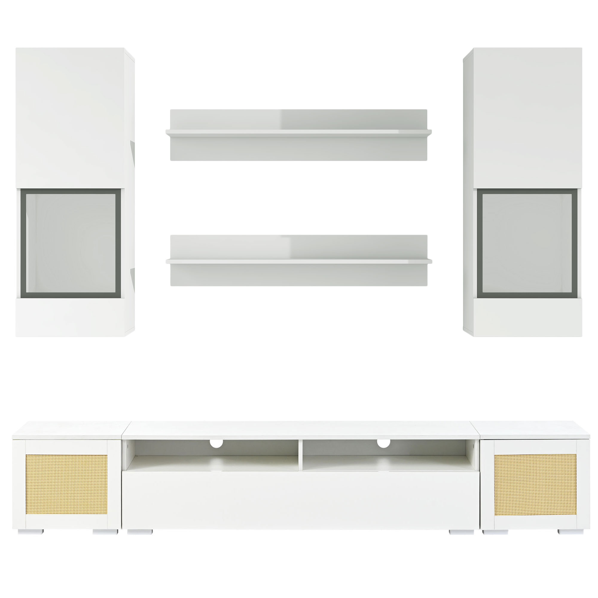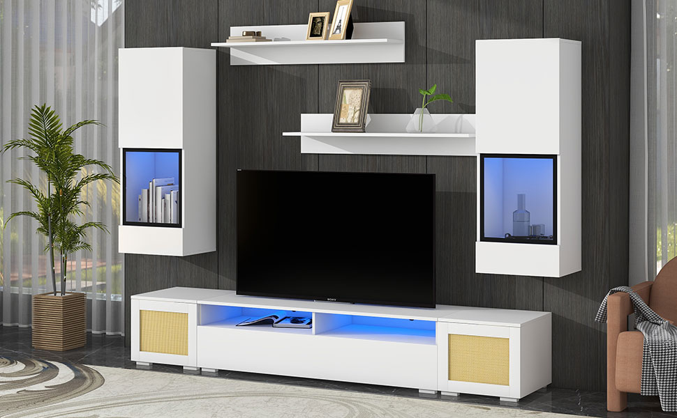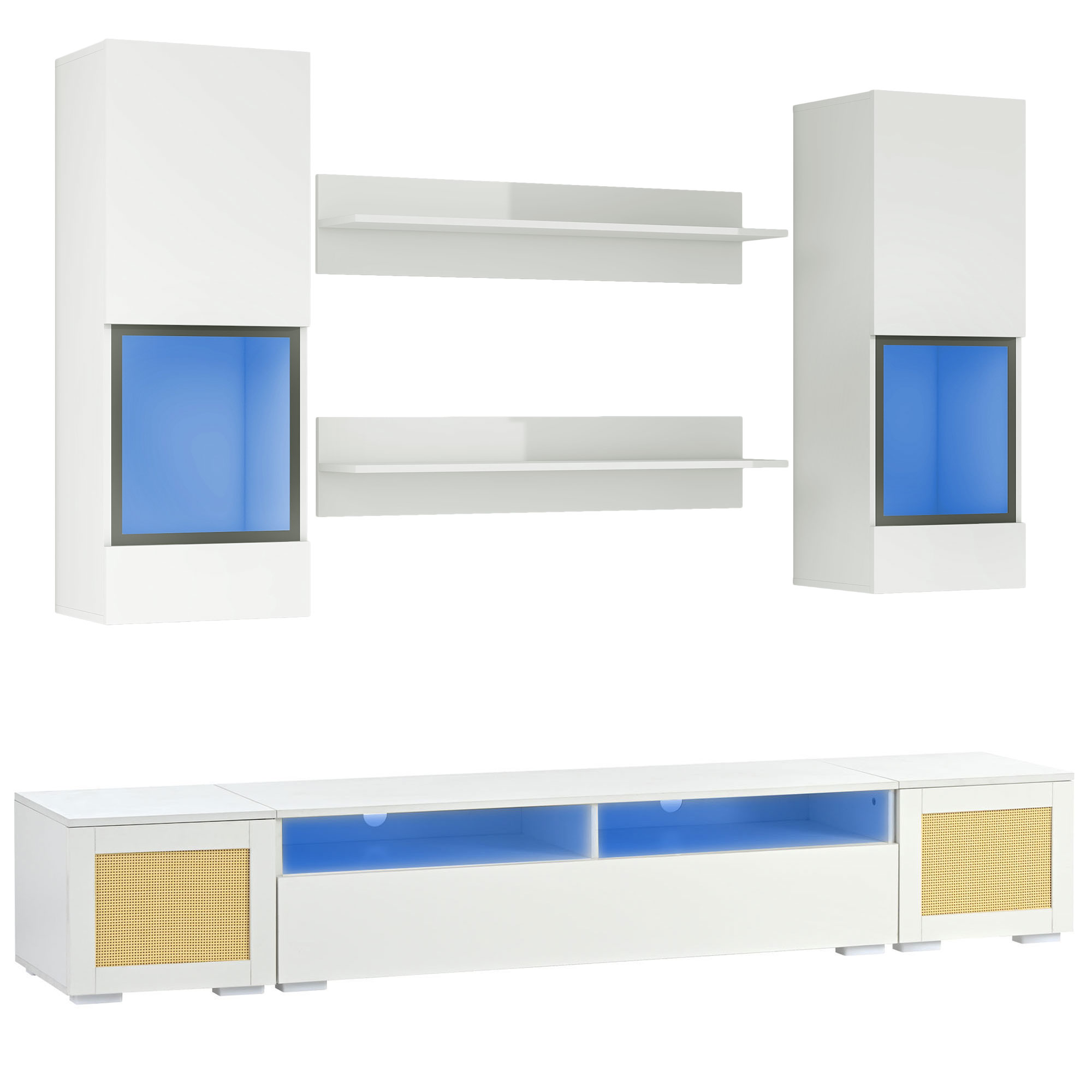 ON-TREND Extended, Rattan Style Entertainment Center, 7 Pieces Floating TV Console Table for TVs Up to 90”, High Gloss Wall Mounted TV Stand with Color Changing LED Lights for Home Theatre, White.