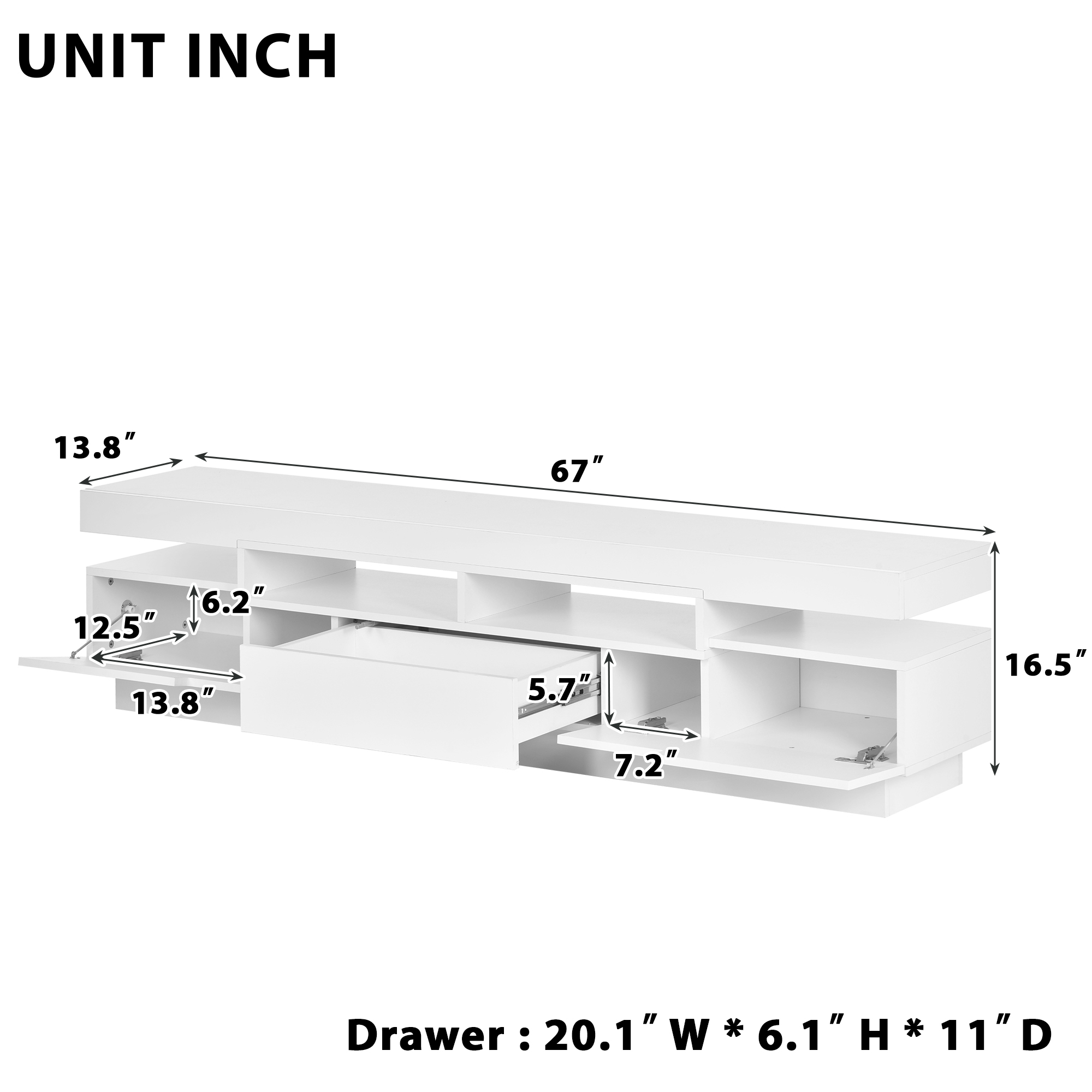 This product is 67”W x 13.8”D x 16.5”H.