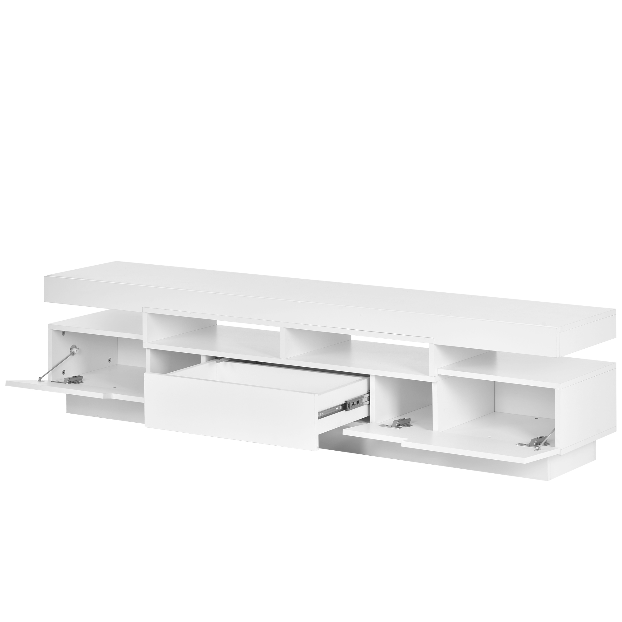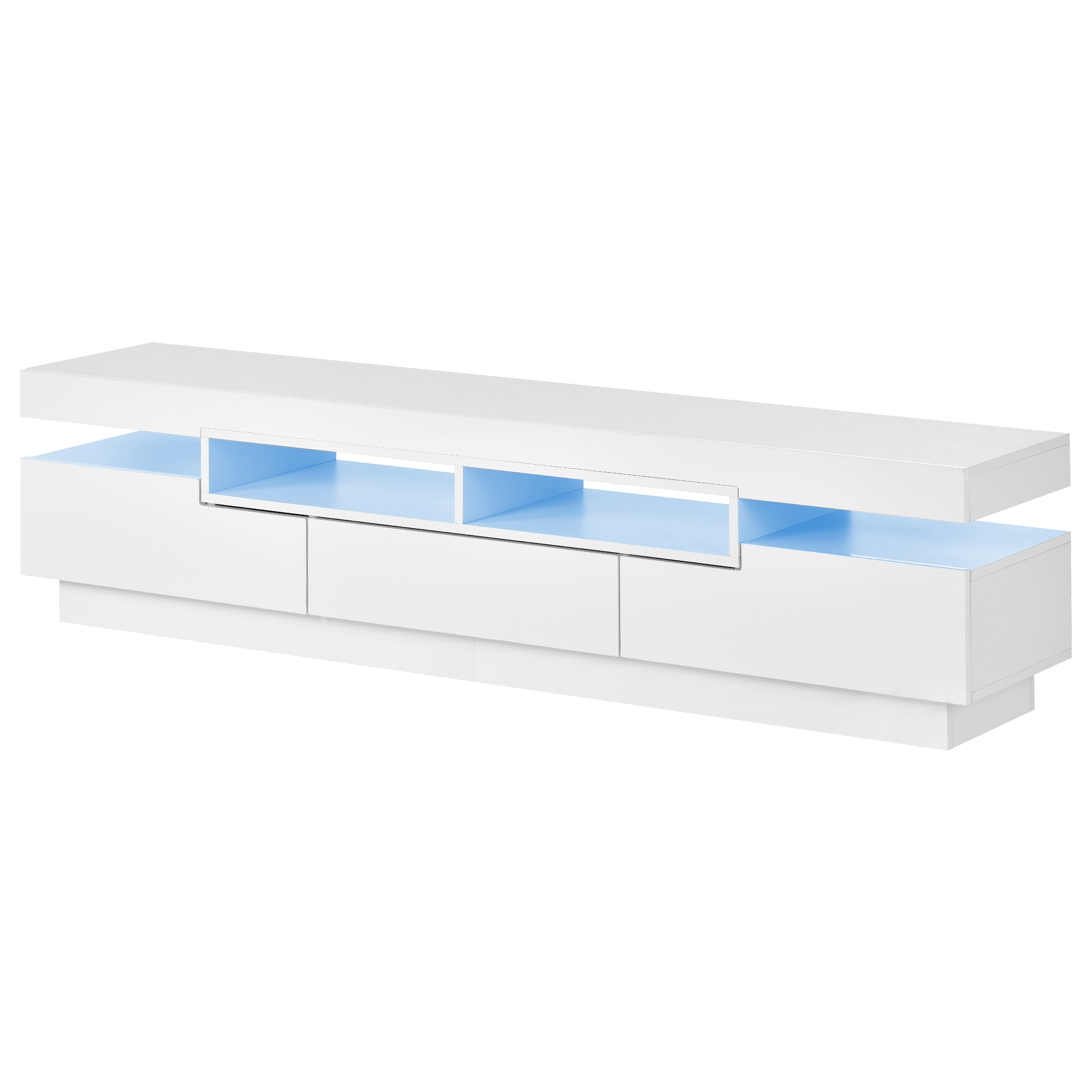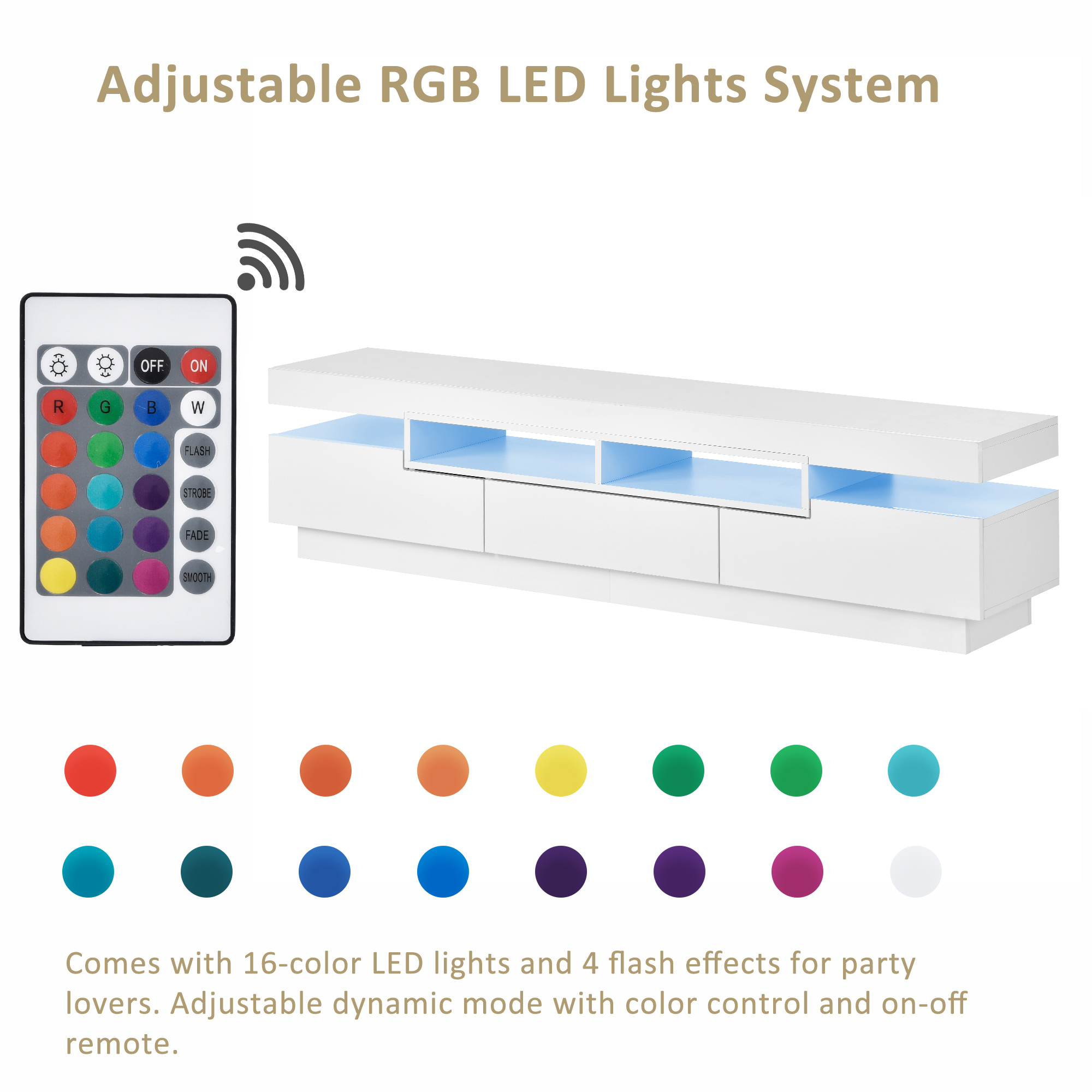 In order to add viewing and entertaining features of this TV stand, 16-color LED strip lights is fixed beneath the table top to create varied lighting effects. The LED strip lights have four modes to perform different lights, namely gradient mode, breathing light mode, fast blinking mode, and slow blinking mode. A remote control, signal receiver, and electric pressure converter are the accessories of it.