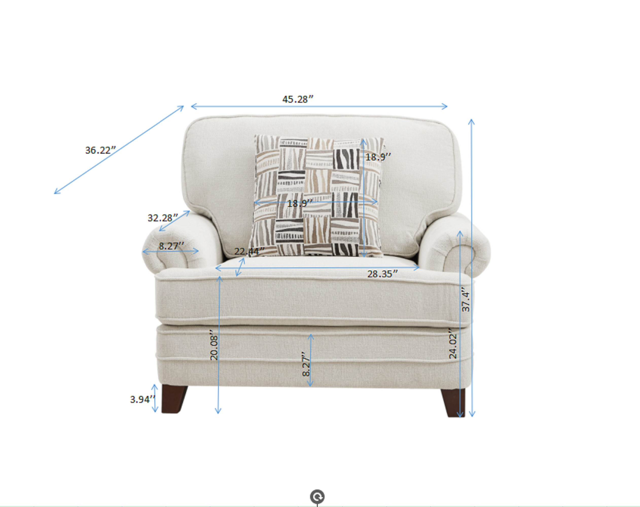 Single Sofa - Beige ChenilleProduct size: 45.27*36.22"*37.4" Net weight: 69.42 lbsPackage Size: 45.27"*37.4"*28.34" Gross Weight: 80.88 lbsInside: chenille 100% polyesterSnake spring + spring packsolid wood frameRubberwood solid wood feet300 pounds per seatincludes a throw pillow