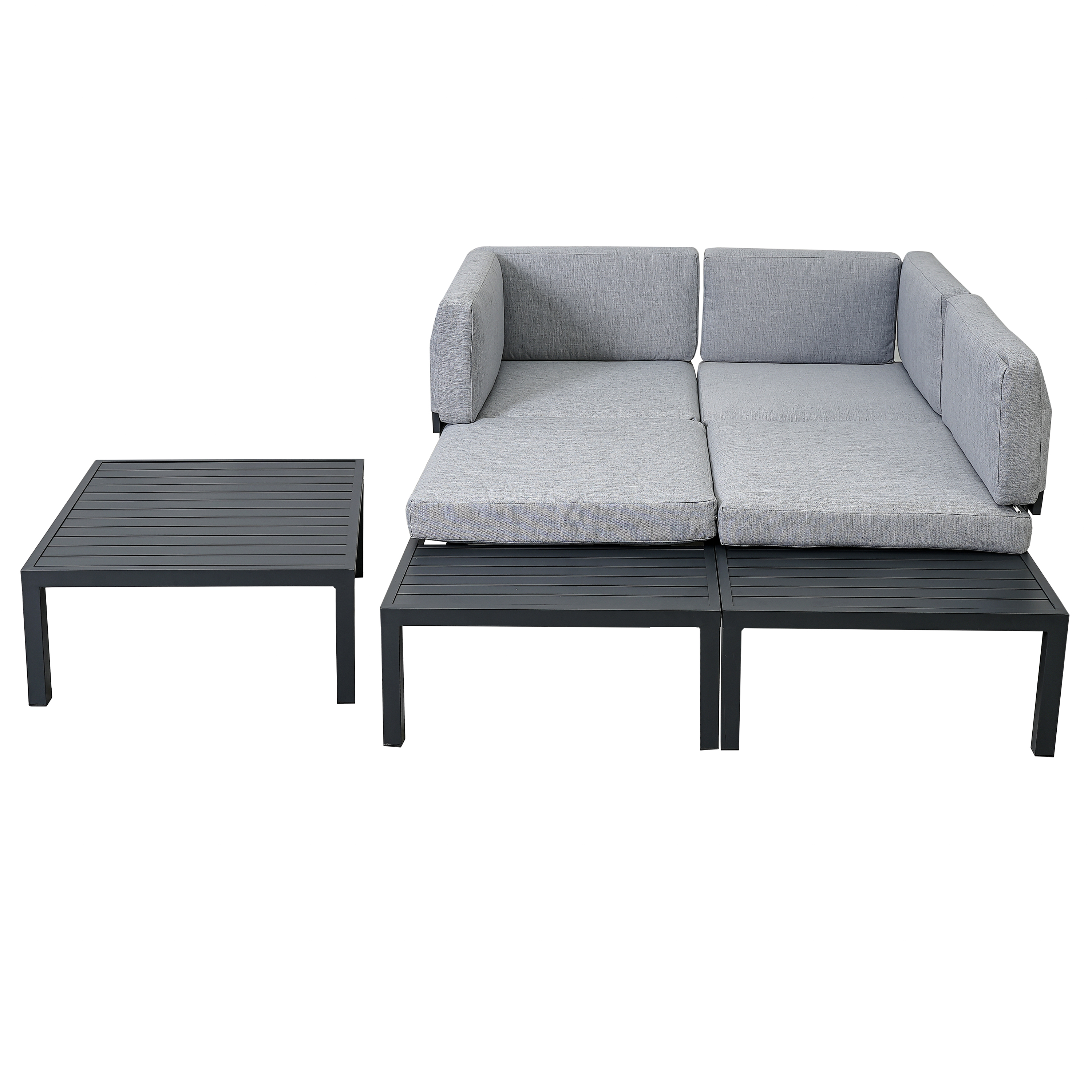 The patio Sofa set is made of durable aluminum oxide. The surface of the coffee table is made of aluminum strips (surface sprayed), waterproof and UV-resistant which make it not worry about damage and rust when used outdoors. Please note that these cushions are non-waterproof.