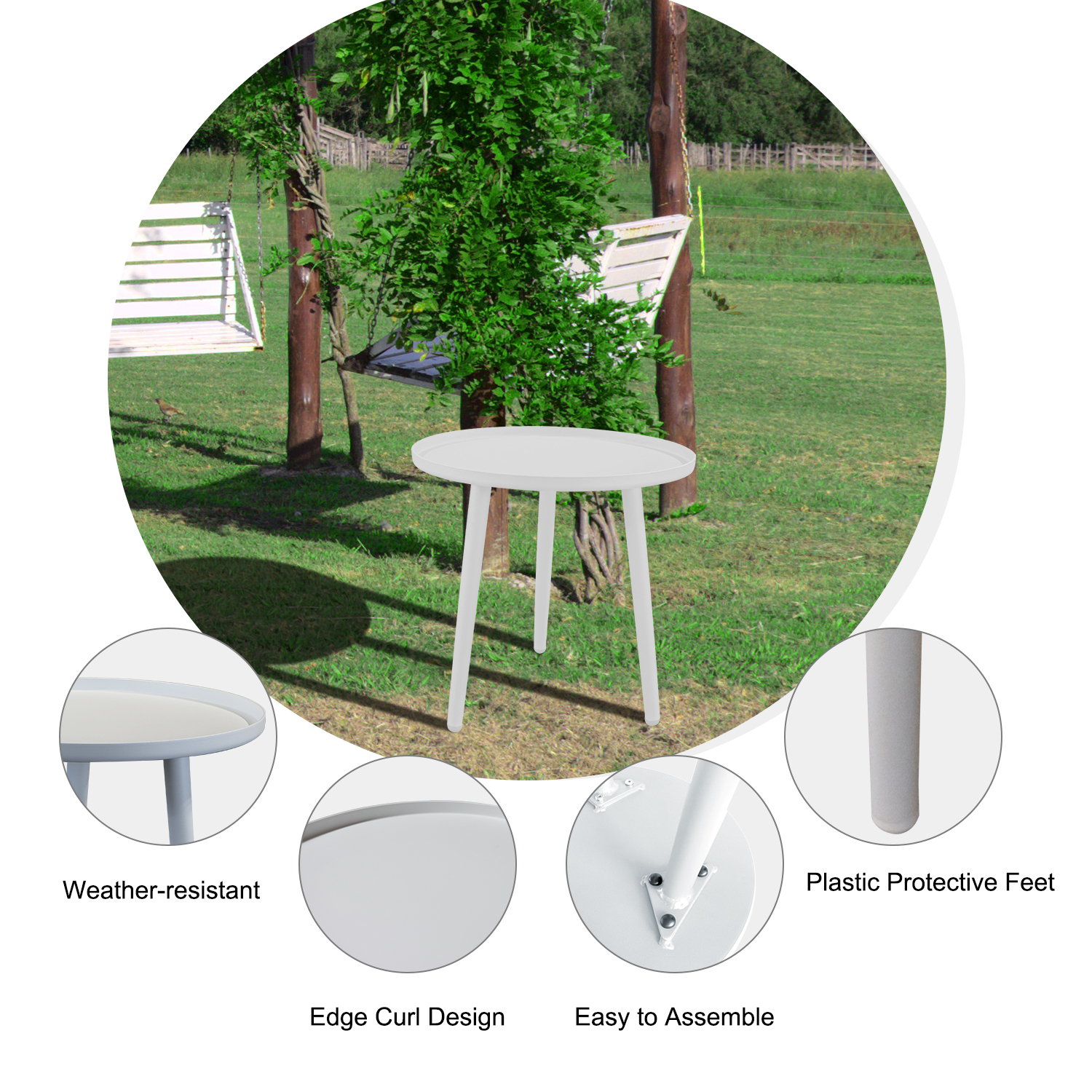 Round side table is a perfect accessory to compatible for any room with its minimalist and elegant appearance.Ideal Size for Small SpacesThe perfect size and height make it ideal to use next to a chair, sofa, bedside, indoor and outdoor as a practical side tables for the additional need of storage and display.Easy to Clean & AssemblyWith the smooth and waterproof surface, you can easily clean the coffee side table with a cleaning cloth, super easy to assemble, you just need to screw the legs into table top, comes with screw driver.