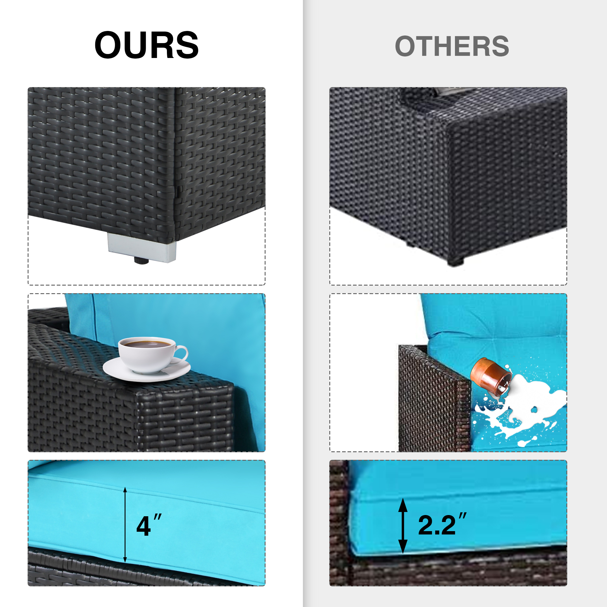 Able to fit a variety of living space styles and settings, this sofa and table set can be placed in an endless number of configurations,adding handsome décor to your Patio, Porch, Backyard, Balcony, Poolside,Garden, Lawn,Bistro,Conservatory and Other Suitable Space Home and Outside.