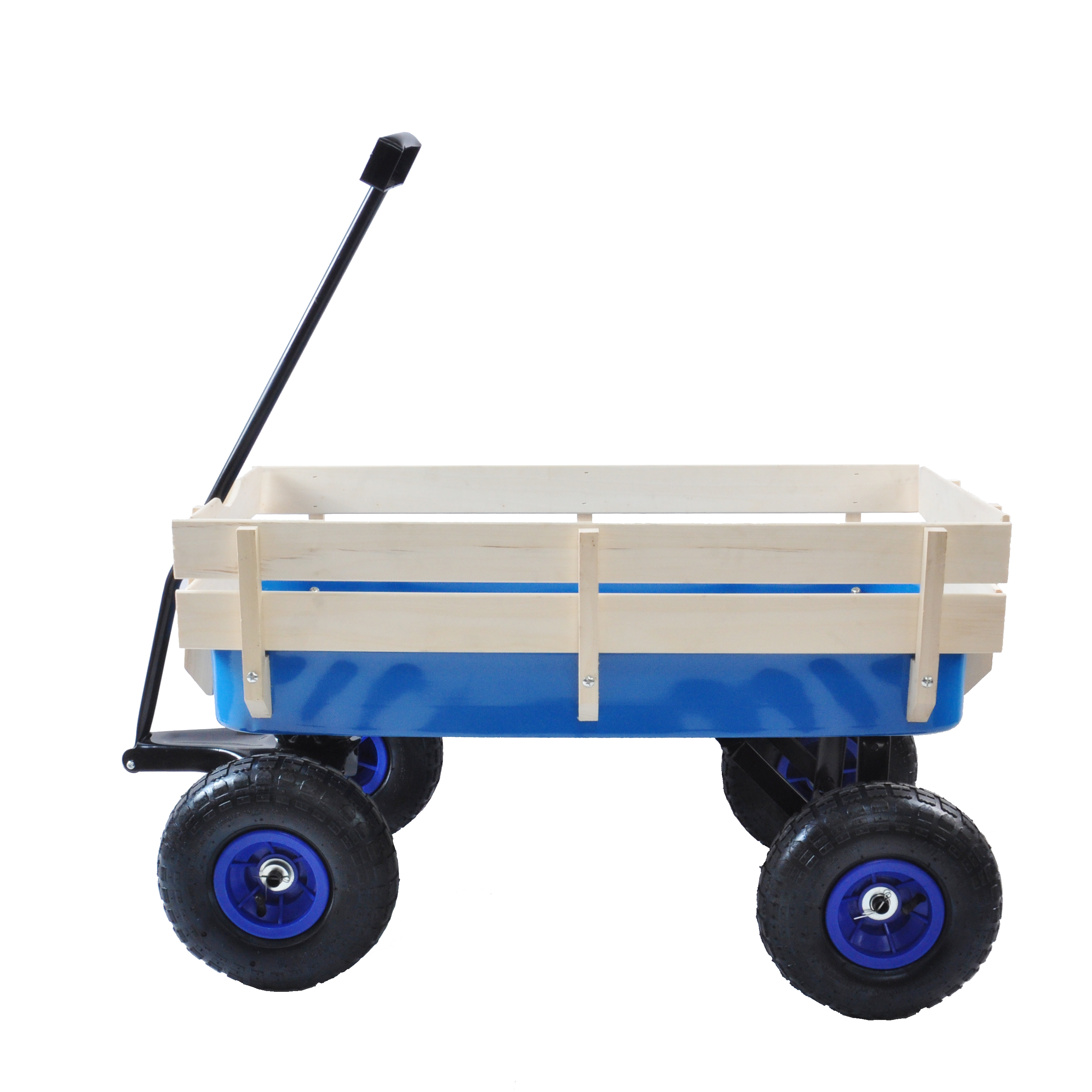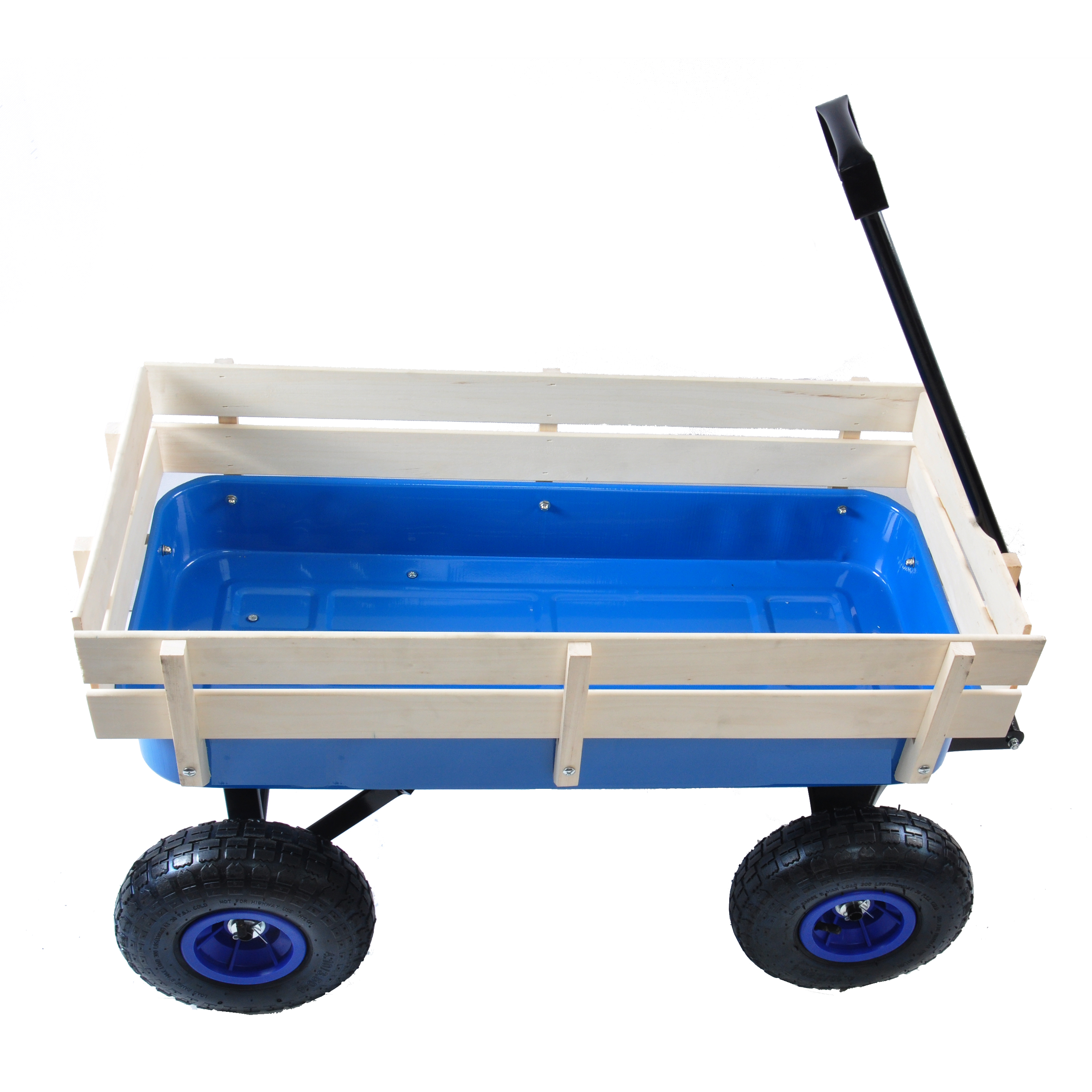 This big foot panel wagon has an all-steel construction, rugged air tires and wooden stake sides, which is great for your kids or grandkids to play with. The wagon can haul gardening tools or supplies in the yard! It has a large loading capacity of 176 lbs. The extra-long handle is foldable under for easy storage. The wooden panels in the side are removable.