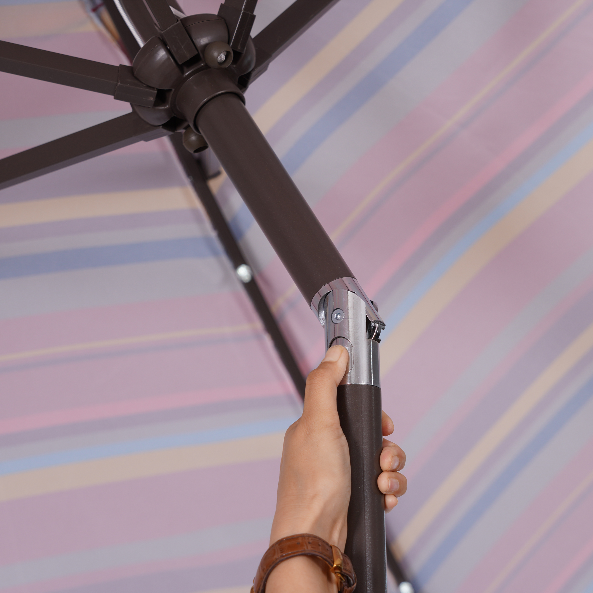 【Wind Vent】It has an air vent at the top to stop the wind pulling the parasol upwards. It also helps to keep you cool when you're sitting beneath the canopy while adding extra stability.