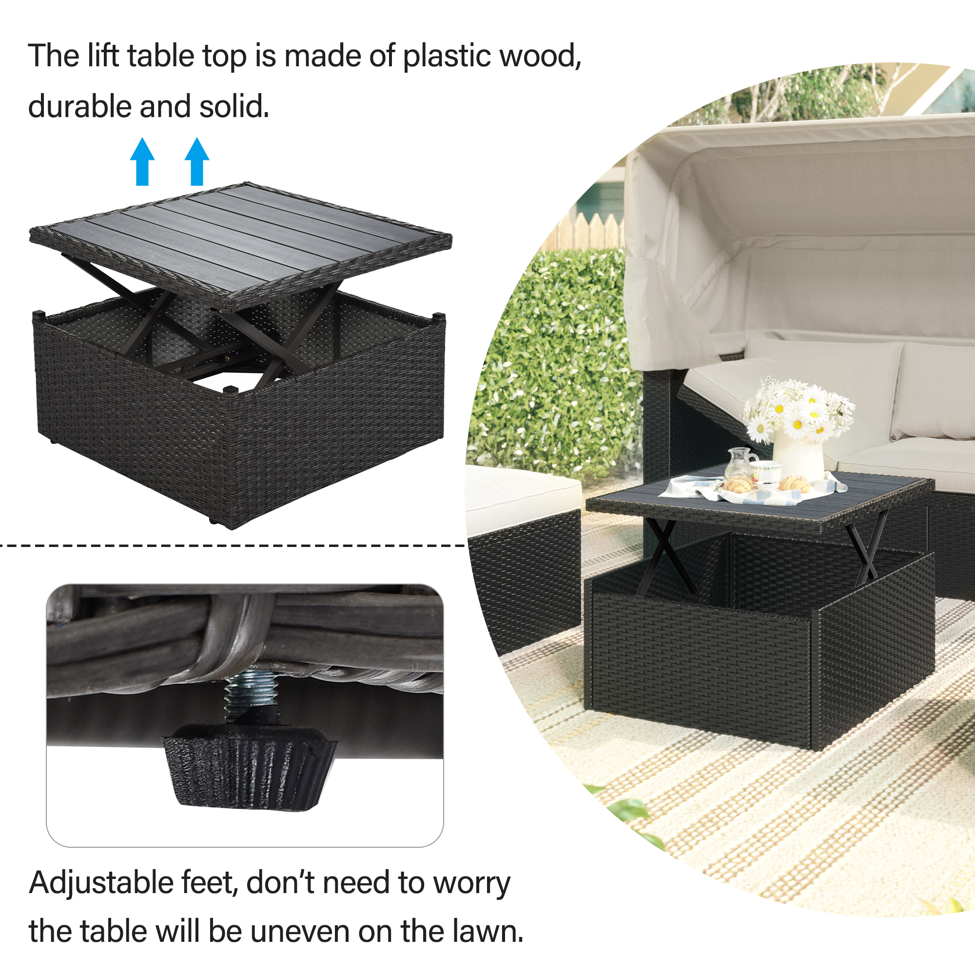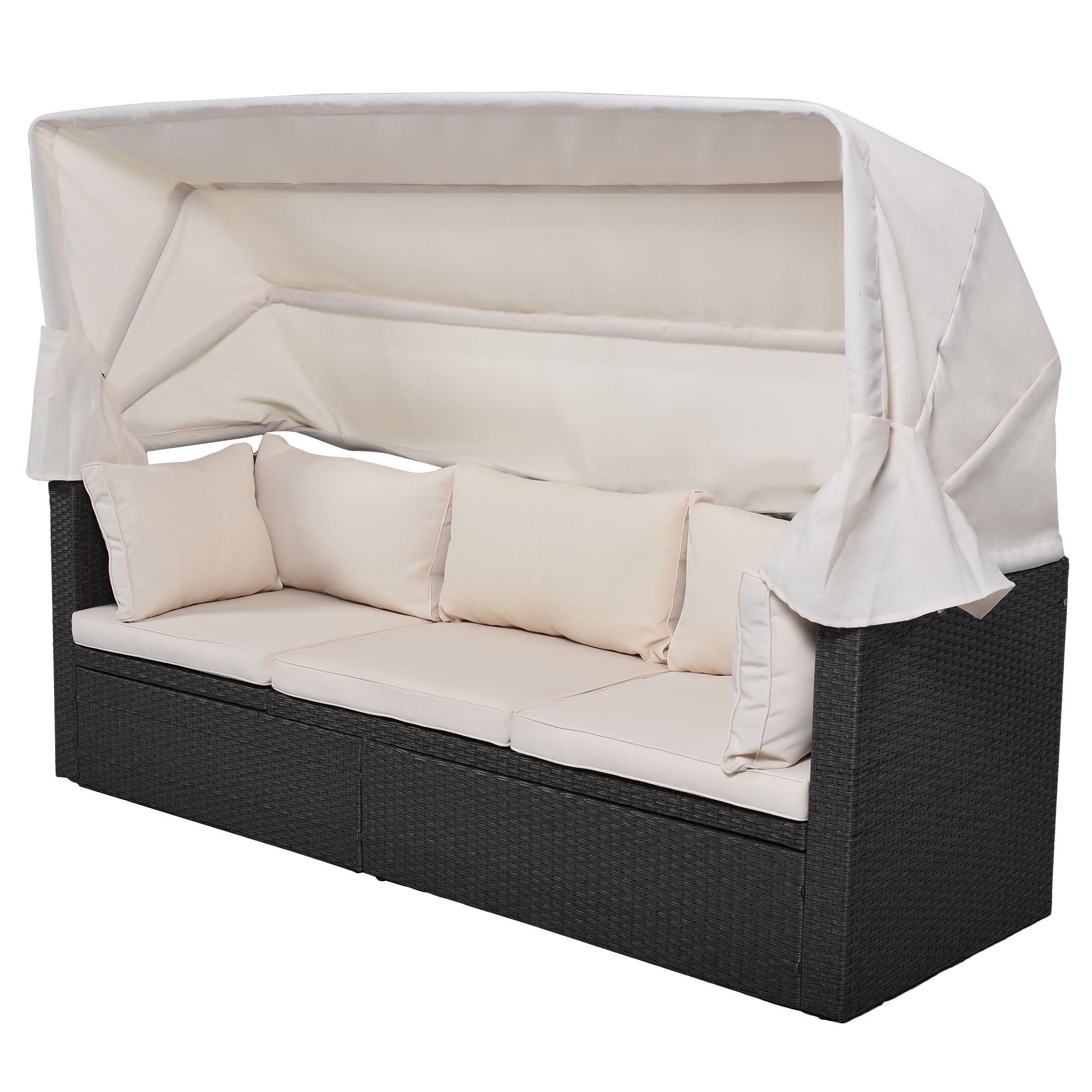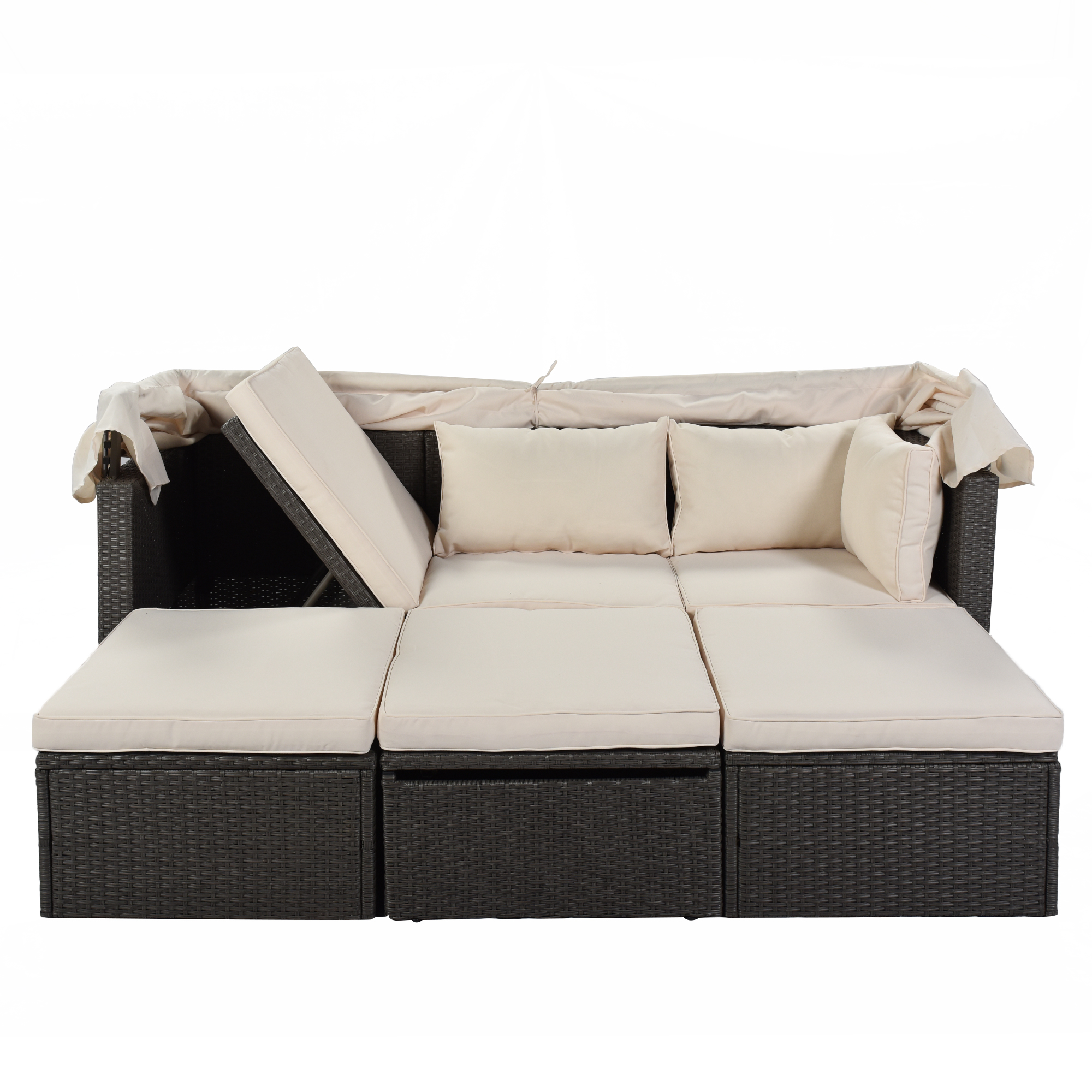 - The seating capacity of this set with retractable canopy capacity can be 6 if you separate every single part, while when you combine them, you will get a rectangle sunbed, enjoying your sunshine.