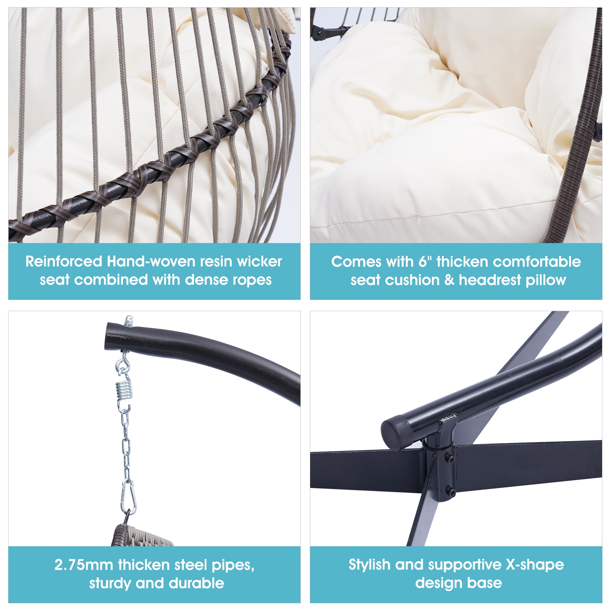 【Sturdy & Safety】The whole frame is made of Powder coated metal,and the frame and seat surface of the Egg Chair are made of rattan resin wickers wound around.As 2.75mm thicken steel pipes hold up the swing seat,it's safe enough to accommodate an adult to swing.Safety strap helps keep the chair safely in place while getting in and out of the chair.