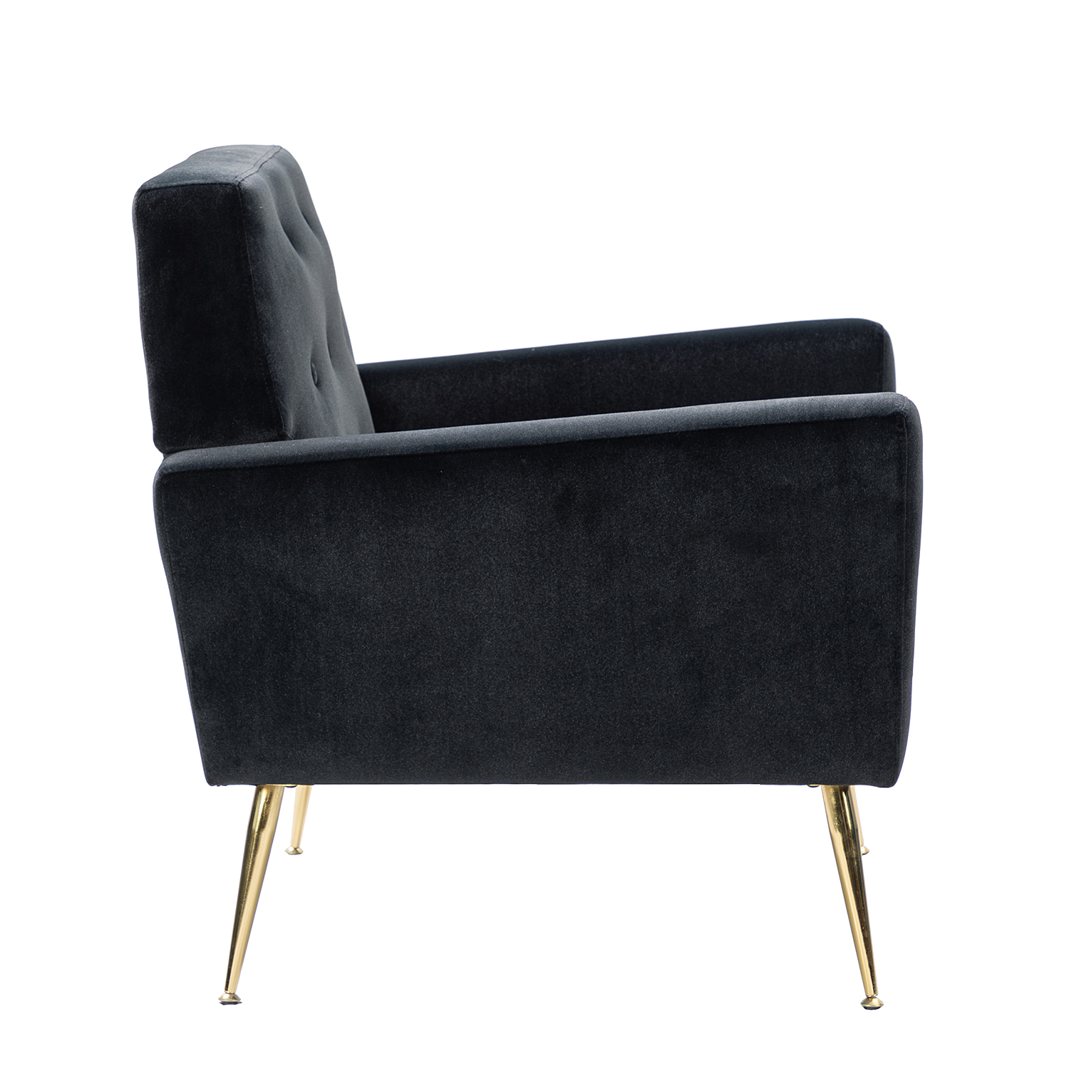 The perfect contemporary-look piece to complete your home decor with its vivid color palettes, this attractive solid and manufactured wood frame armchair has it all: style, comfort, and durability. With slender polished golden metal legs and a unique geometrical-shaped back design, this modern work of art boasts a charming sharp silhouette and showcases an approachable aesthetic while the button-tufted backrest and seatrest adds a touch of elegance to it. Built-in s-spring with medium-density foam filling are upholstered in a skin-touch-friendly velvet fabric that gives you a sense of comfort and is suitable for all kinds of living room decoration. Incorporating the modern and classic style perfectly in a gentle appeal, this accent armchair offers wonderful enjoyment as you curl up with a cup of chamomile or relax with your latest read. It's the perfect pick for the living room, office room, and bedroom.