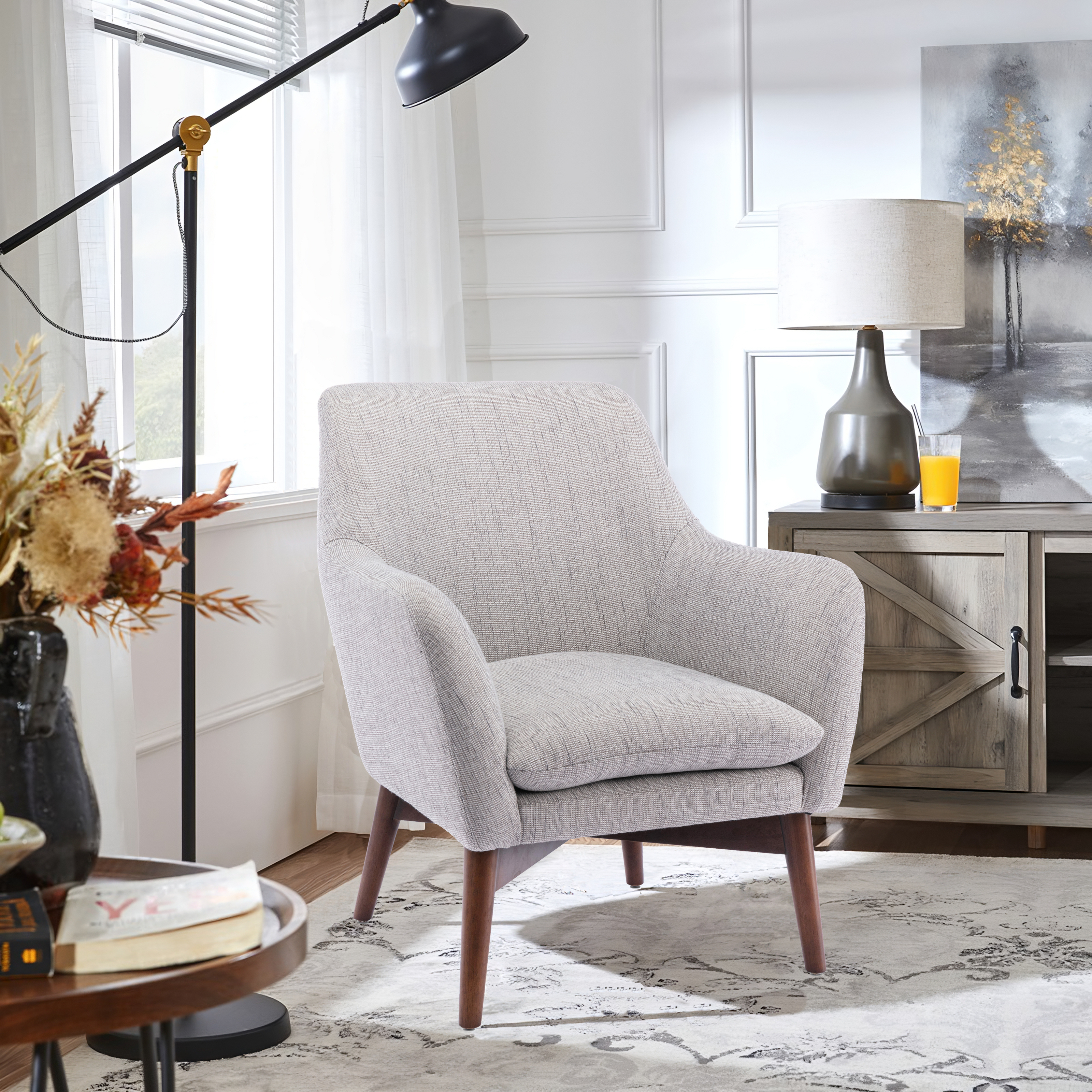 Update your living room with the Parkton mid-century accent chair. Upholstered in a performance fabric, the Parkton accent chair is effortless to clean for when life happens. The generous-sized silhouette is comfy and features a pillow seat, rounded back, and softly curved arms. Modeled in mid-century style, the solid wood legs, and X-style wood base offer styling and long-lasting durability.