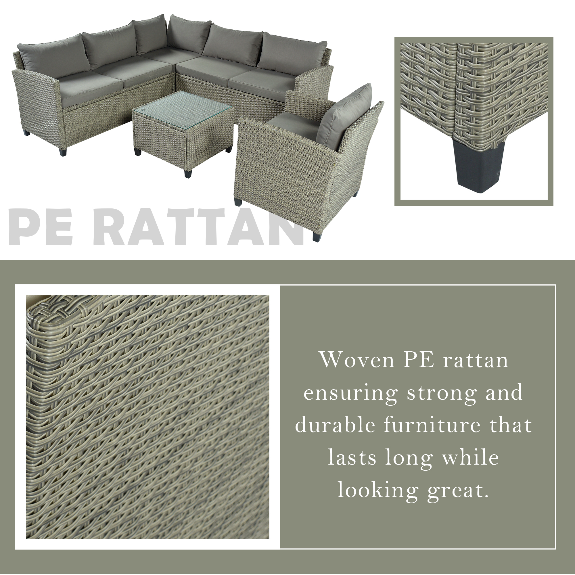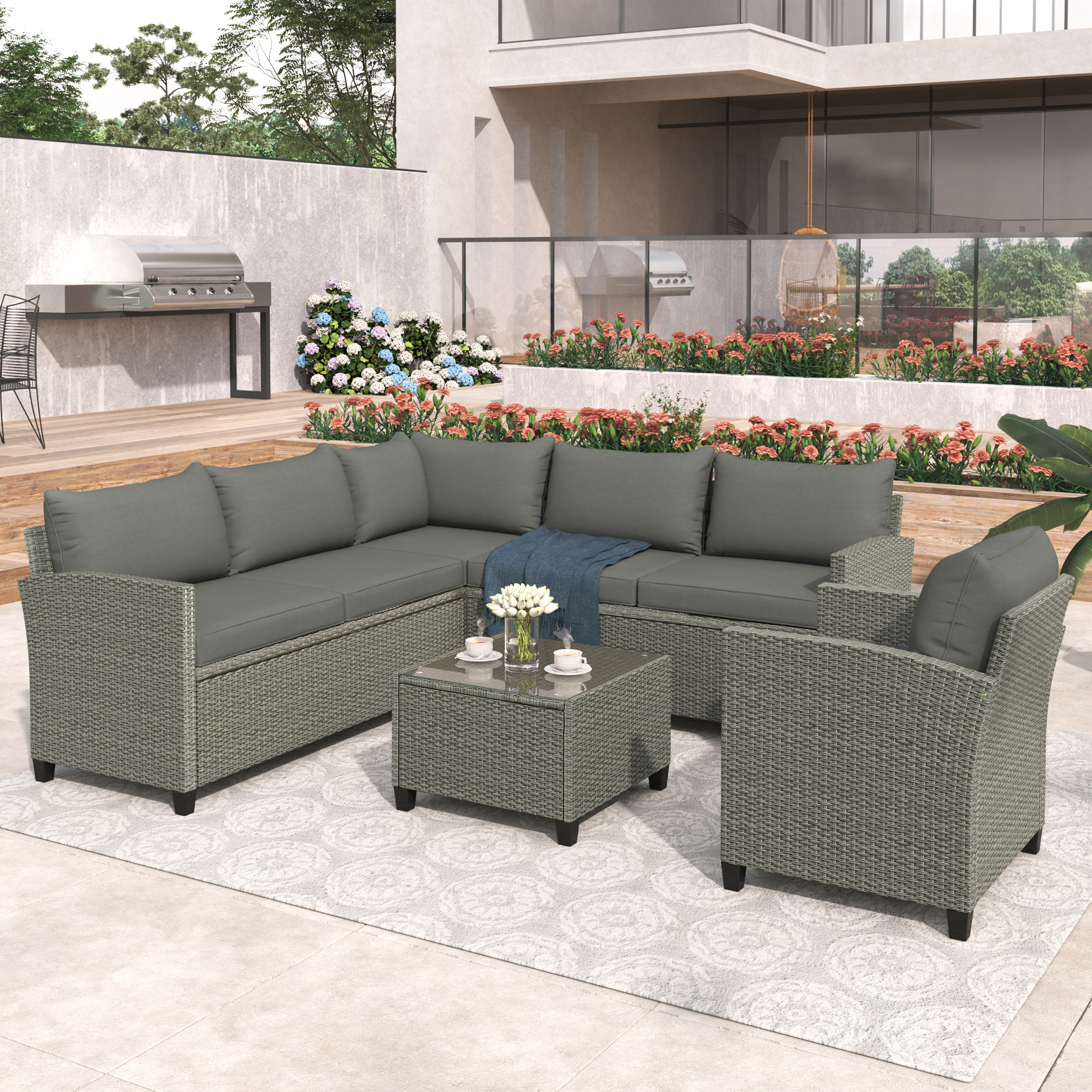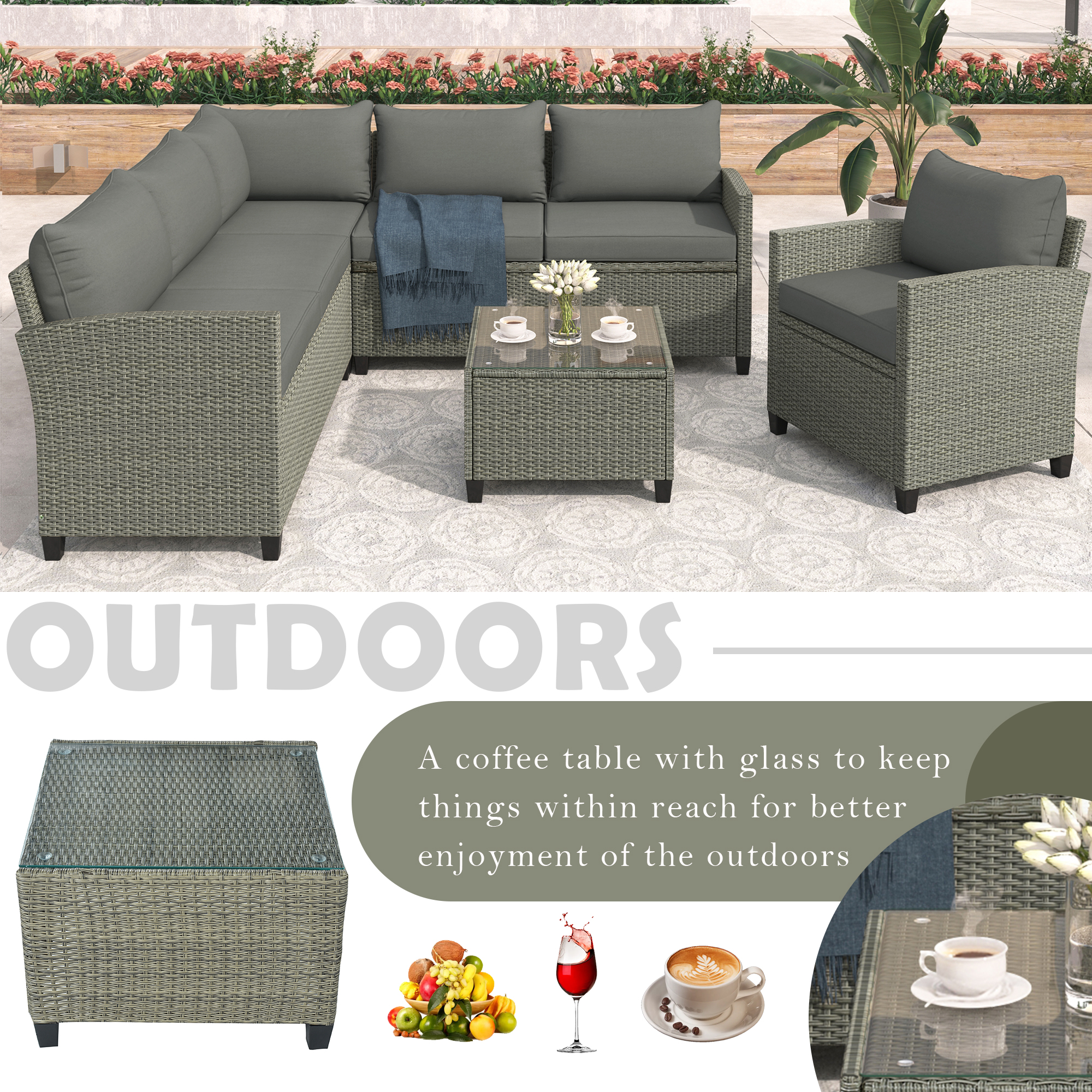 This 5-Piece Wicker Patio Set is meticulously designed to let you enjoy life outdoors. The rattan-made set is the best choice for your patio, porch, poolside, or garden. Complete with soft bottom and rear cushion seating, a lounge for hours on end in comfort. Crafted from weatherproof resin wicker, the steel frame makes this product more durable. Enjoy beautiful summer days with this sectional patio set.