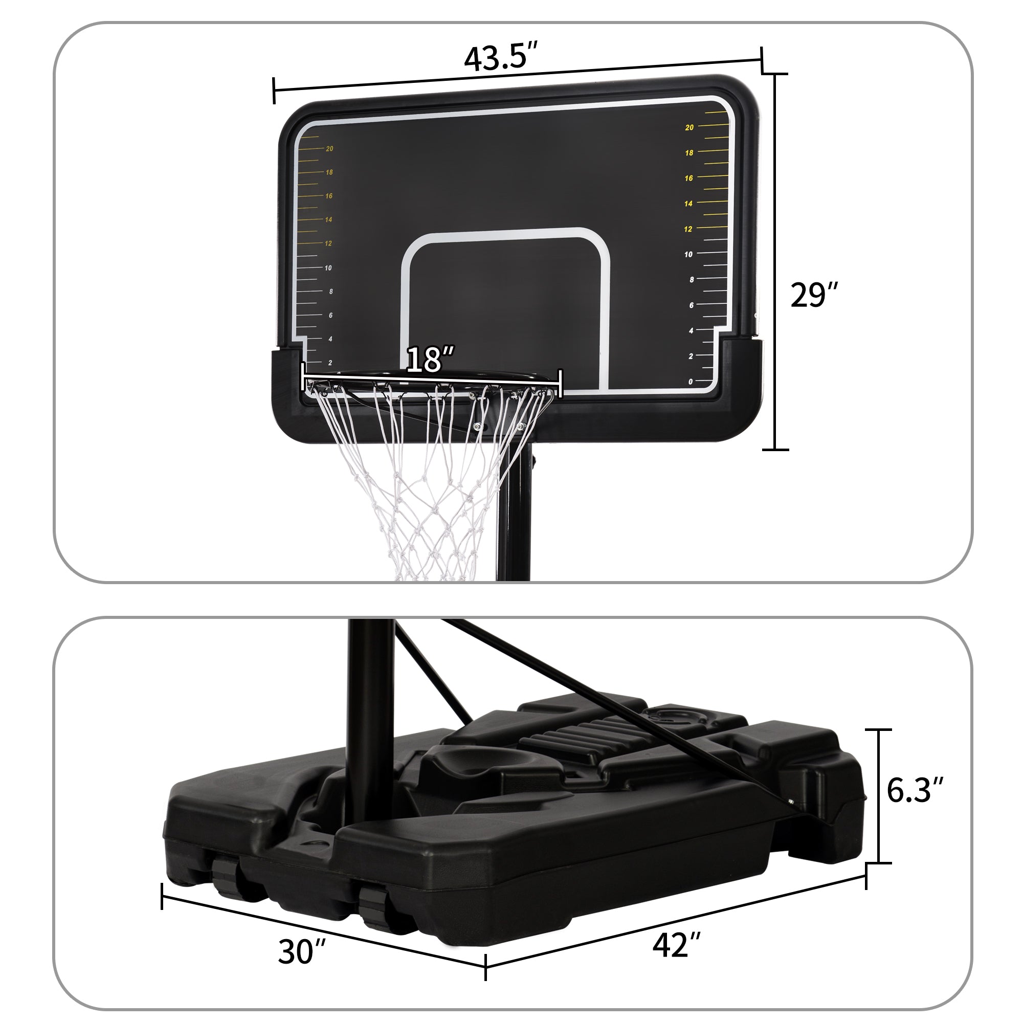 The 44-inch backboard made of one-piece PE material is designed in black and marked with a clear height scale. You can have a clear reach jumping goal to complete your bounce training.