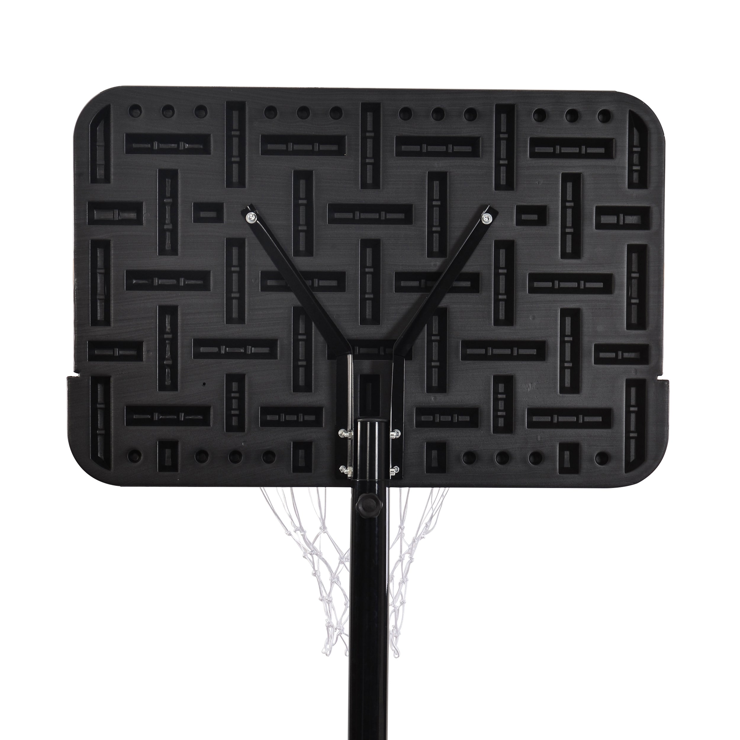 The Three-piece steel pole can be easily adjusted and the hoop height ranges from 6.6ft. to 10ft. in 6'' increments.