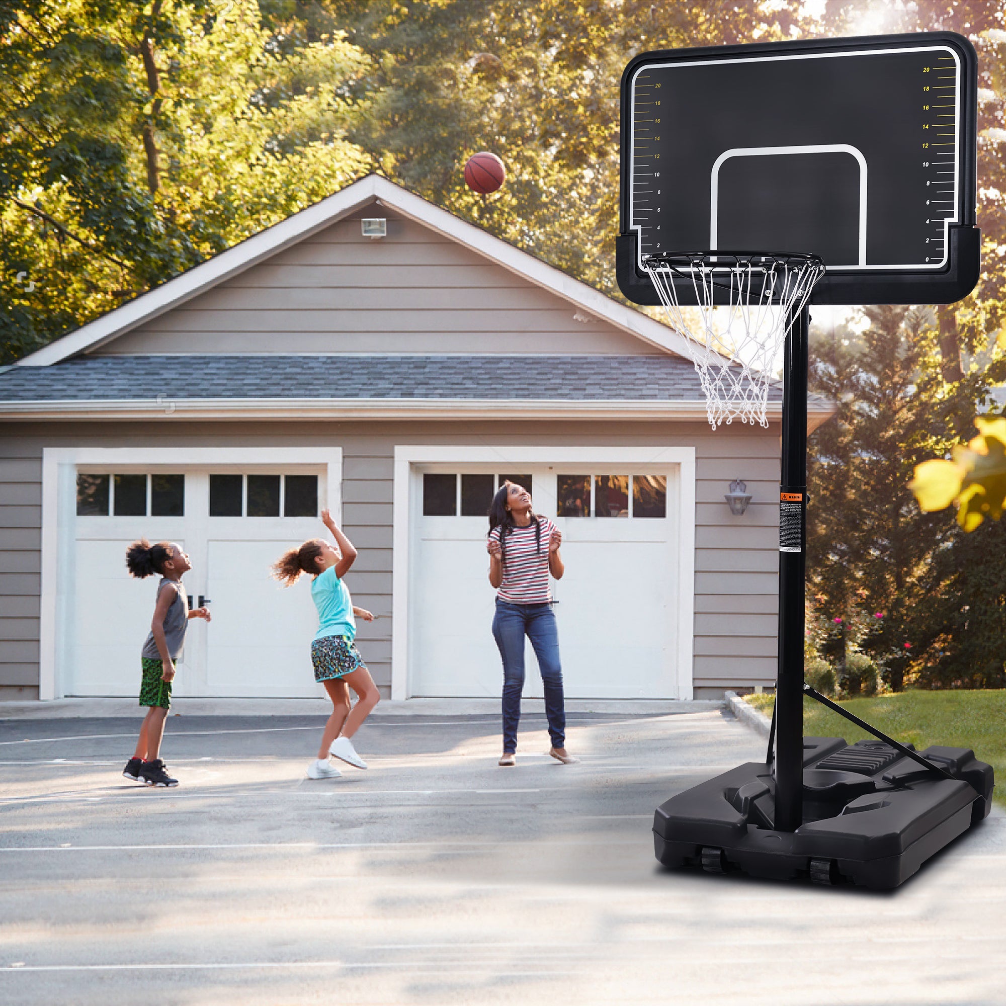 The tripod designed base can be filled with 21 gallons water or 220 lbs sand for stability as you practice your shots. While the 2 built-in wheels under the base ensure the portability of the basketball hoop, so you can play indoor or outdoor anytime.