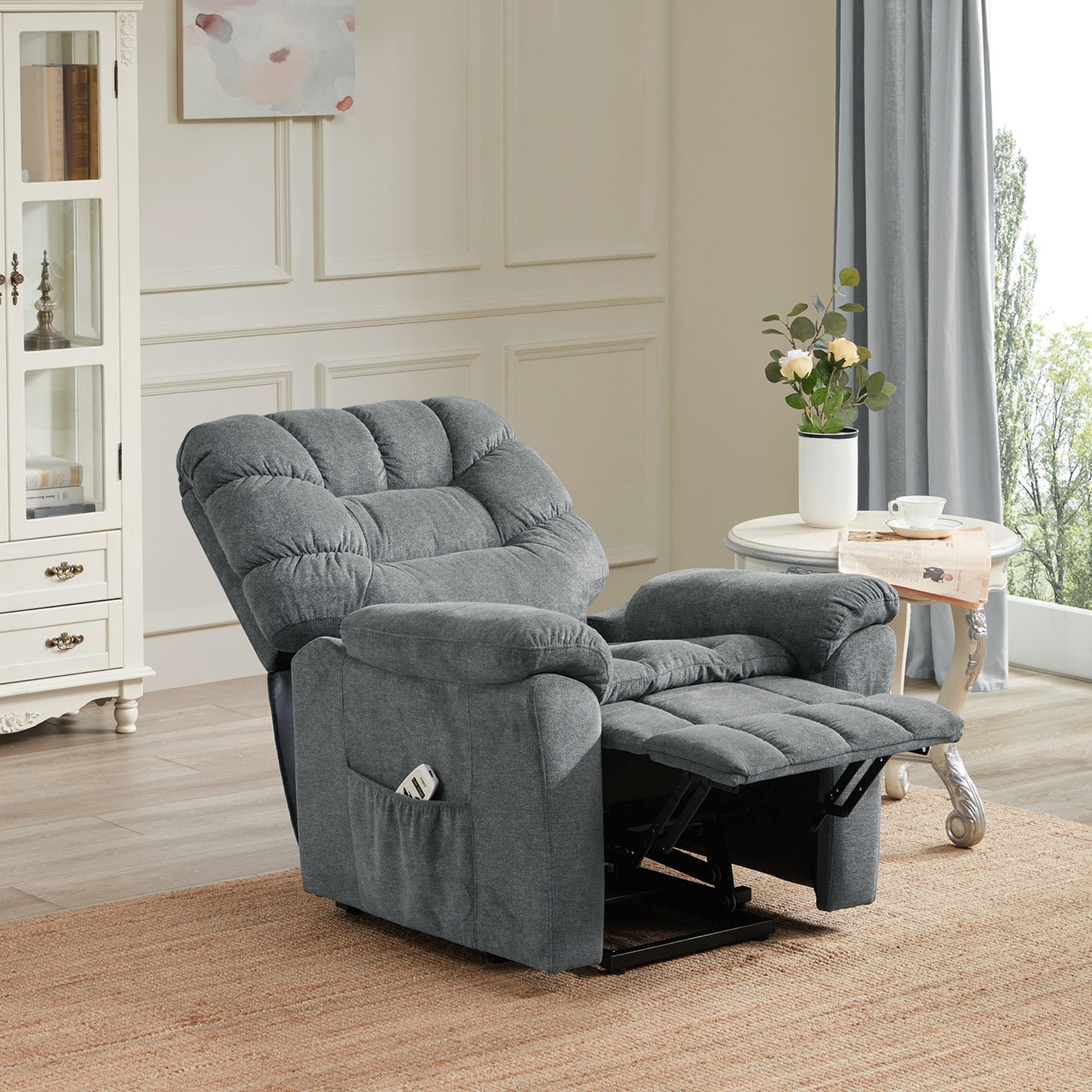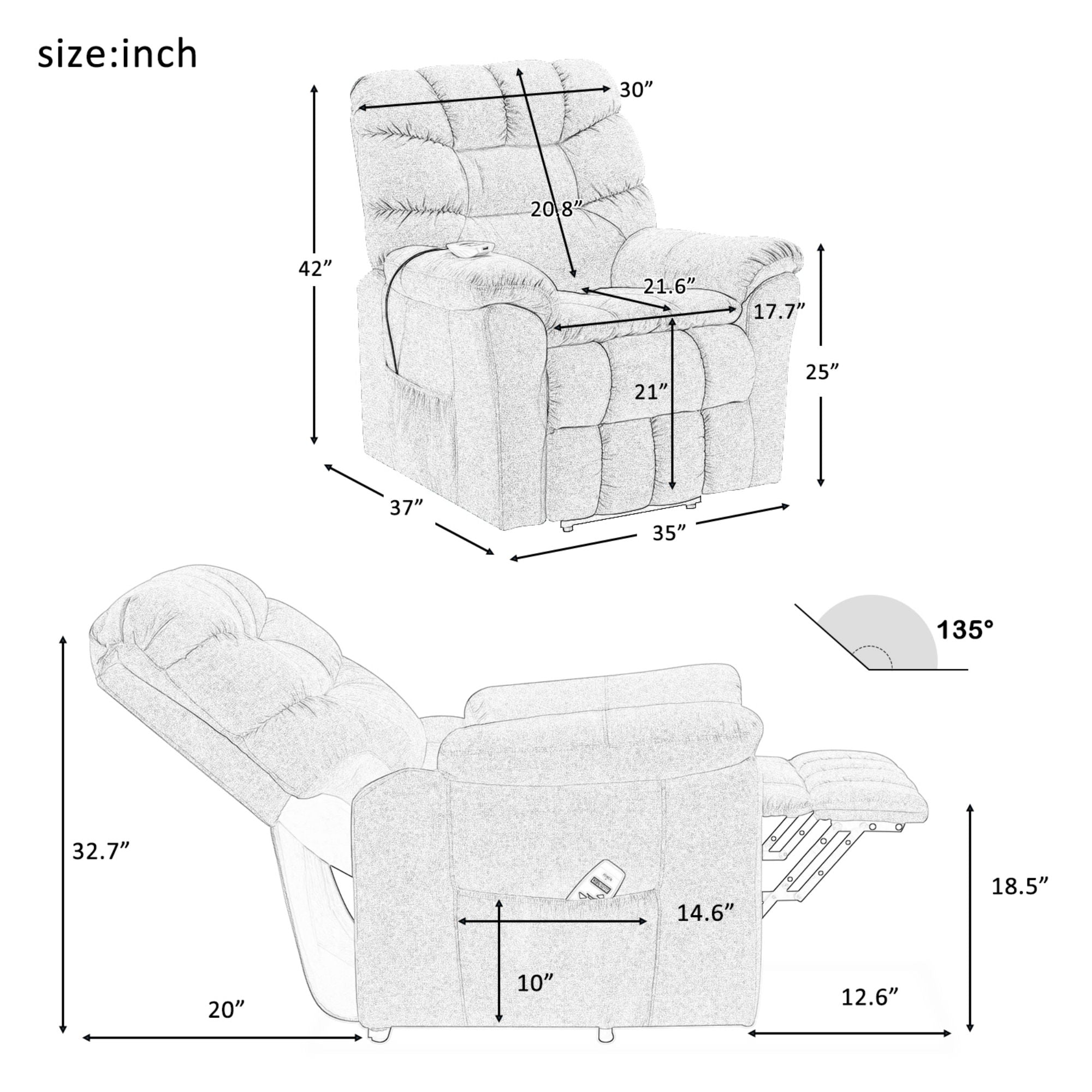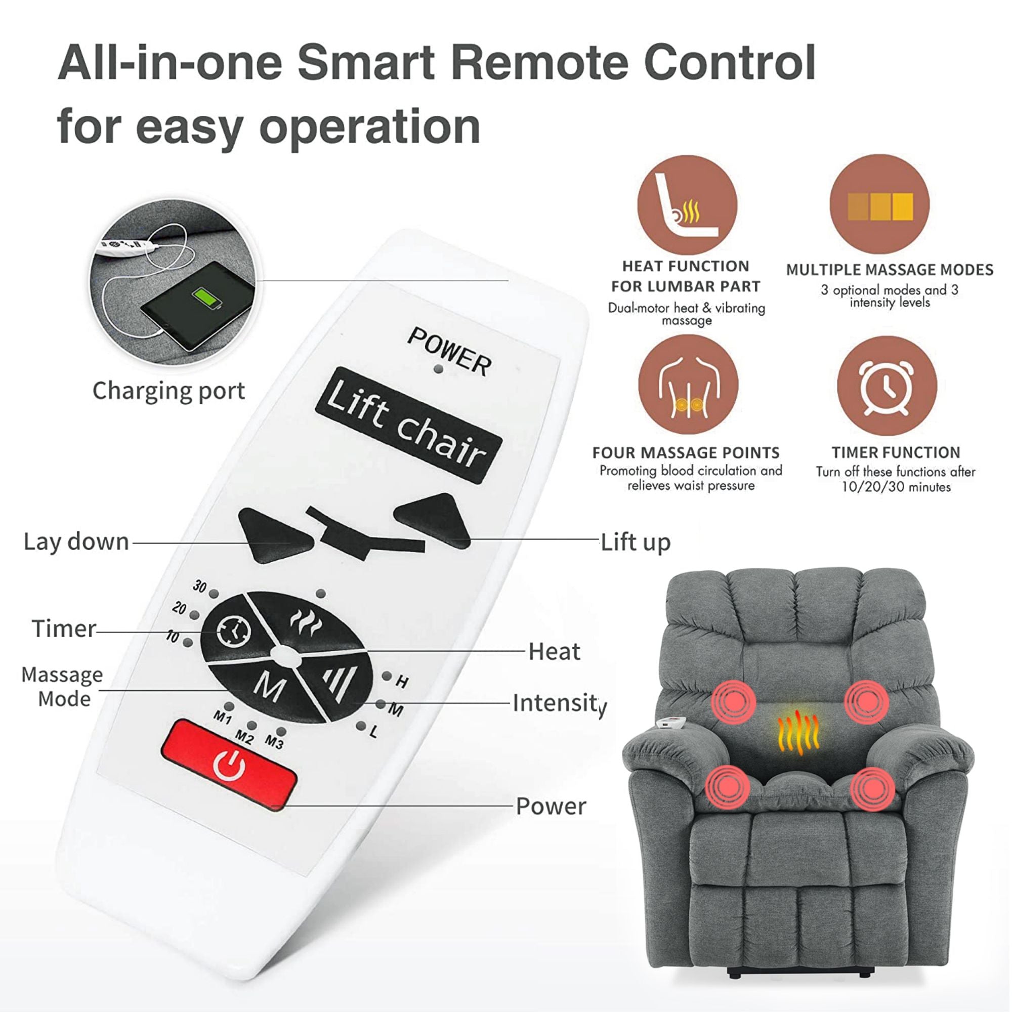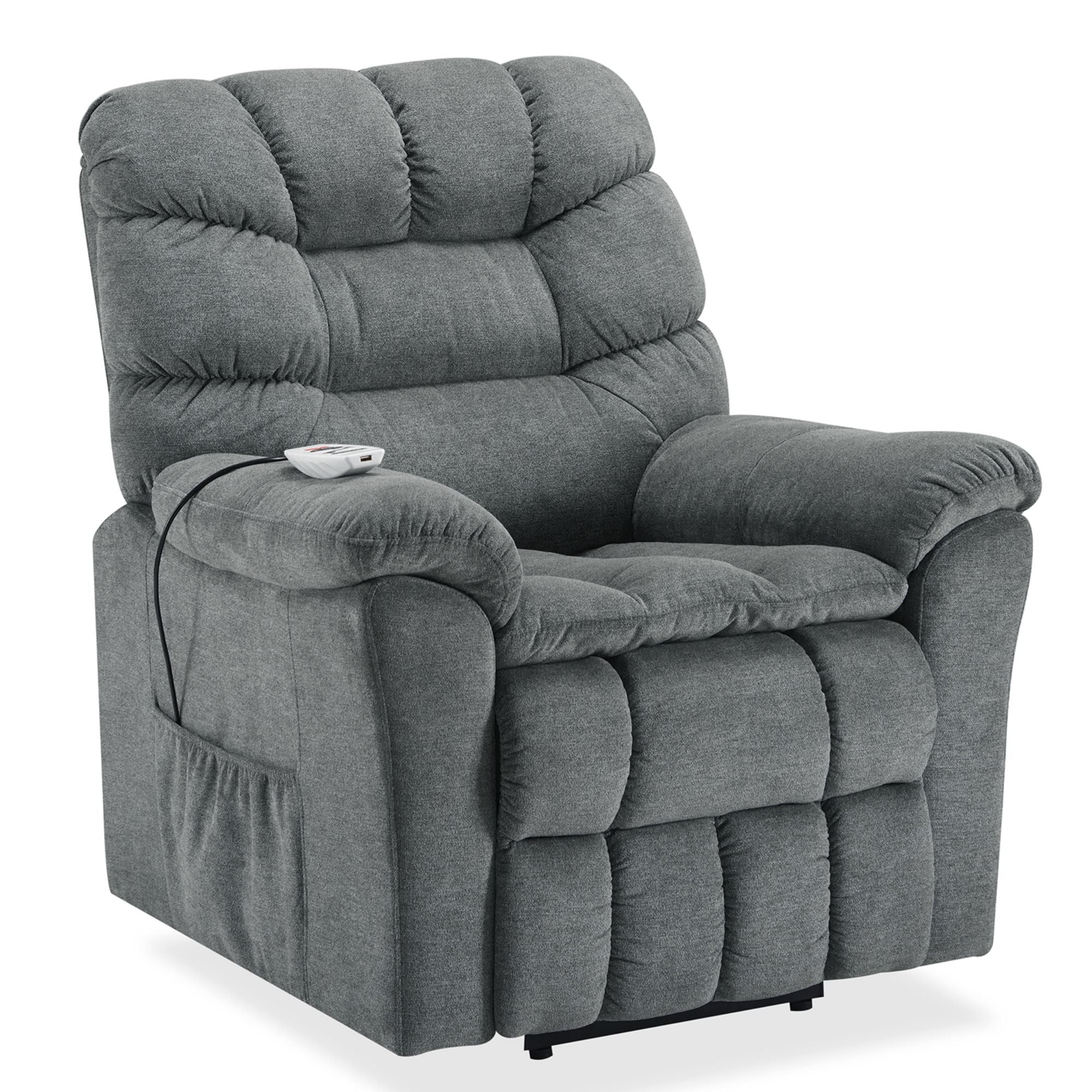 Remote Controller with USB Charging Port: All-in-one remote design makes it easy to operate the chair. USB port on the top of the remote control for daily electronic products charging (Notes: The USB ports only for low-power devices, such as iPhone, iPad.) Side pocket design to keep small items within reach such as books, magazines, tablet, etc.