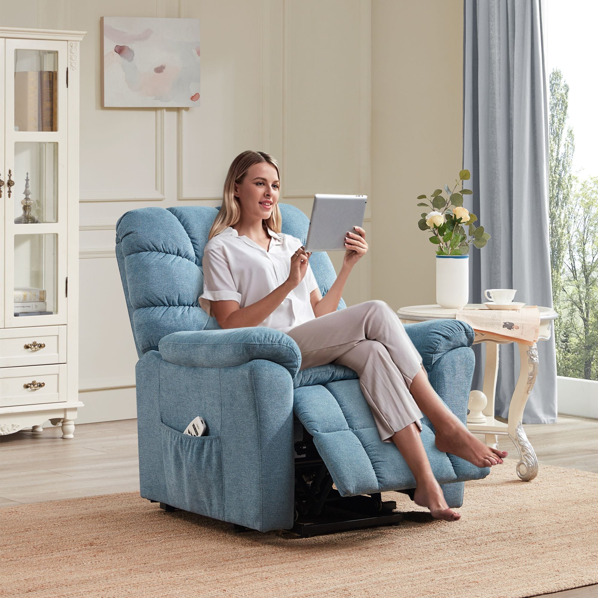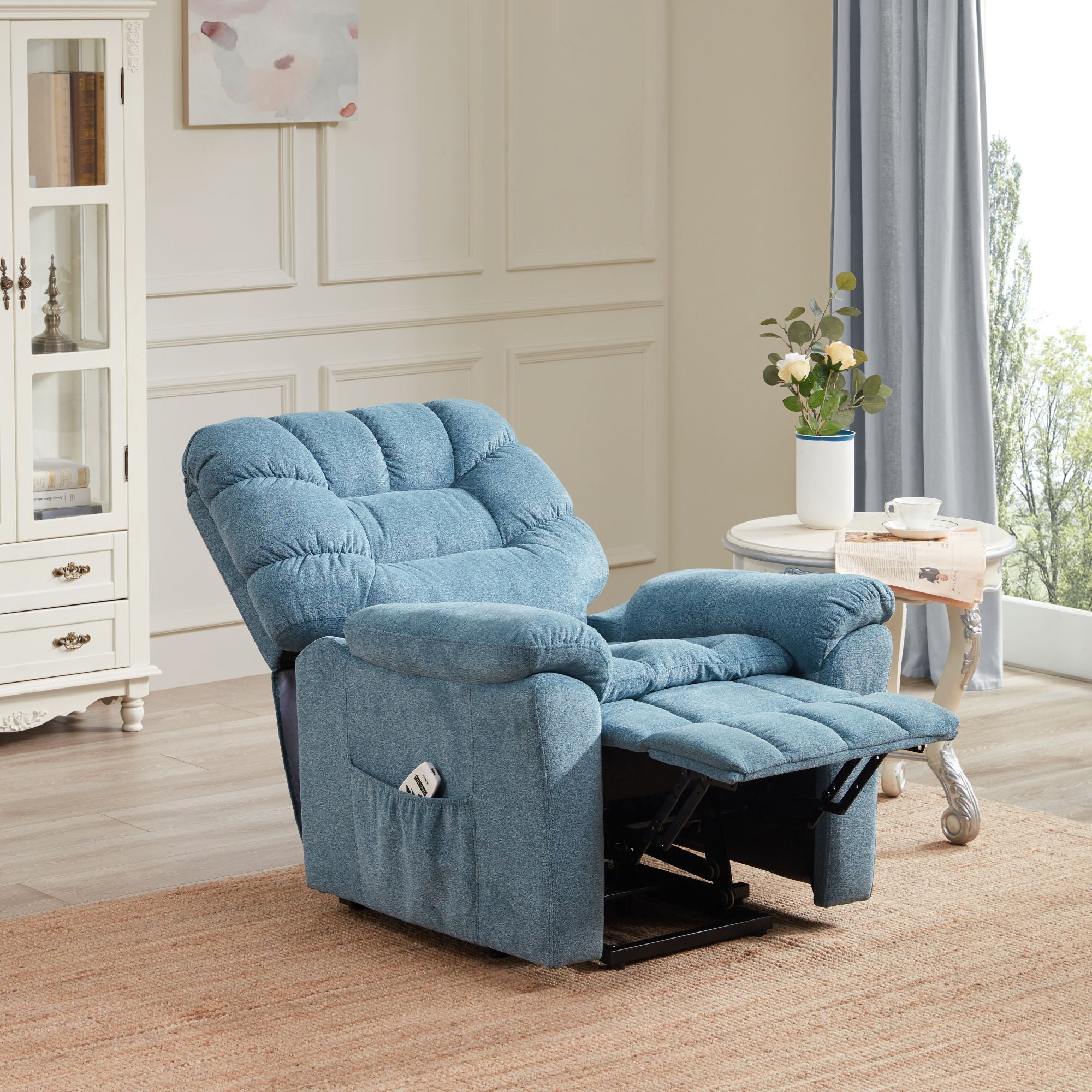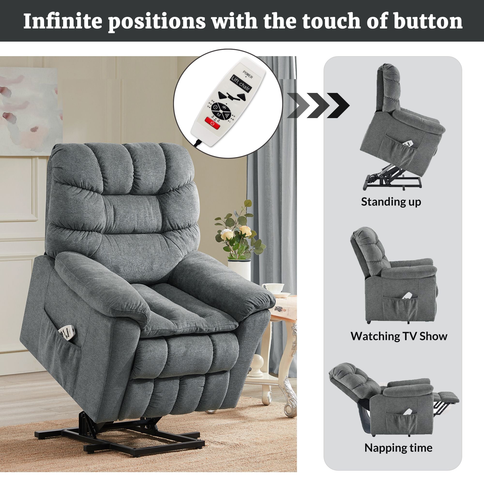 Power Lift Chair: Powered lift design with electric motor that could push the entire chair up to help the senior stand up easily, also ideal for persons who have difficulty getting out of a chair.