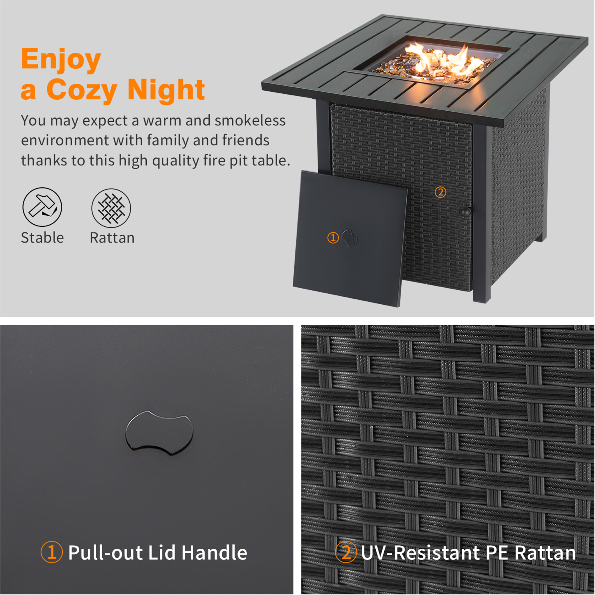 🔥 Delivery Includes: ① A quality gas fire table, which also serves as outdoor dining table, coffee table, or casual bar. ② A tabletop lid panel. ③ 6 lbs beautiful translucent fire glass beads.