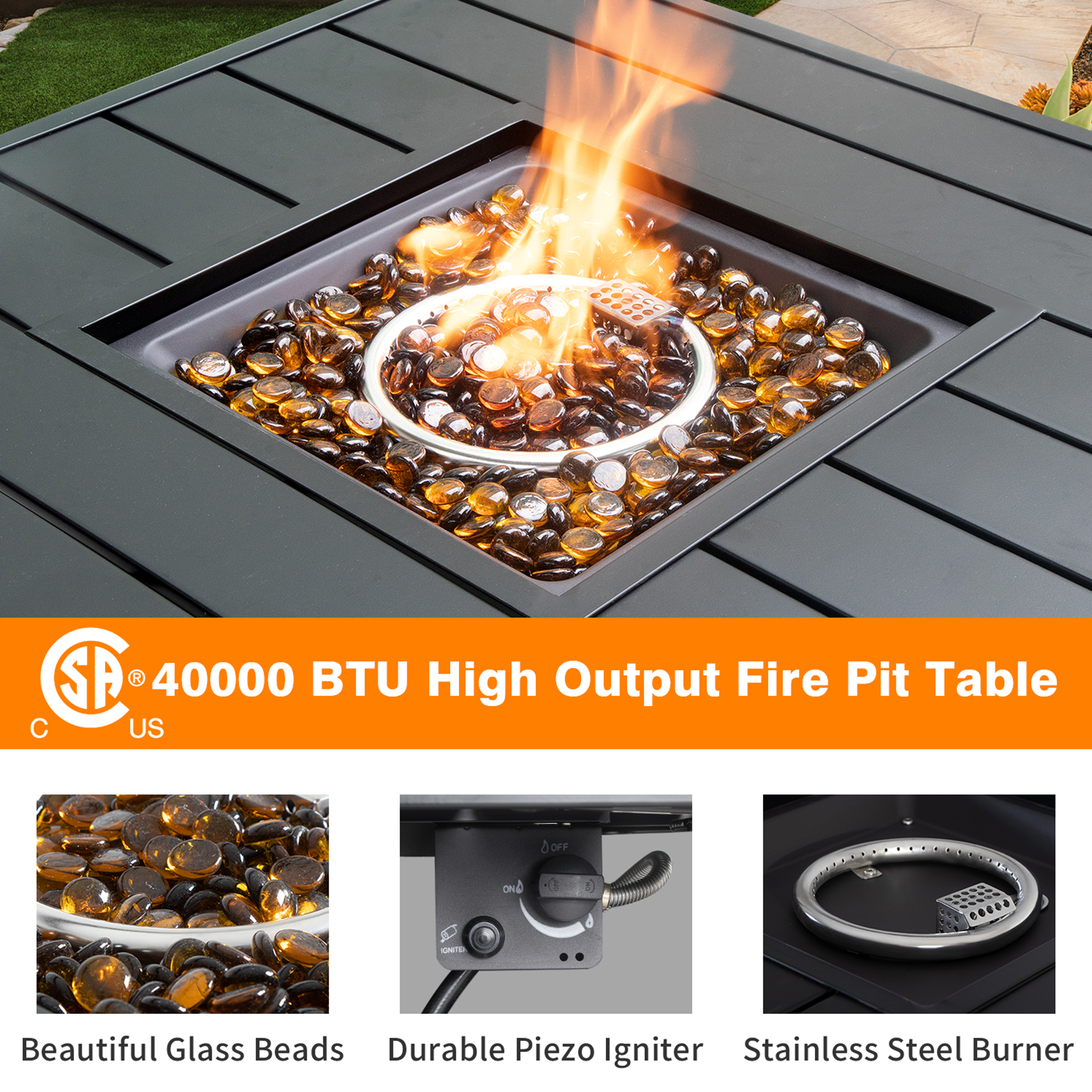 🔥 CSA-Approved Safe & Bonfire Table : You will never regret having this safe-to-use, CSA-certified propane fire pit at your backyard. The 40000 BTU output on the fire table will provide your family and friends with ample warmth and a romantic bonfire atmosphere while creating nearly green burning experience, so you will no longer suffer from ash and smog.