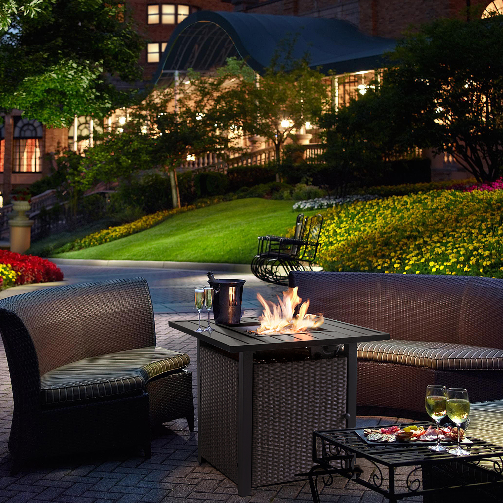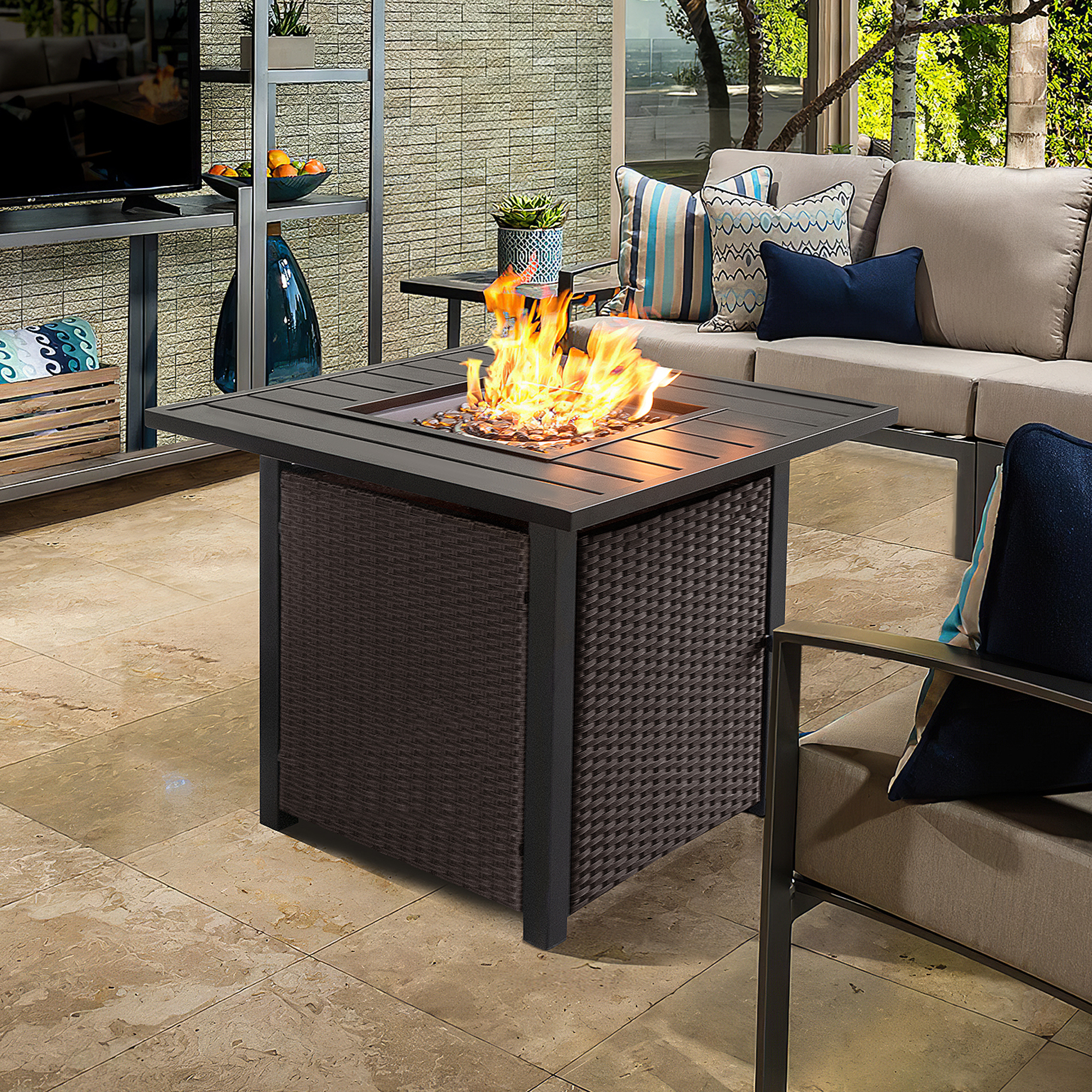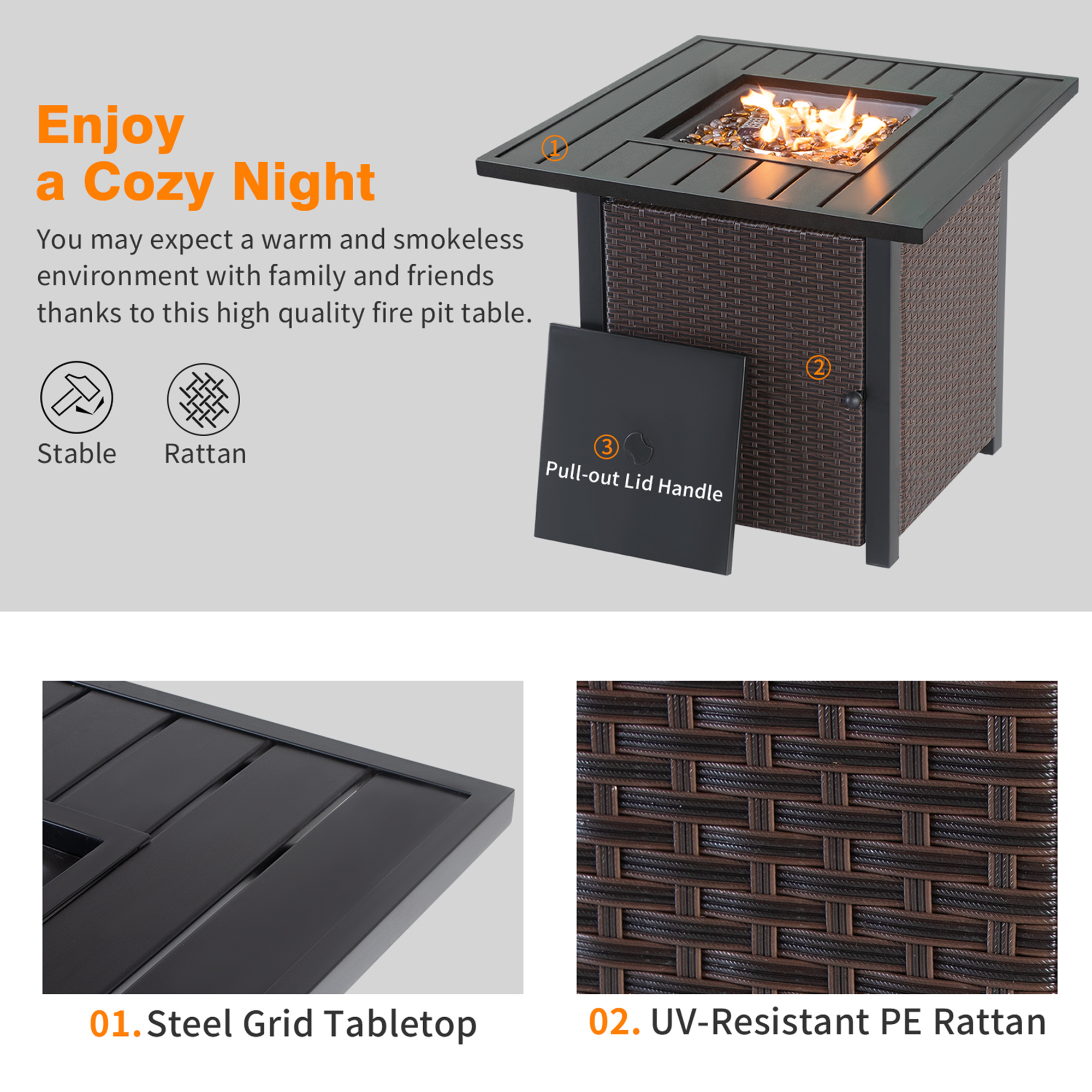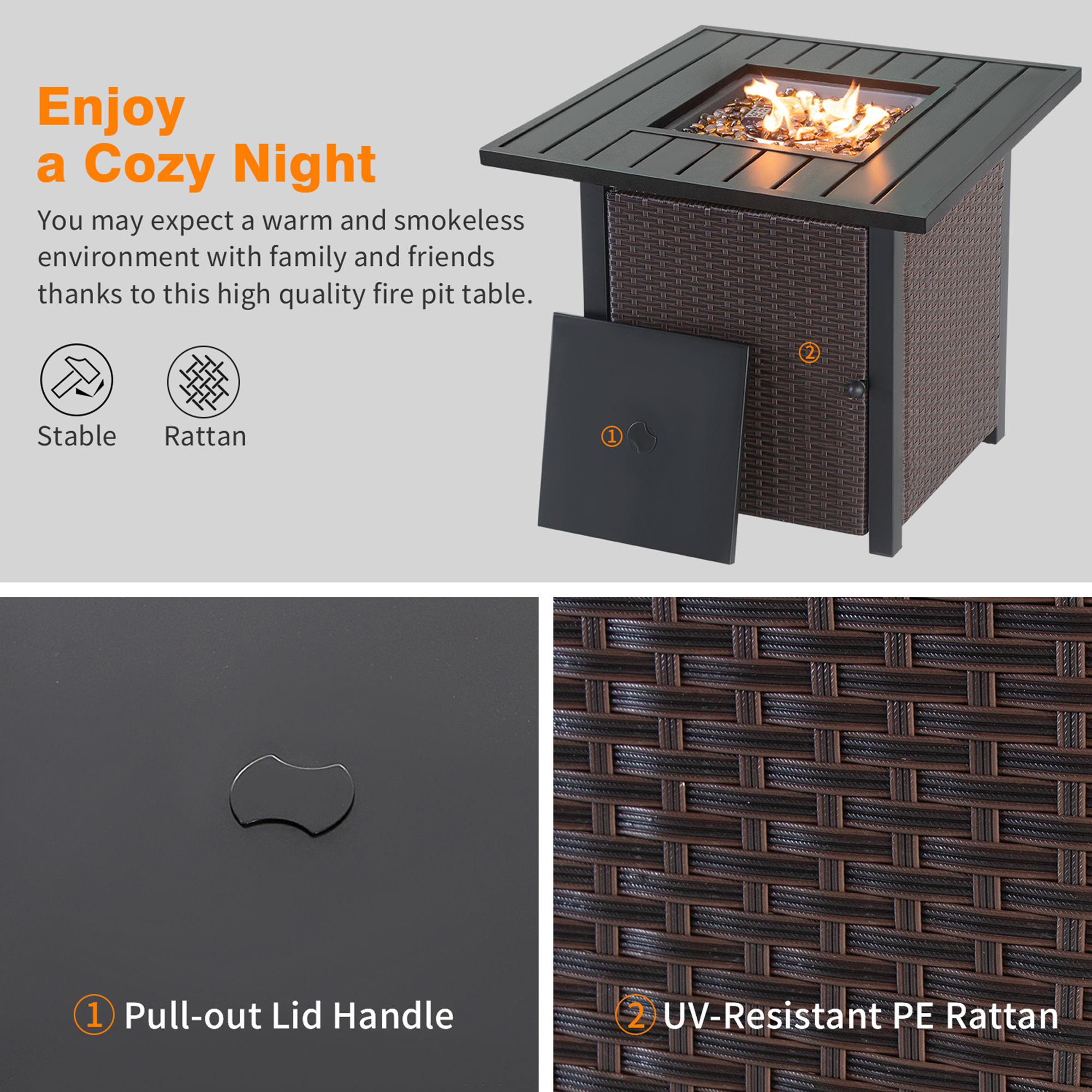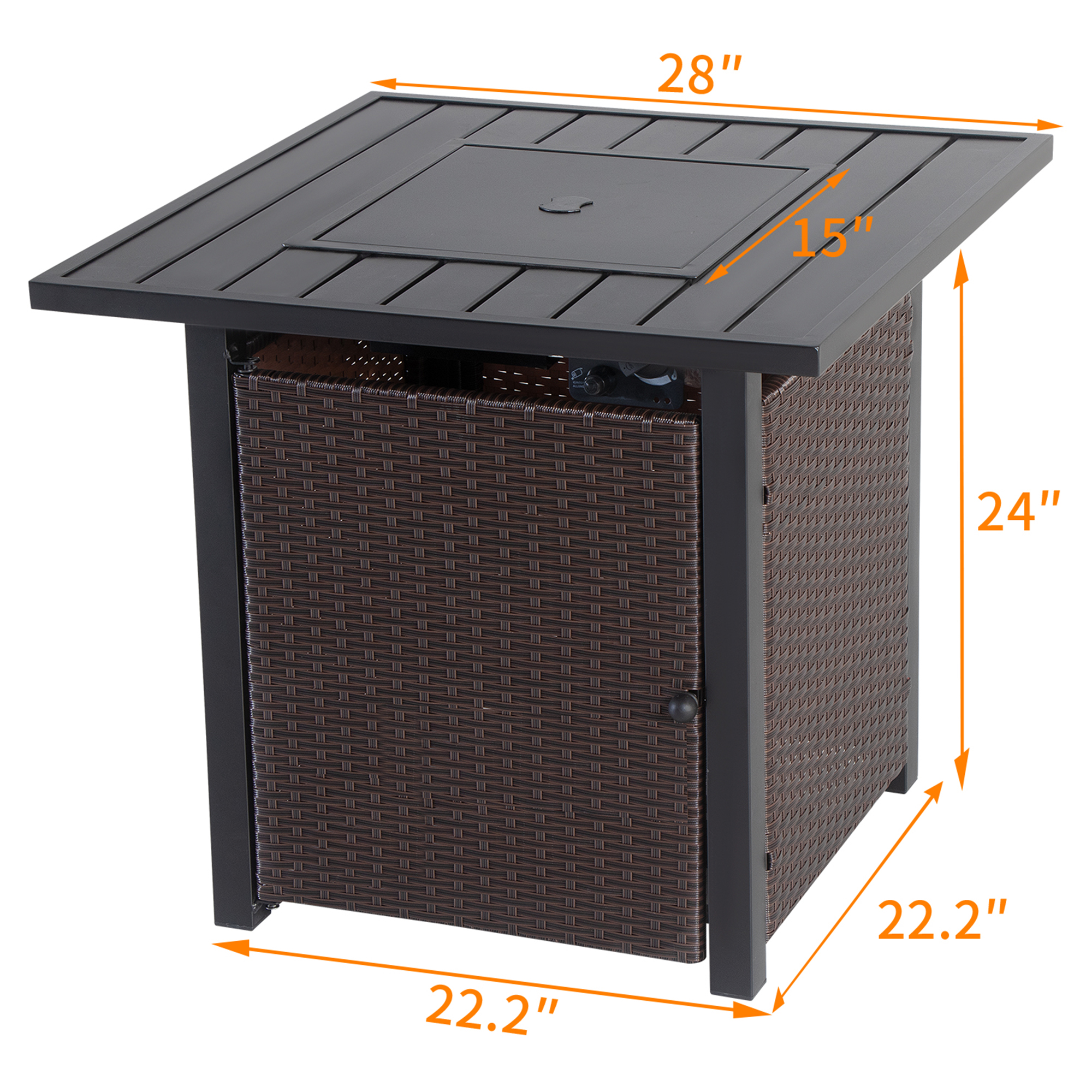 Propane Fire Pit Table Wicker 28in 40,000 BTU, Patio Outdoor LP Rattan Gas FirePit Steel Tabletop with Lid and Fire Glass Beads CSA Certified, Brown
