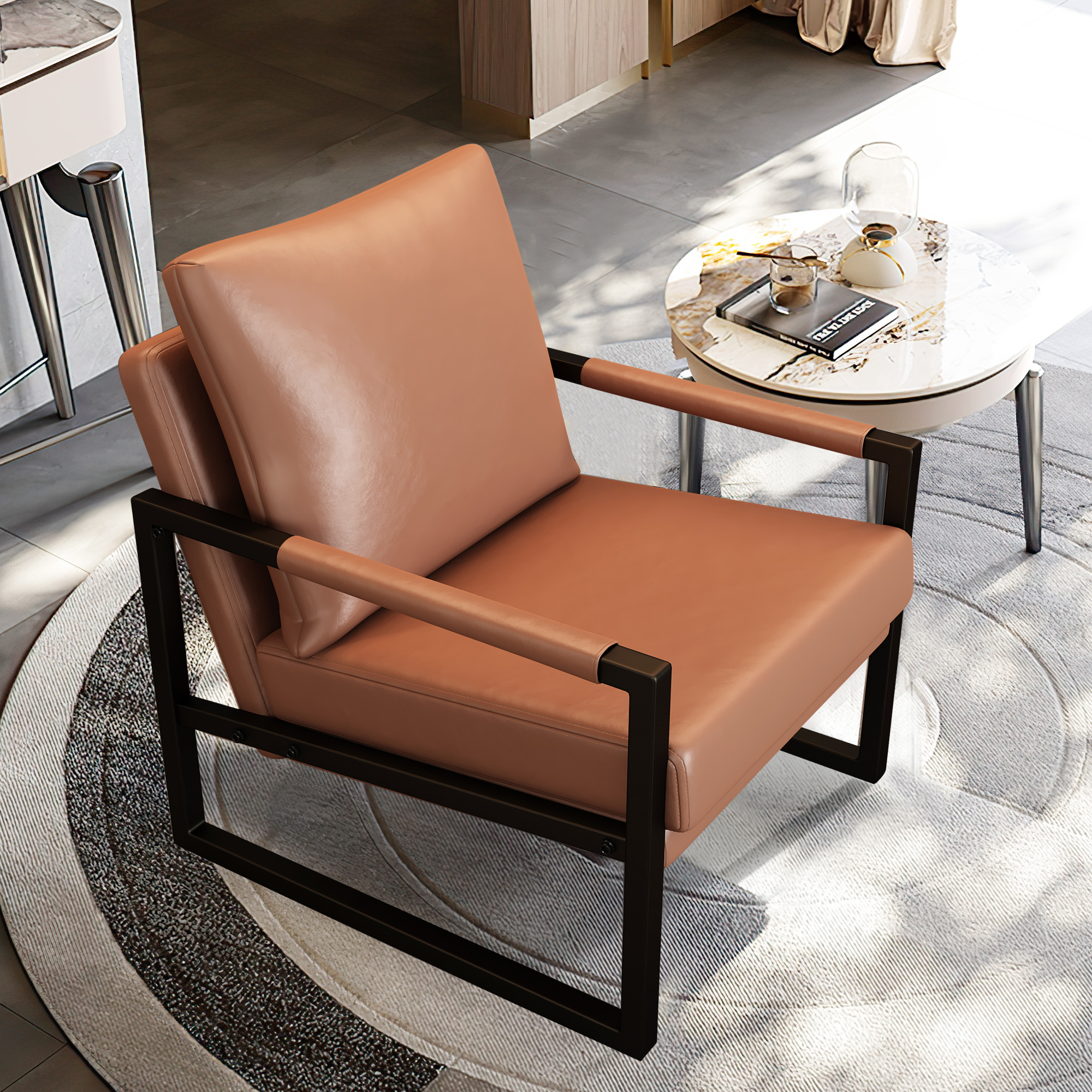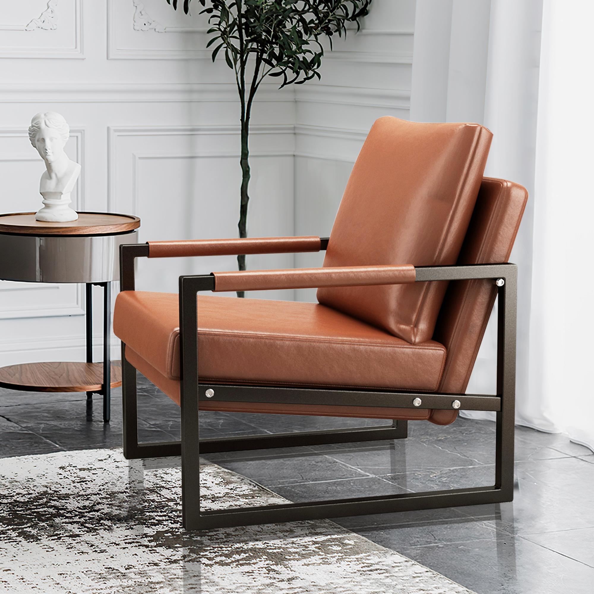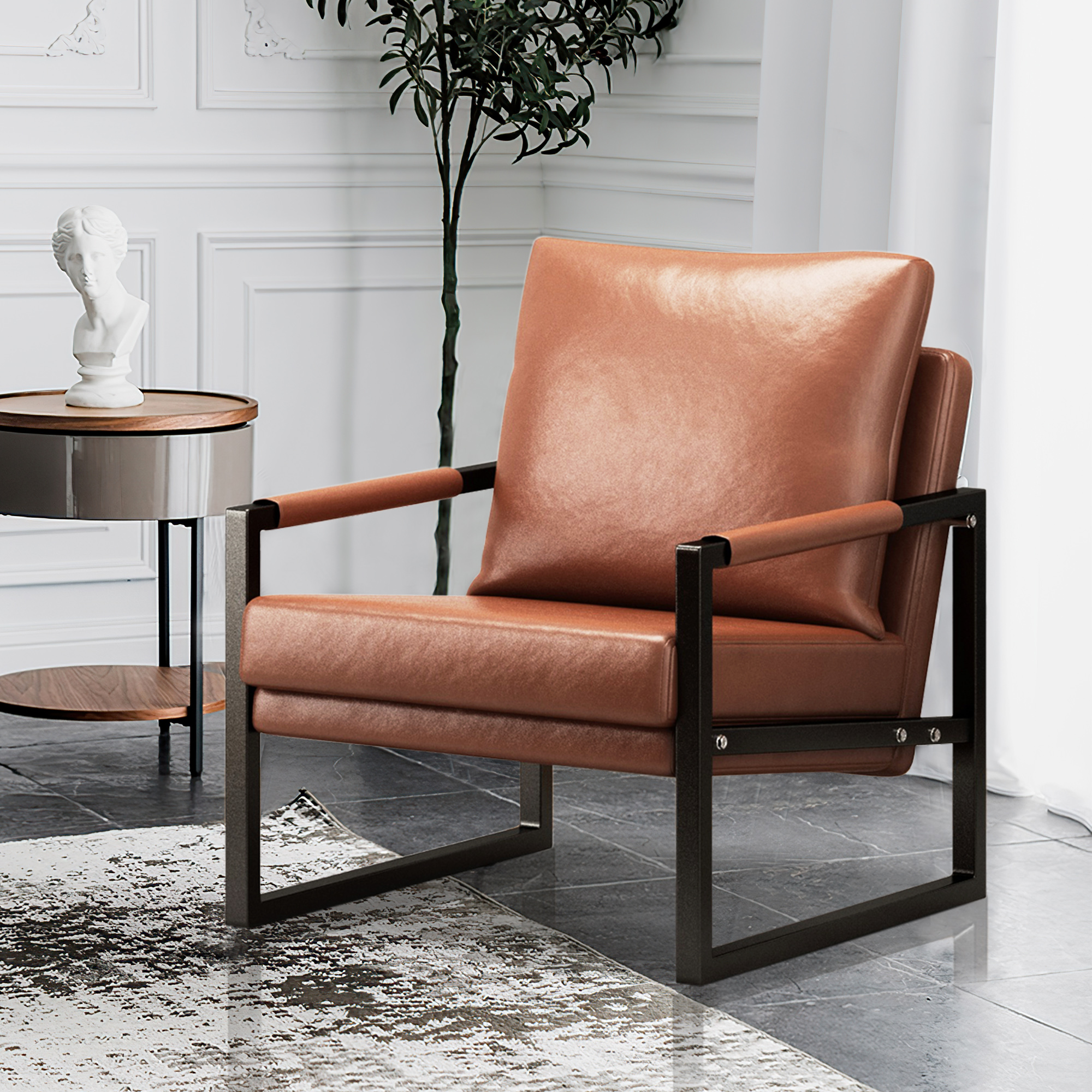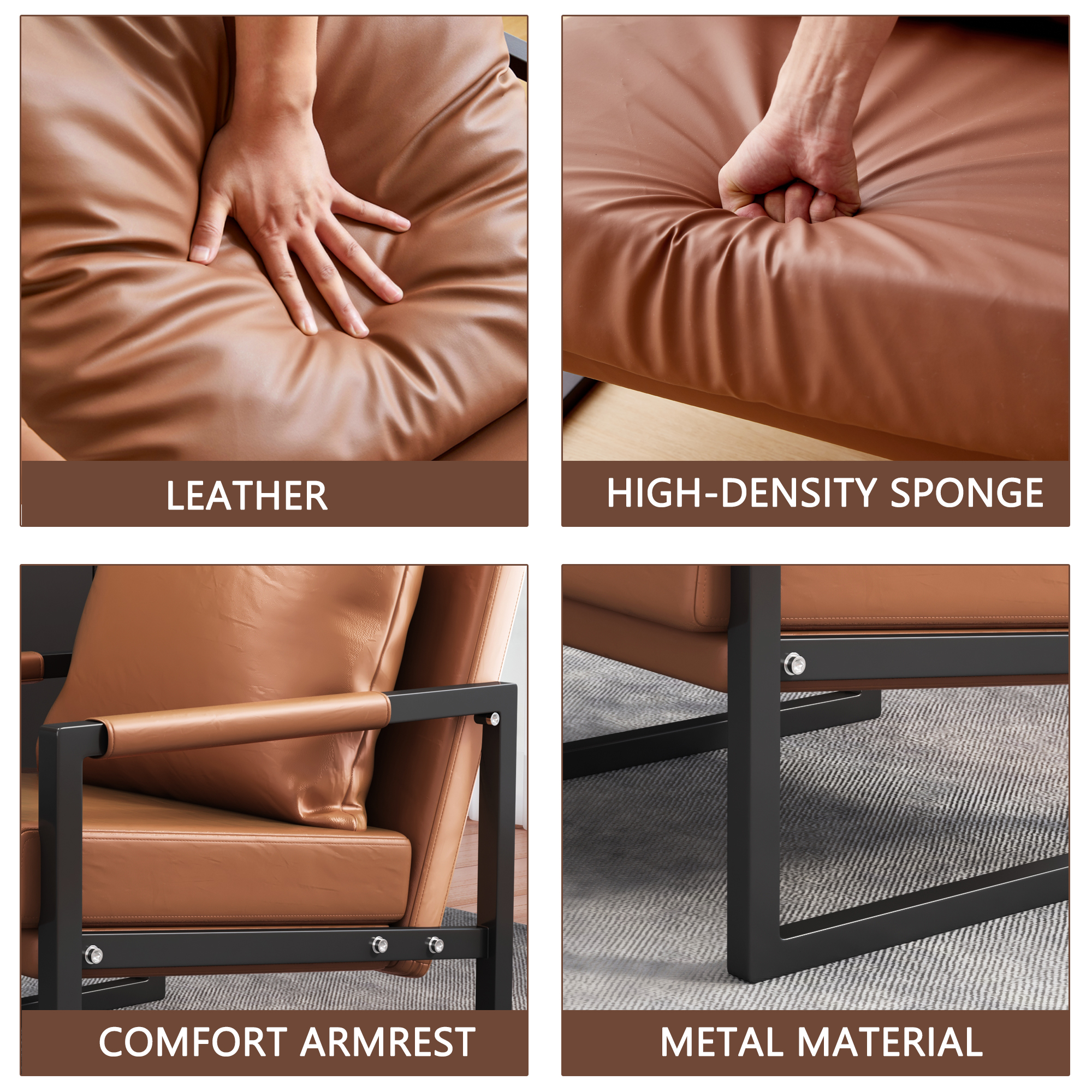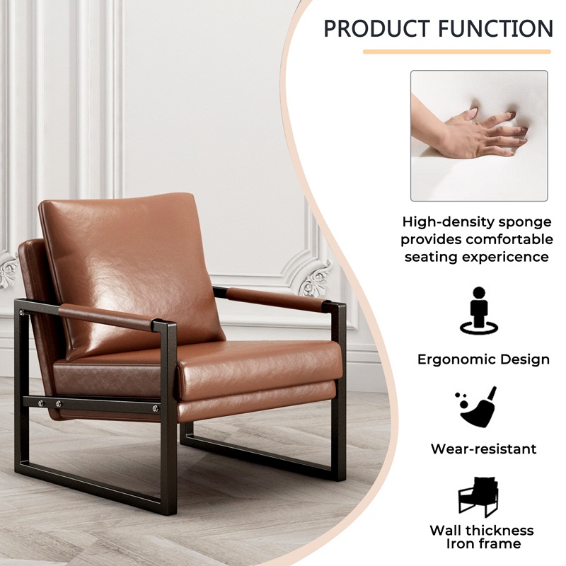 PU Leather Accent Arm Chair Mid Century Modern Upholstered Armchair with Metal Frame Extra-Thick Padded Backrest and Seat Cushion Sofa Chairs for Living Room ( Brown PU Leather + Metal Frame + Foam)