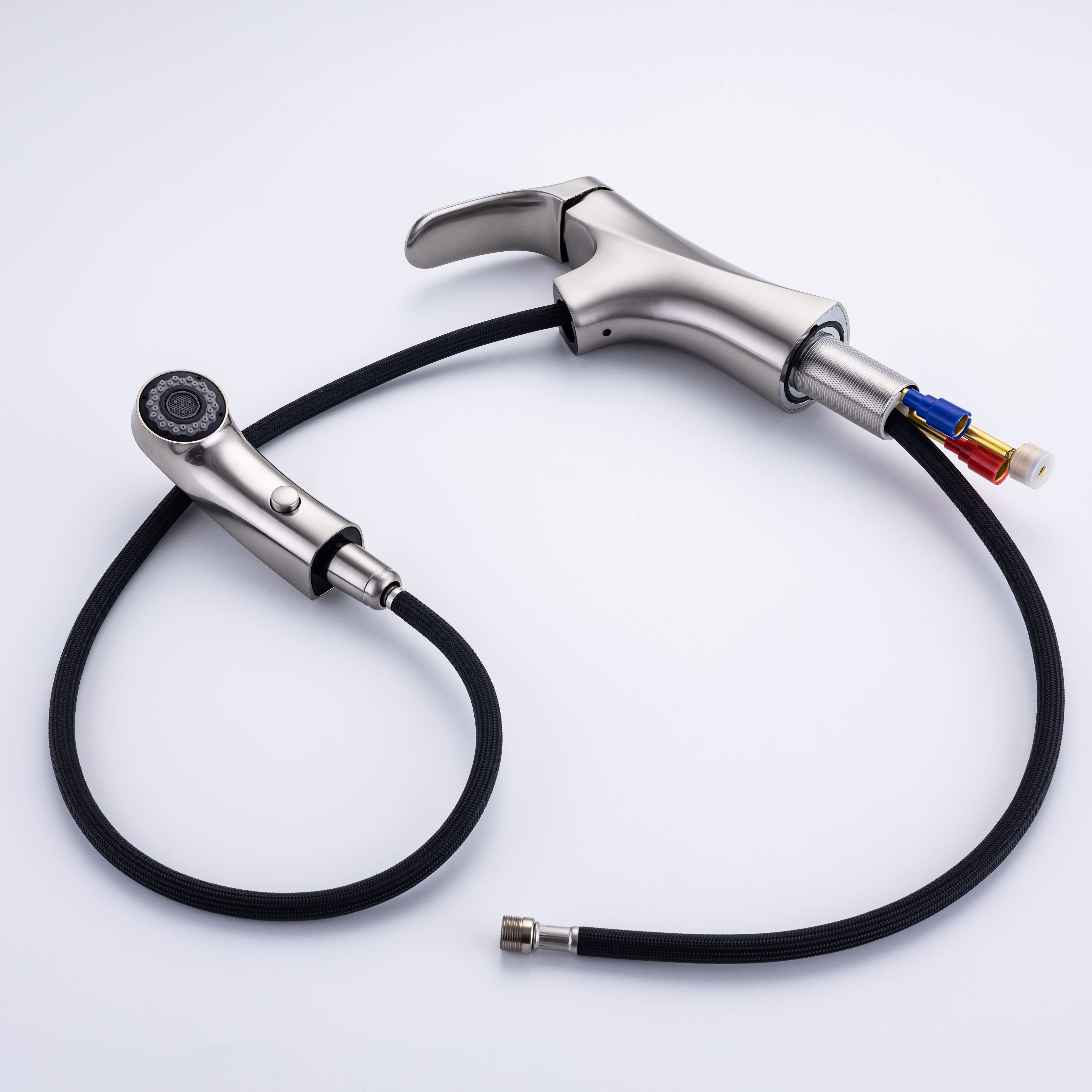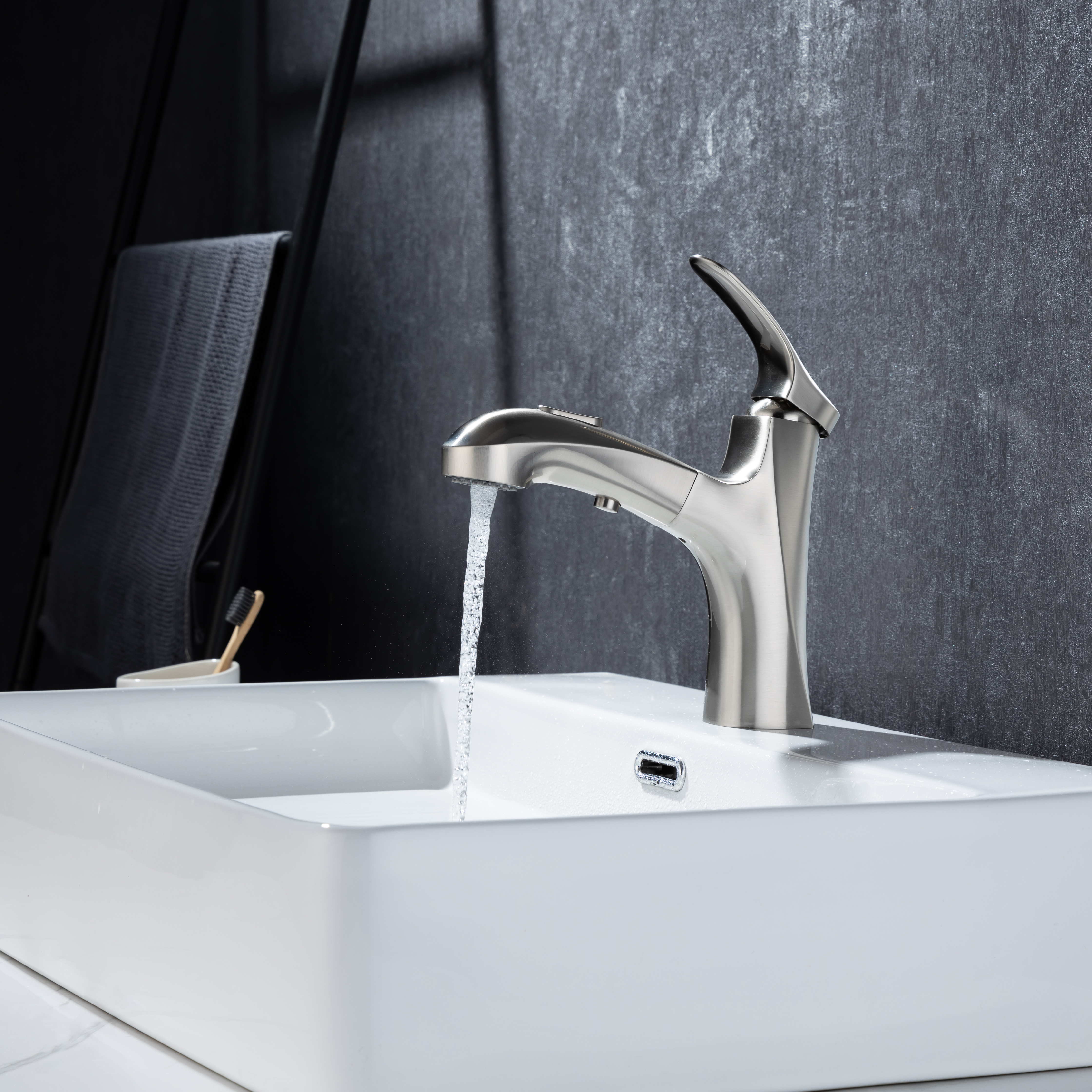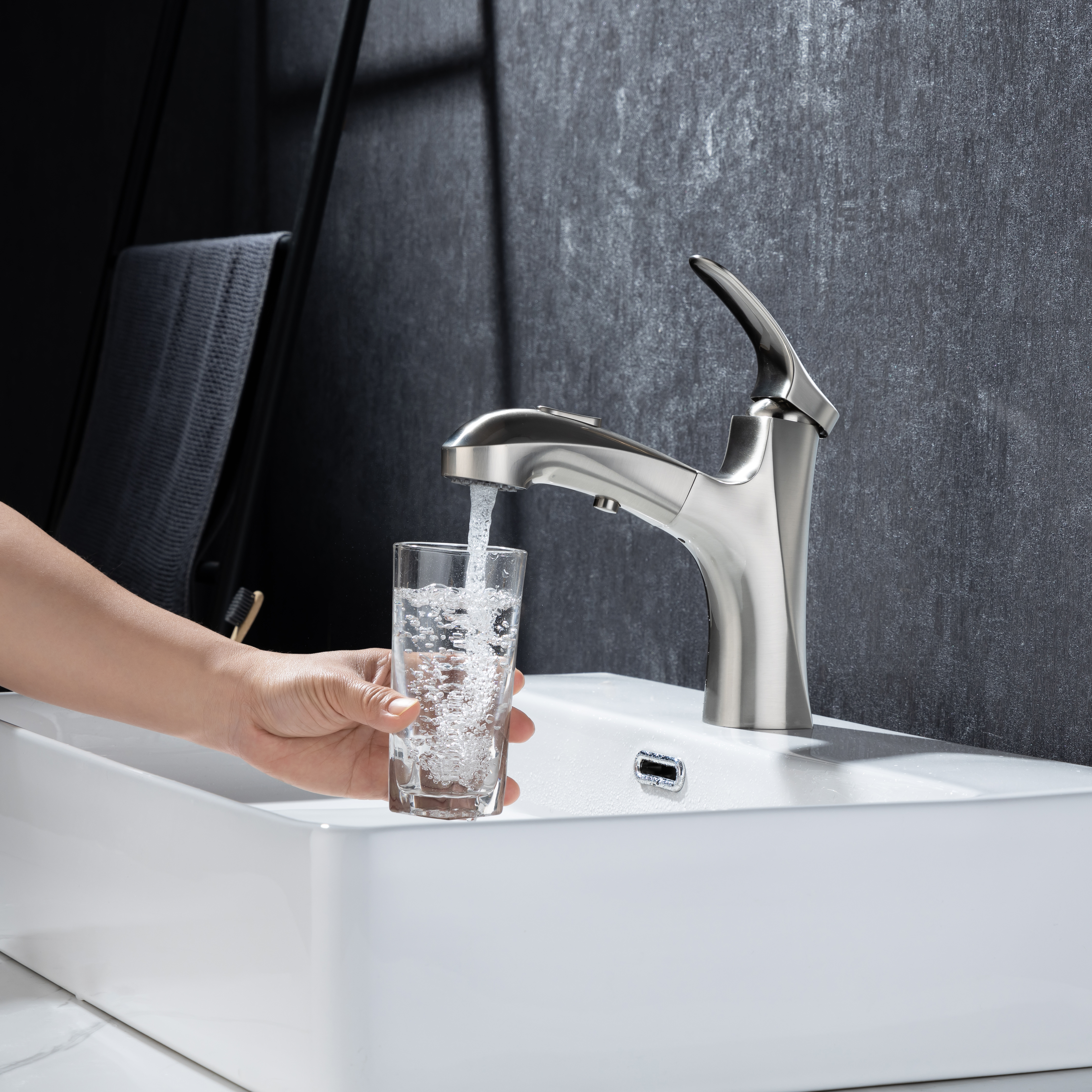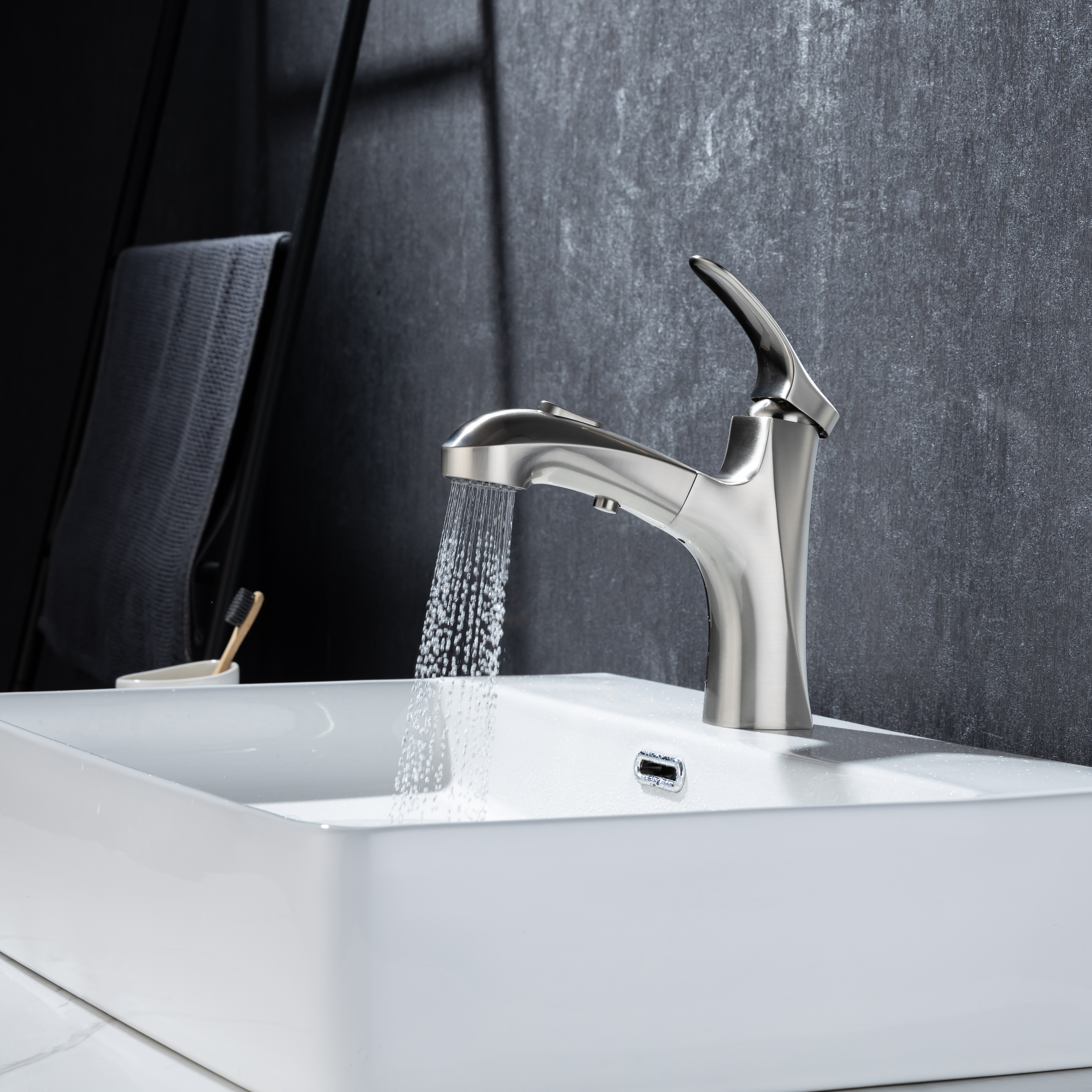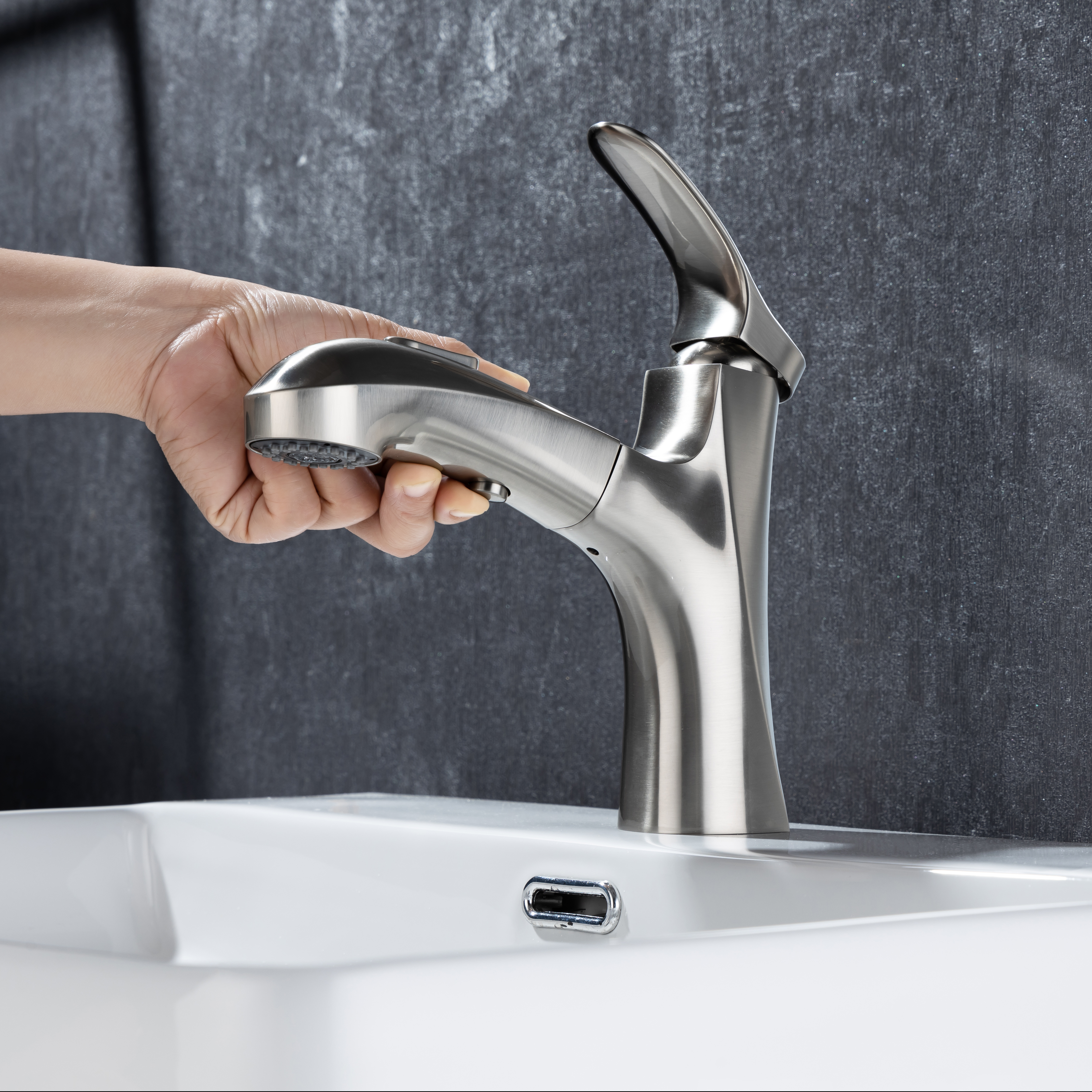 ★【360° SWIVEL PULL OUT SPOUT】:Modern bathroom faucet with polyester braided pull out hose makes it convenient to wash your hair in the basin. The surface treatment won't tarnish or scratch with excellent corrosion resistance,easy to clean.