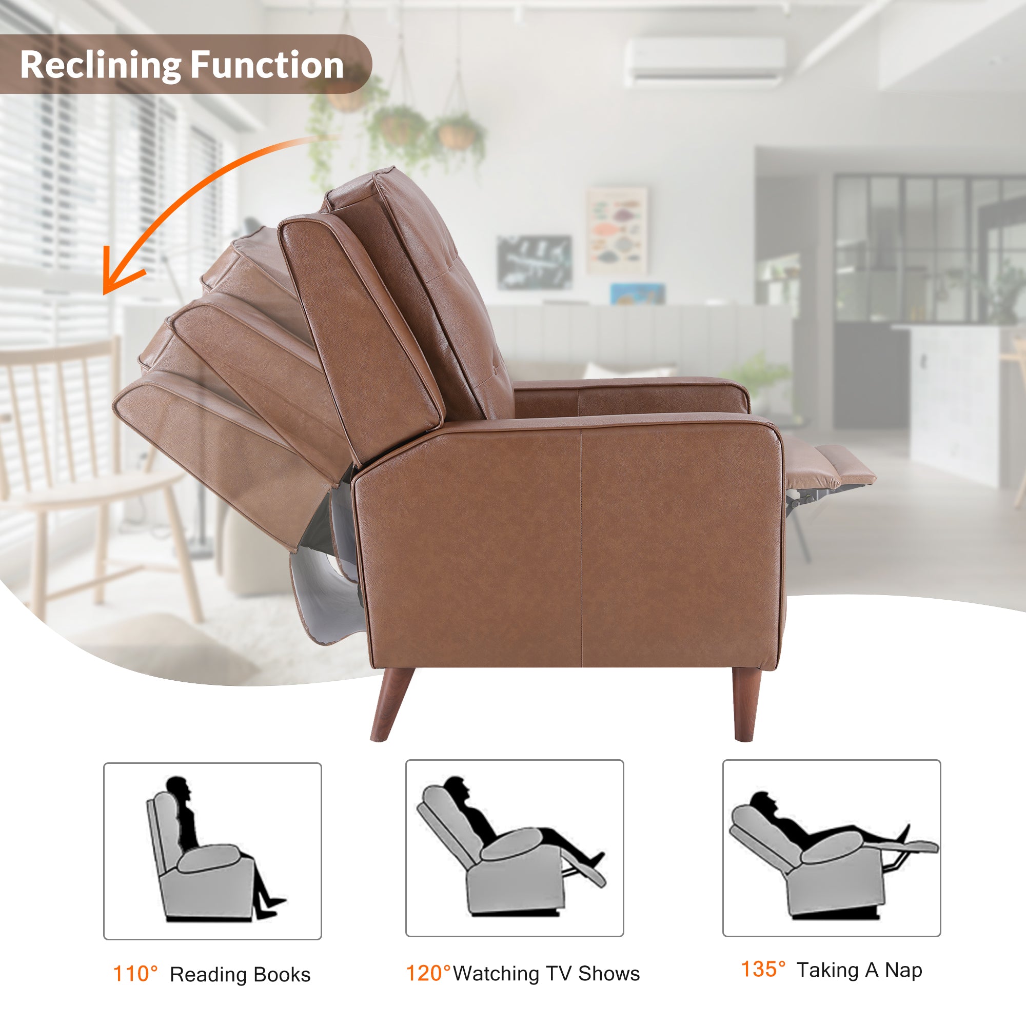 User Friendly: To fully recline this chair, just lean against the back of the recliner to find your most comfortable positioning. it depends on what you want to do. Like reading a book, watching a movie, taking a nap, all you could adjust a suitable angle to enjoy