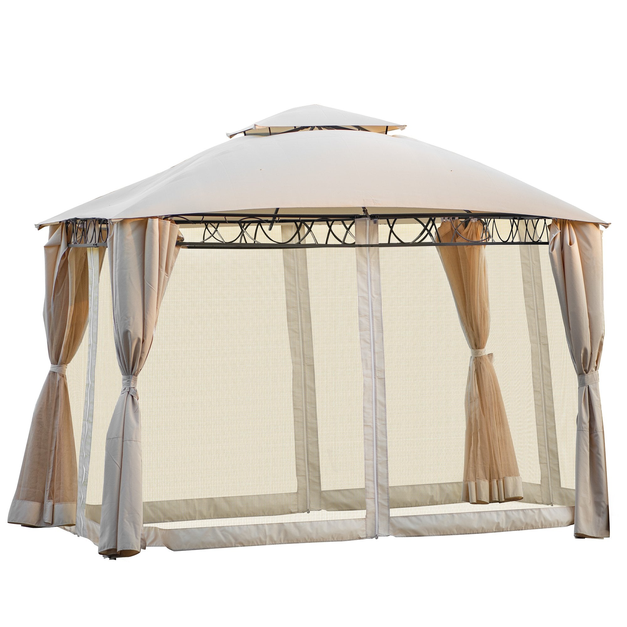 Relax and unwind outdoors in elegance with this gazebo inspired canopy, ideal for providing temporary shade for both commercial and household outdoor activities such as barbecues, golfing events, sports games and more with eye catching class. With a polished look and quality build, this canopy has high functionality and goes above and beyond the basic requirements of a canopy - the elegant smoke chimney double-tiered canopy top and mesh netting is resistant UV rays, water and fire to keep you comfortable in hottest climates. Know your outdoor events have a secure shelter with the galvanized foot pads for optimal support, heavy duty steel frame and zipper mesh draping with cascading curtains that can be closed to completely cover all 4 sides.
