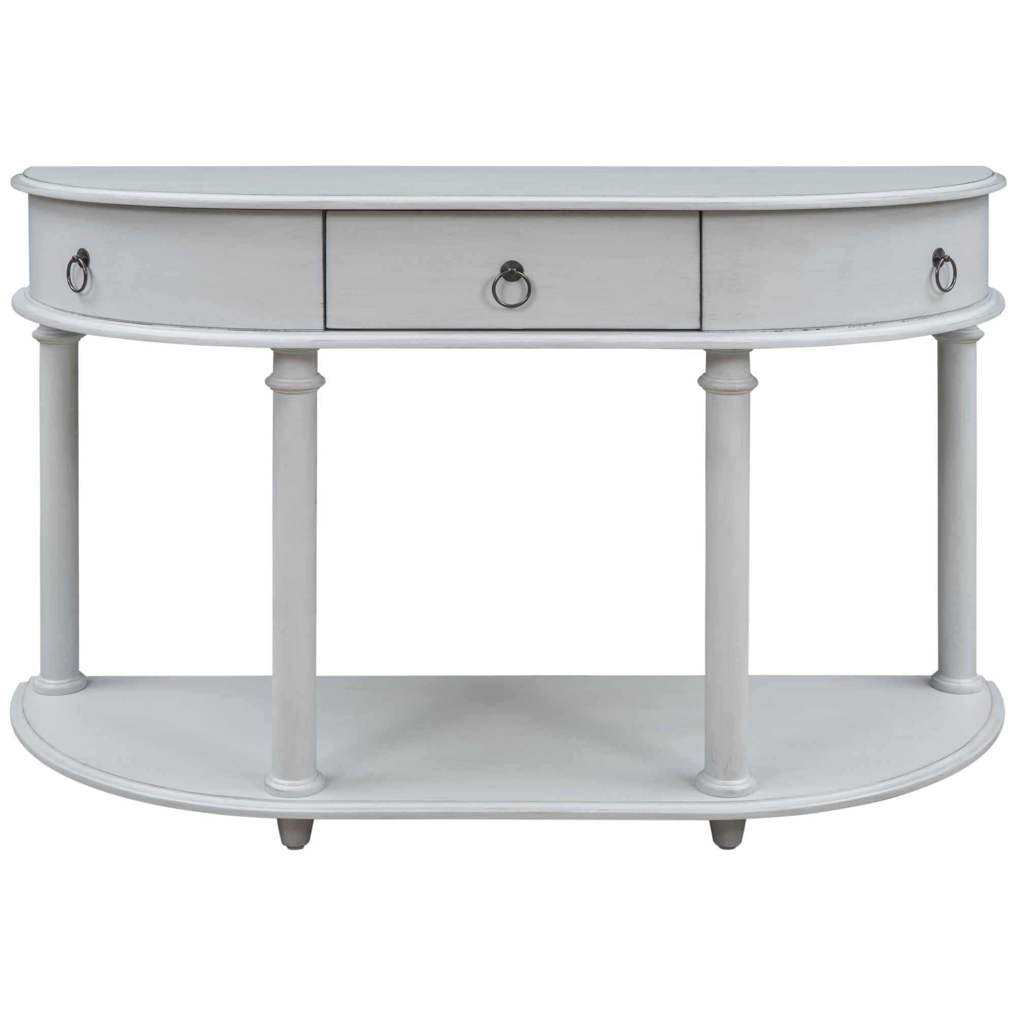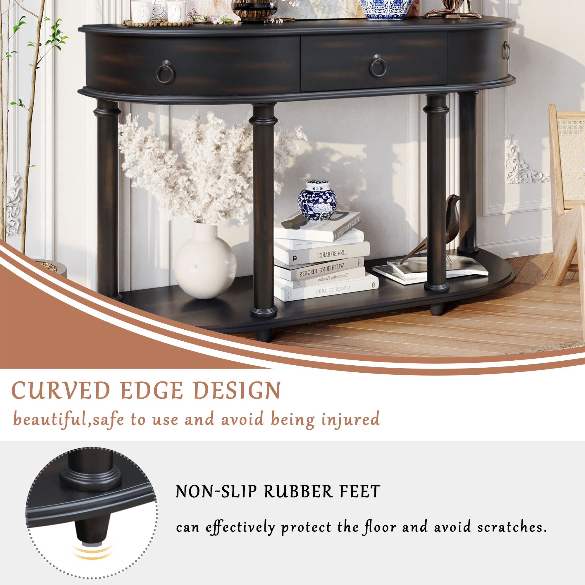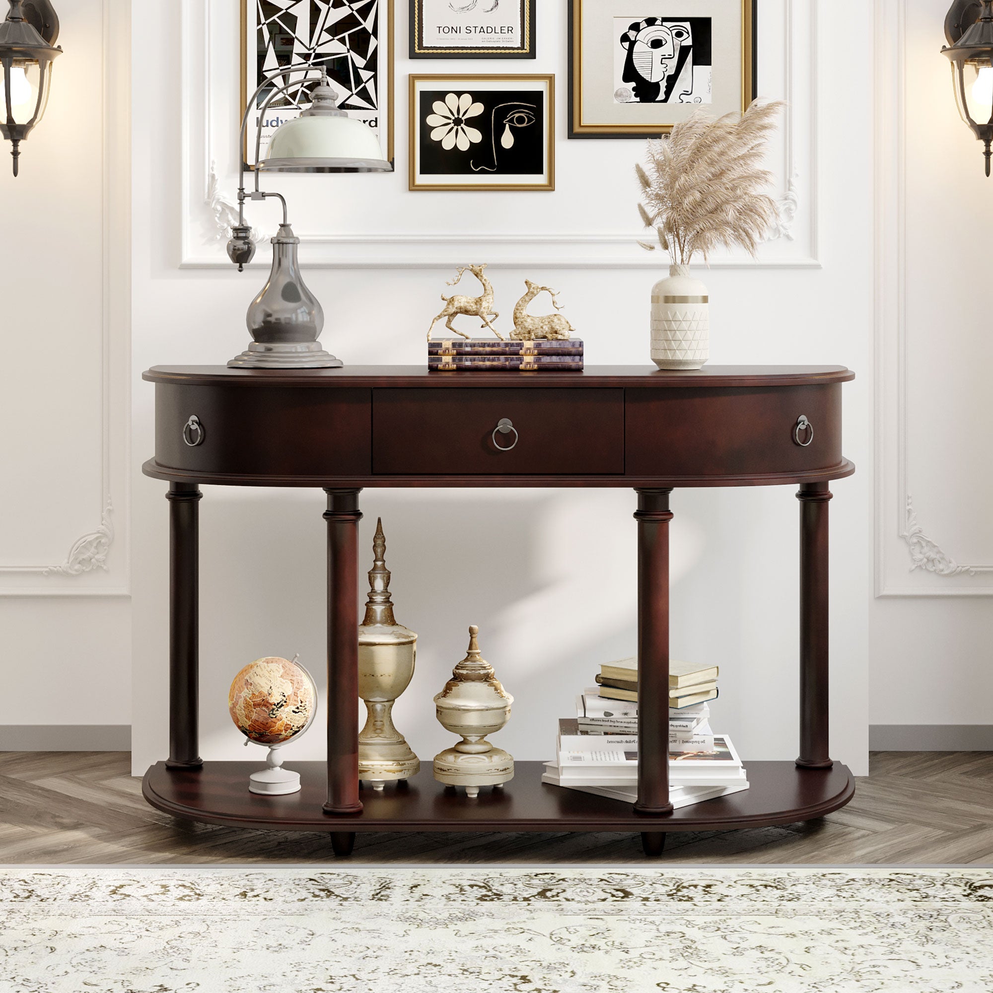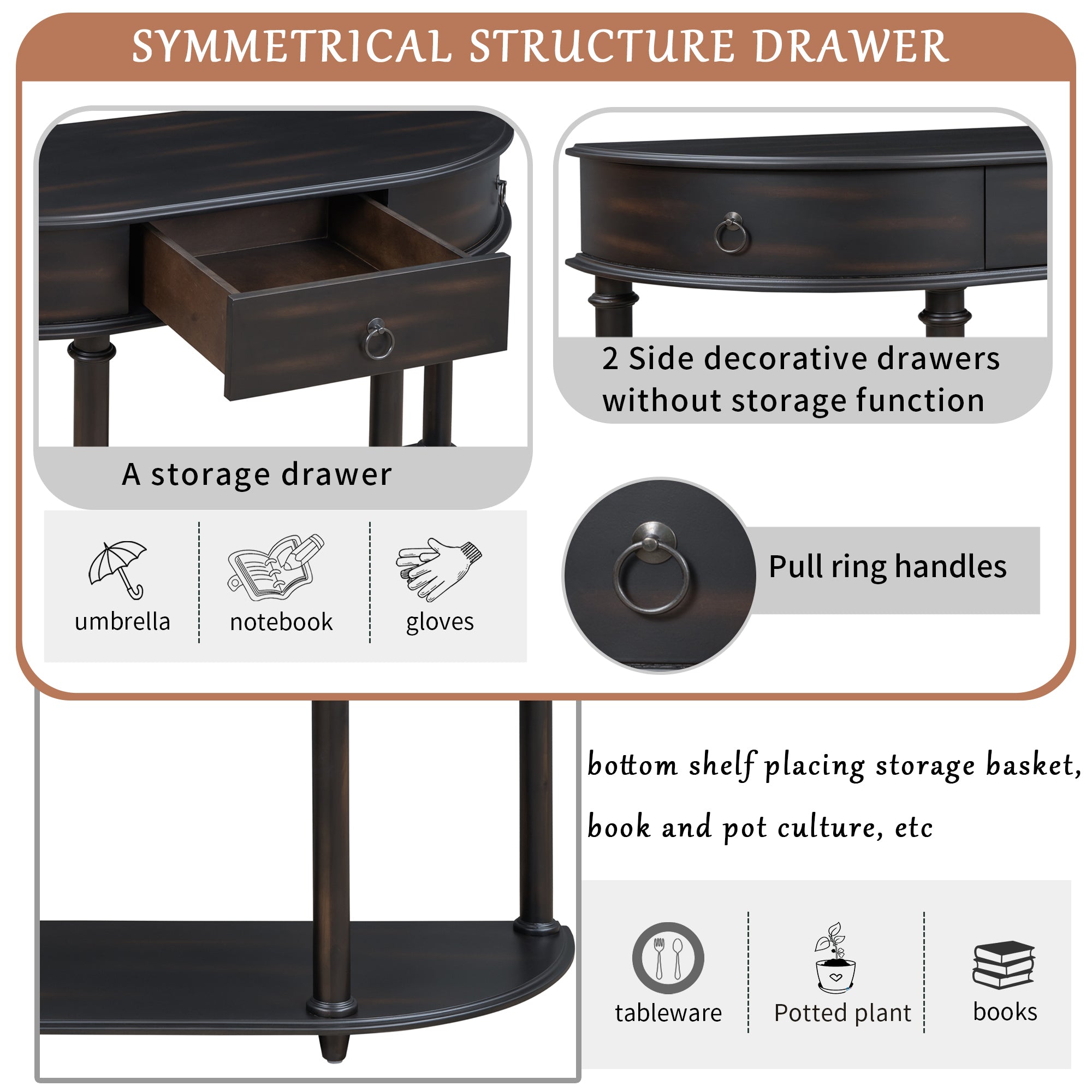 Retro Curved Console Table, Solid Wood Frame and Legs with Single Drawer Half Moon Entry Table