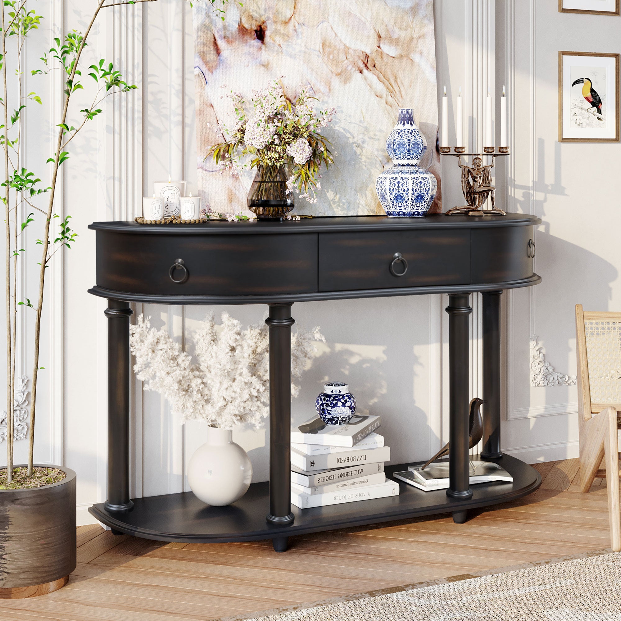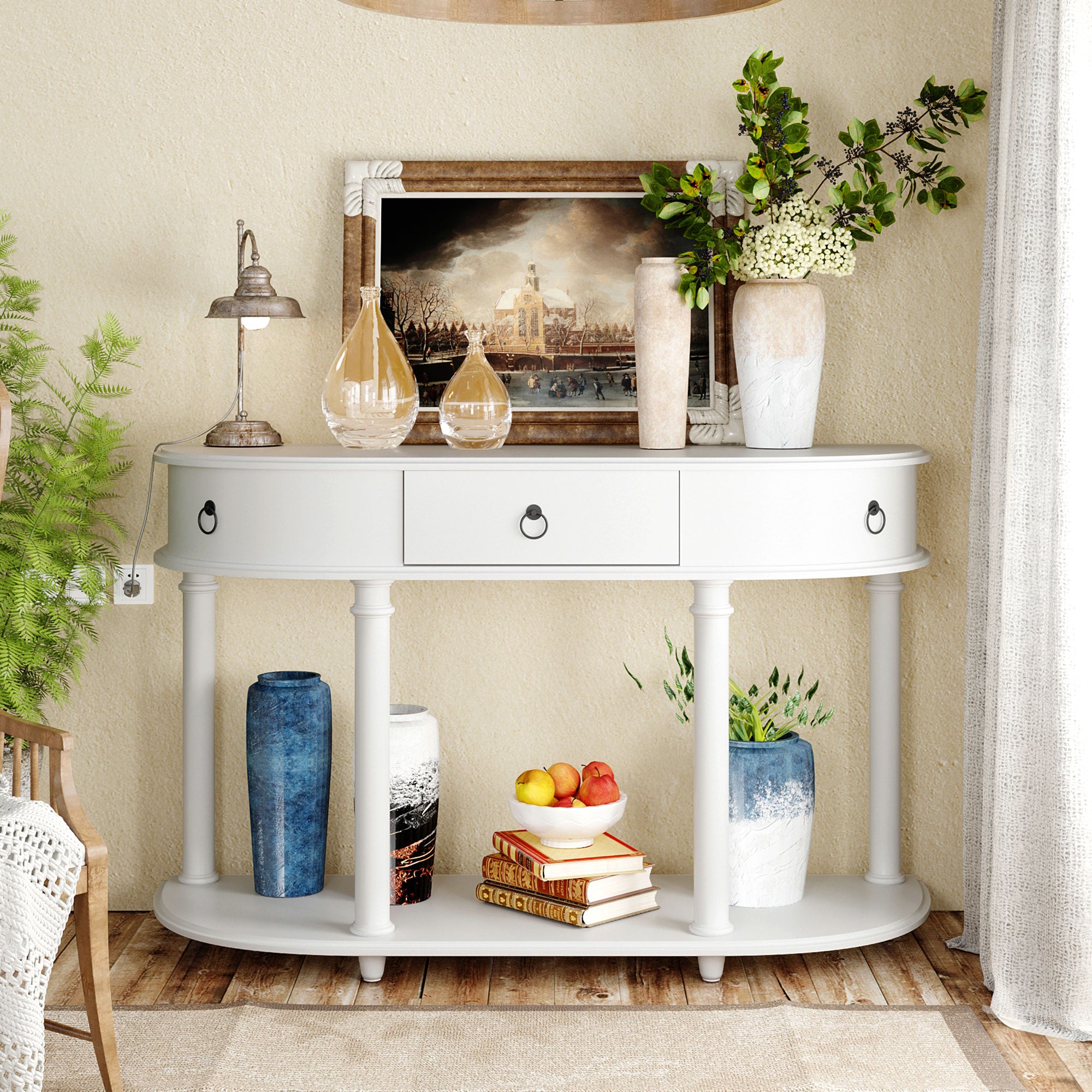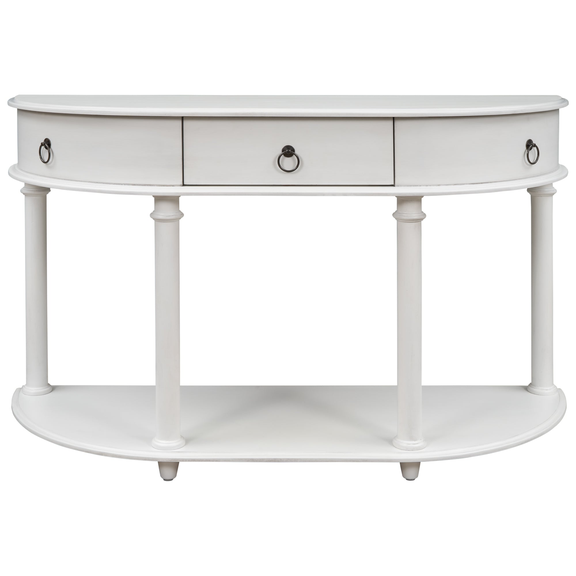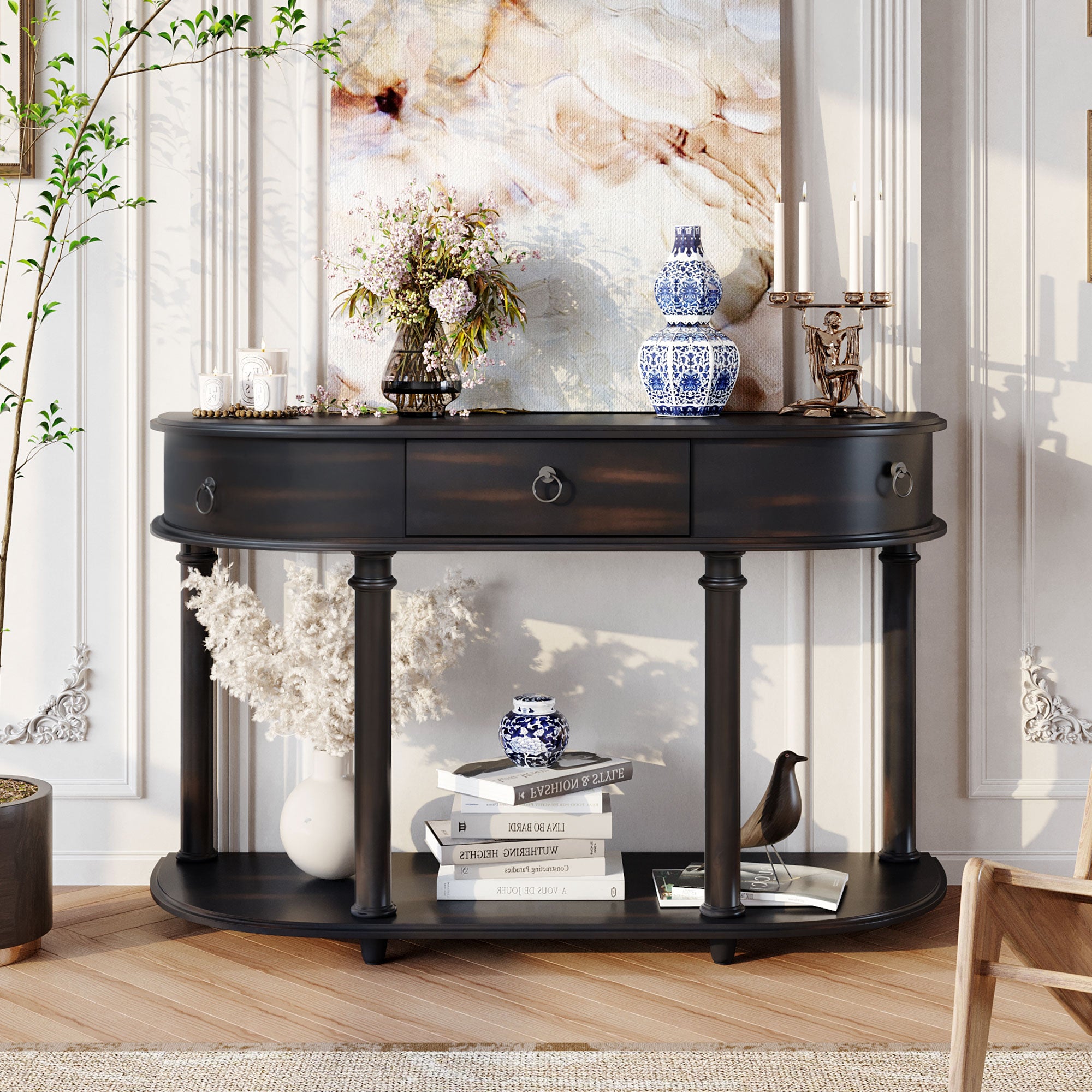 Retro Curved Console Table, Solid Wood Frame and Legs with Single Drawer Half Moon Entry Table