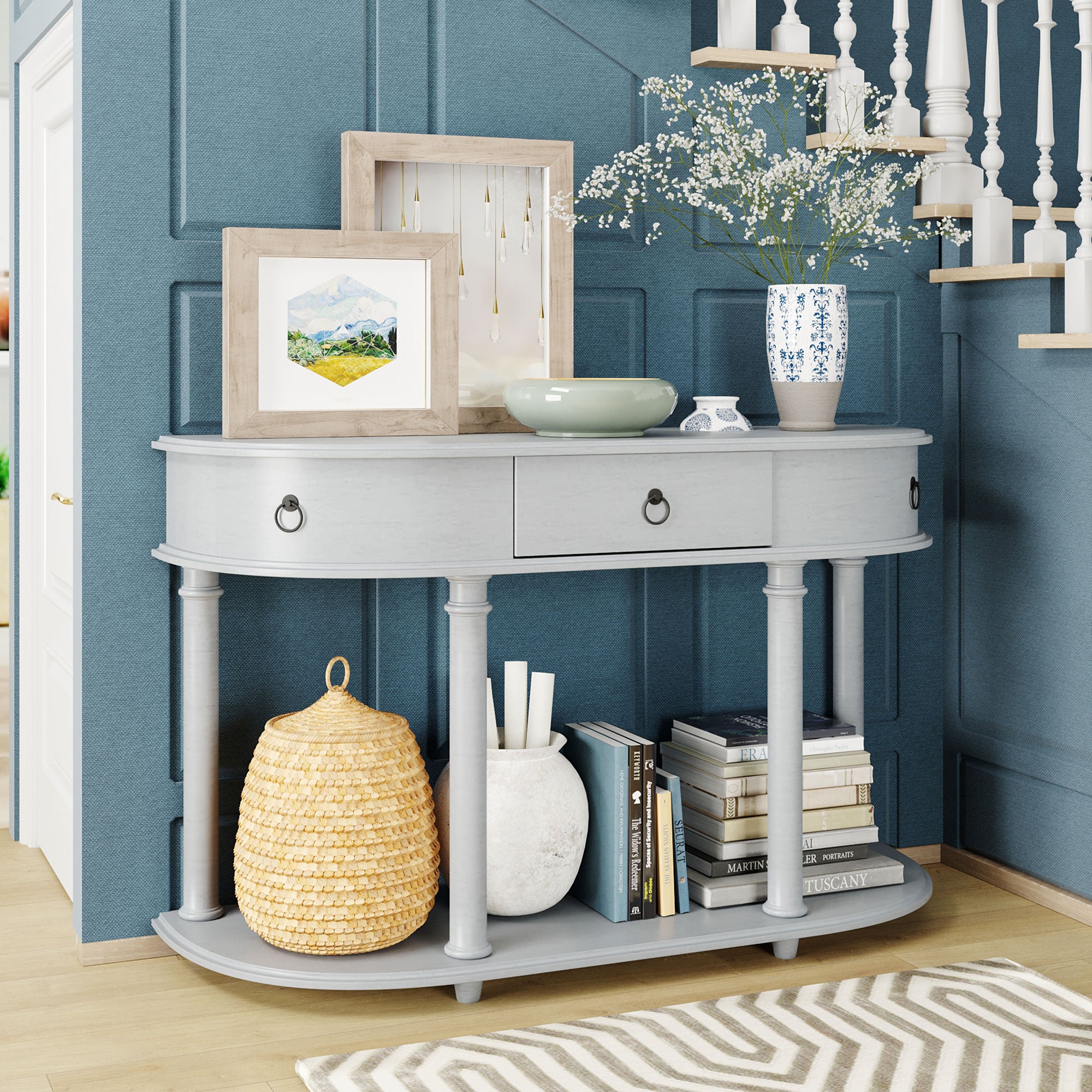 Symmetric structure: There is a separate drawer under the desktop, which can be used to store daily necessities like keys or books. The pull-ring handles consistent with the middle drawer are also designed on both sides, showing a symmetrical structure, which makes it look more harmonious and has a sense of design. Semi-circular outline, full of design sense, and four legs make the structure more stable. Decorations such as photos and vases can be placed on the desktop, and storage baskets, potted plants, decorations and some lamps can be placed on the bottom plate