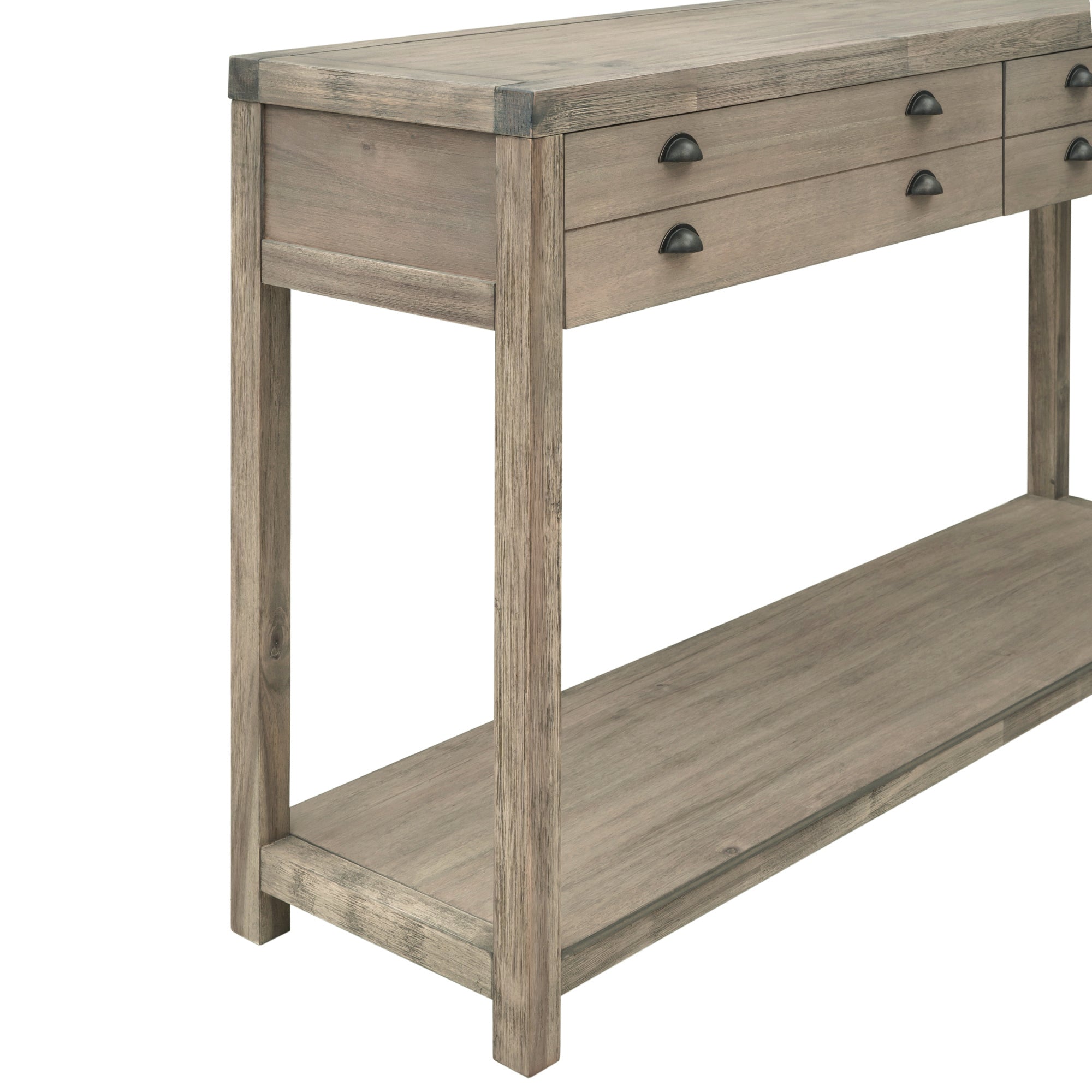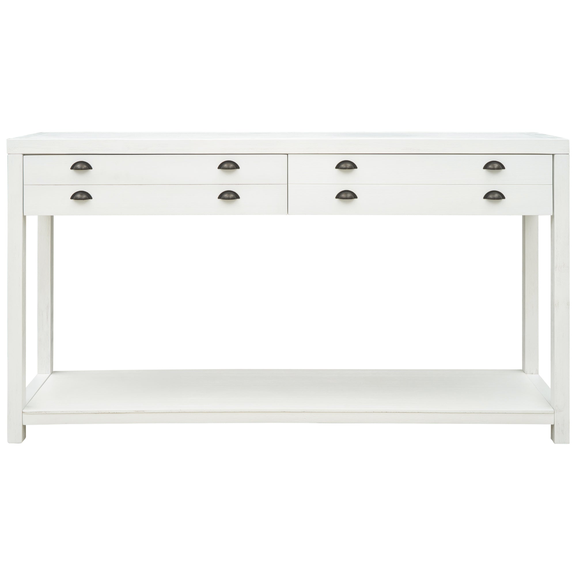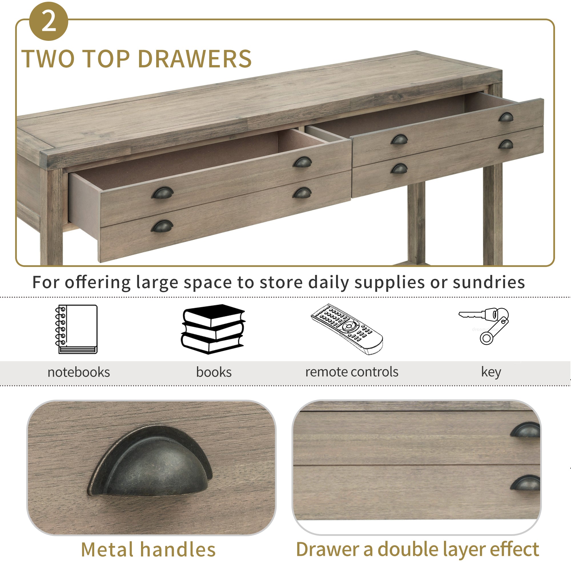 Two Top Drawers: For offering large space to store daily supplies or sundries, two top drawers with sufficient width are designed as a prominent feature of this console table. Each drawer panel is fitted with four neatly arranged metal handles. The dividing line in the middle of the drawer panel gives the drawer a double layer effect. The bottom of the drawer is fitted with an aluminum slide.
