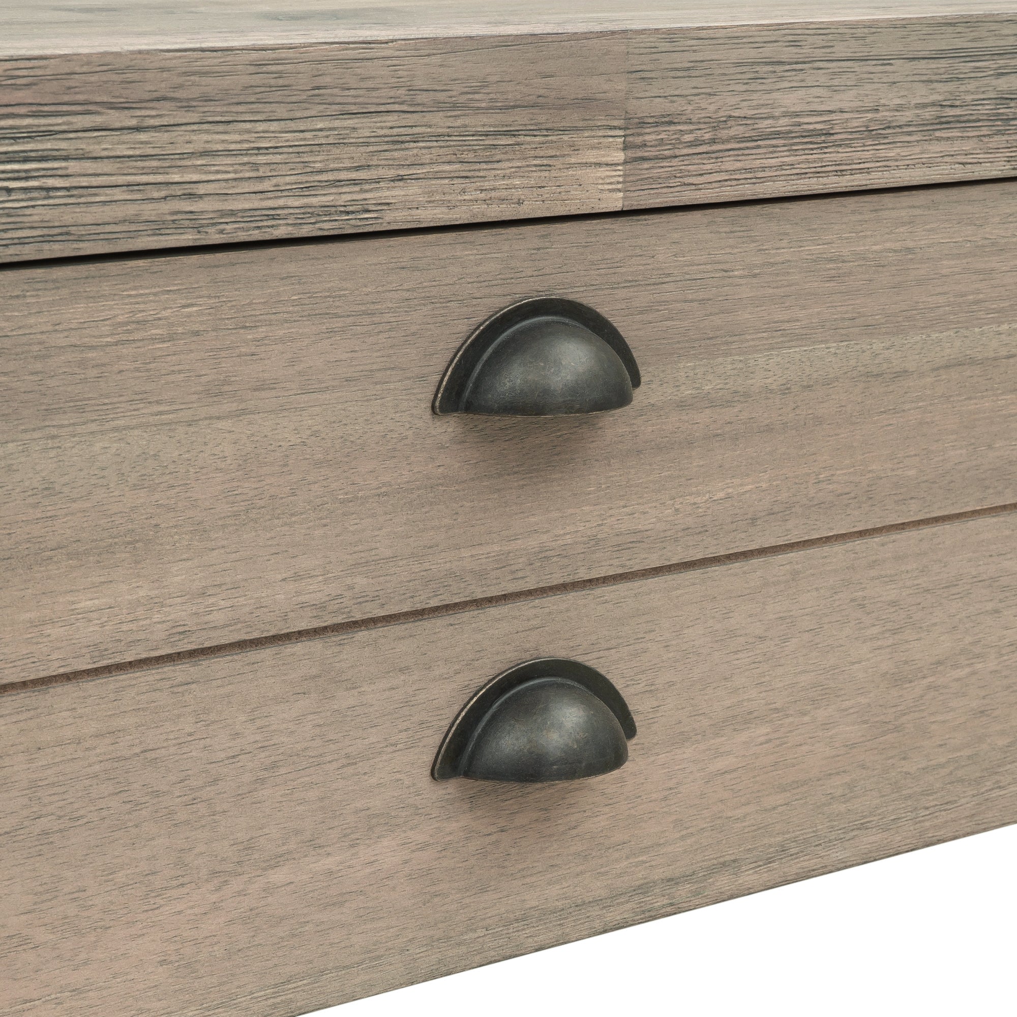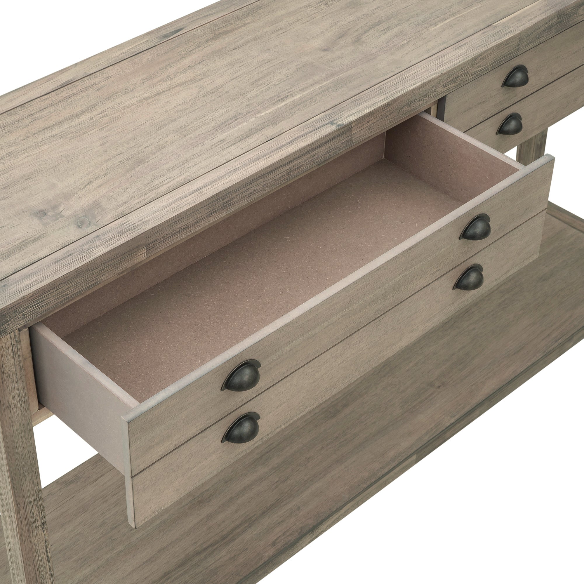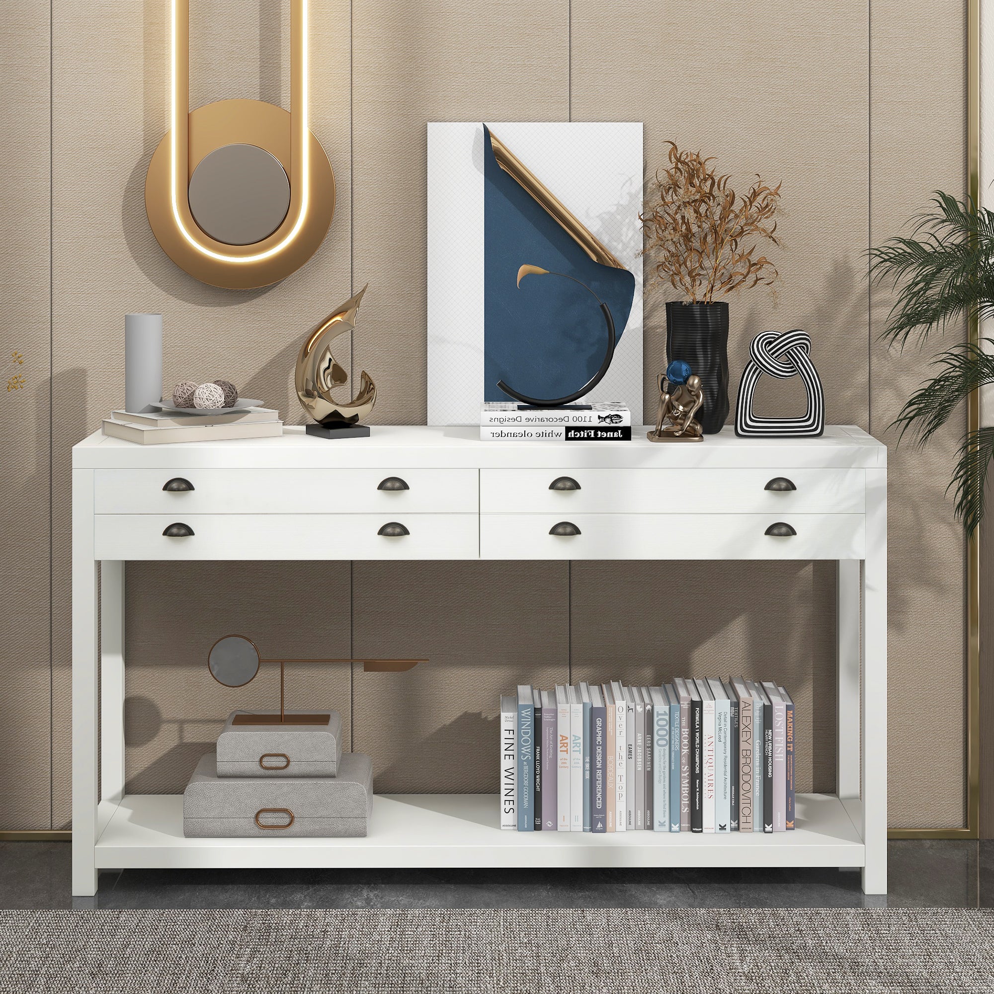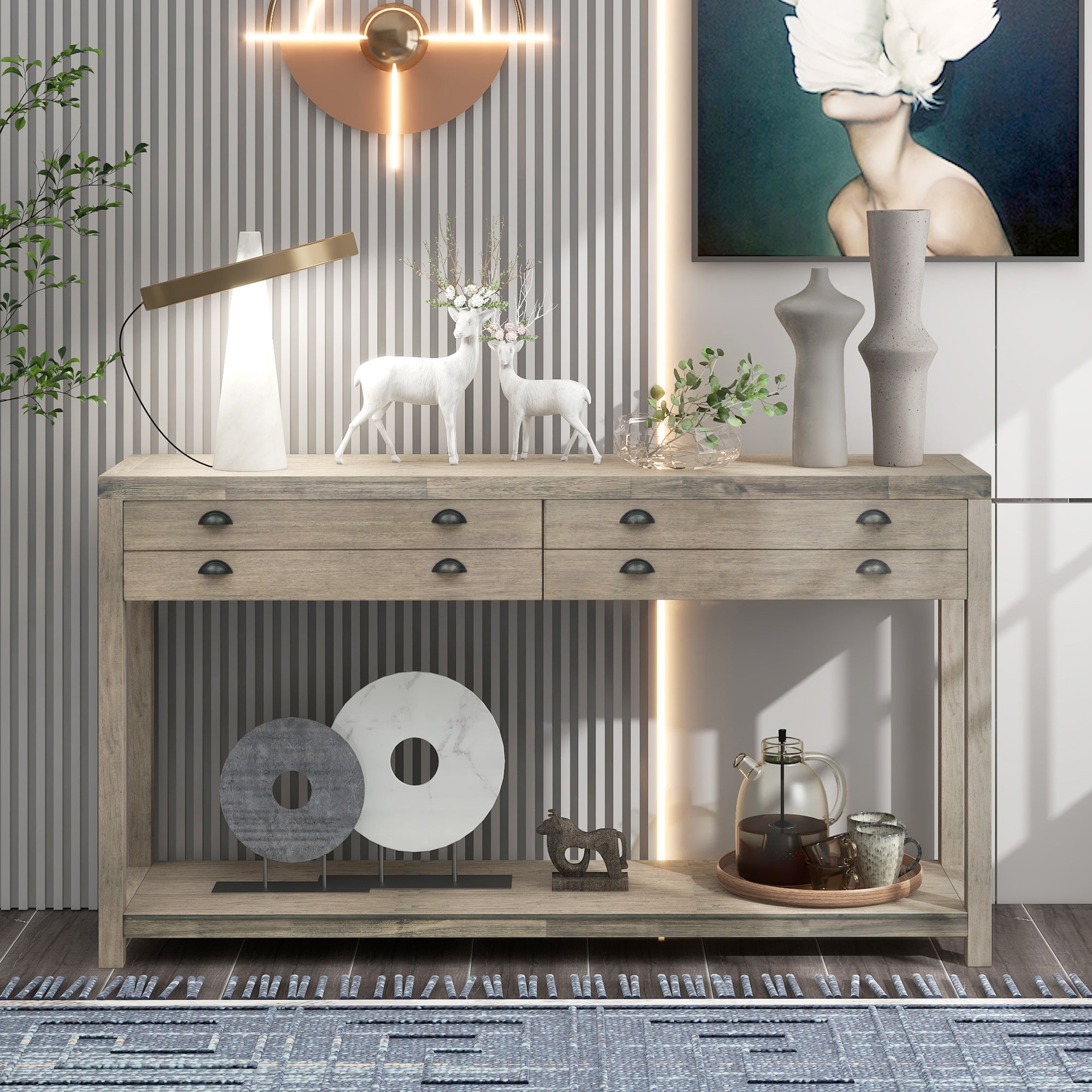 Two Top Drawers: For offering large space to store daily supplies or sundries, two top drawers with sufficient width are designed as a prominent feature of this console table. Each drawer panel is fitted with four neatly arranged metal handles. The dividing line in the middle of the drawer panel gives the drawer a double layer effect. The bottom of the drawer is fitted with an aluminum slide.