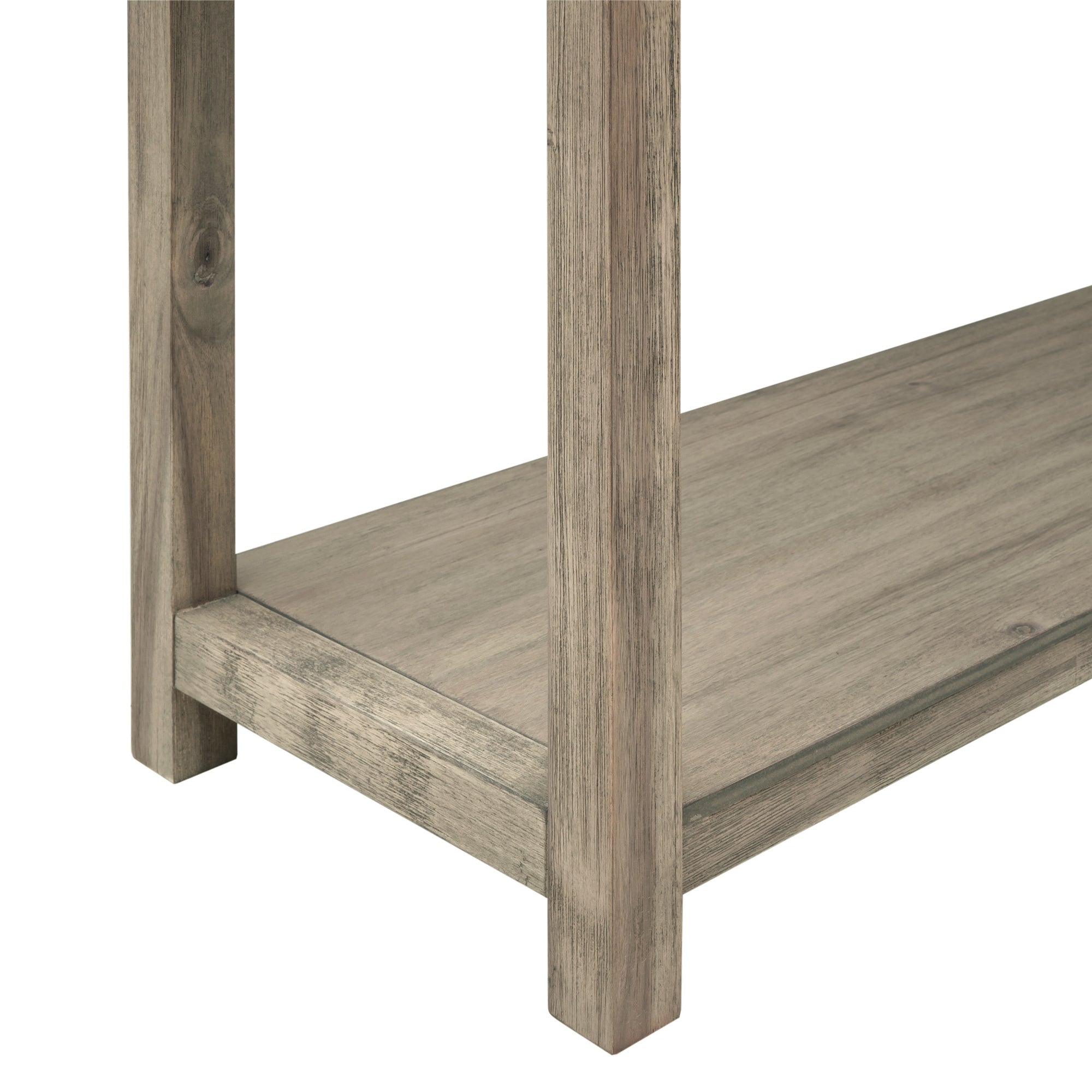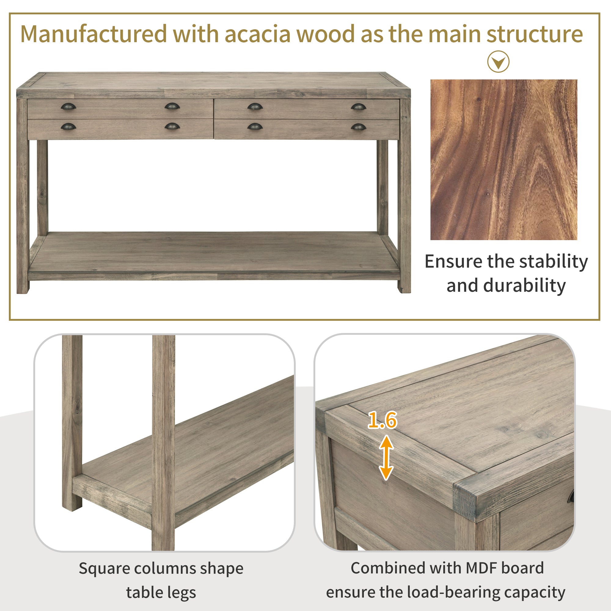 Wooden Frame & MDF Board: In order to ensure the stability and durability, this retro style console table is manufactured with acacia wood as the main structure. The table legs in the shape of four square columns are made of acacia wood as well, and they have no any carve decorations. The wooden structure combined with MDF board forms a compact and practical furniture for your home. In addition, metallic material is added among them as functional part, had the effect of ornament.