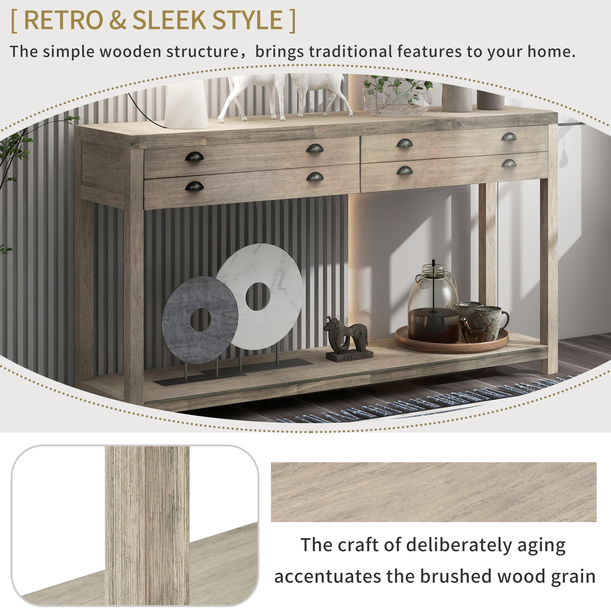 Retro & Sleek Style: With straight lines and no decoration, this retro and preciseness style console table comes with a solemn and respectful atmosphere to your house. The simple wooden structure with original grain and compact design brings traditional features to your home. A sleek structure coupled with conventional use equals the perfect home furnishing. The craft of deliberately aging accentuates the brushed wood grain.