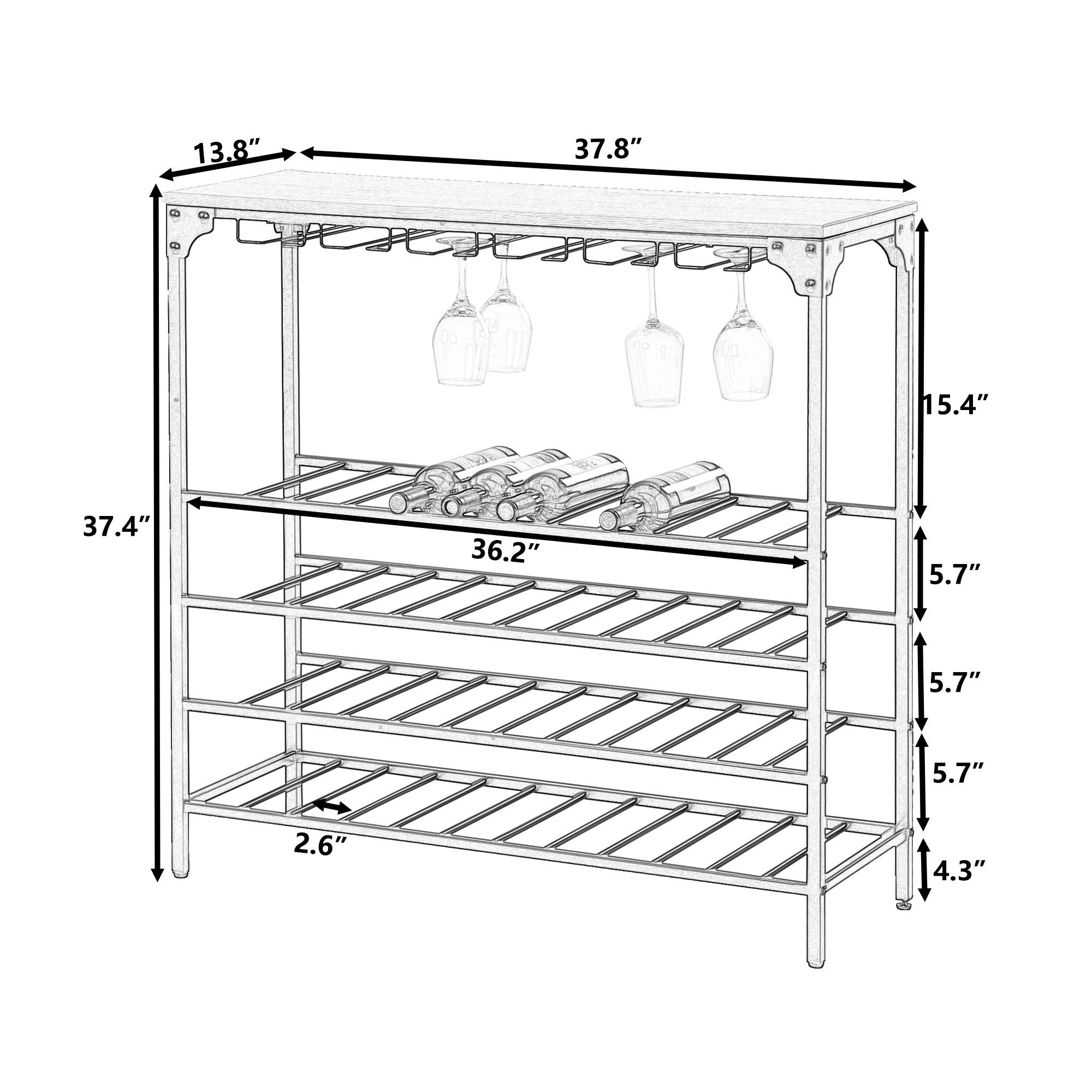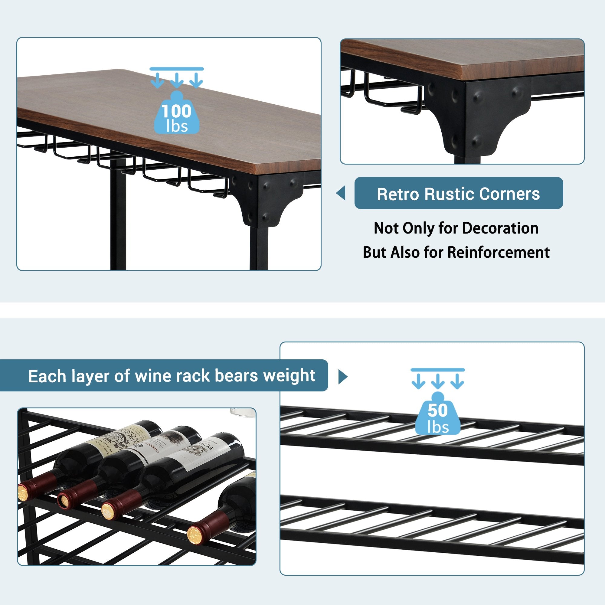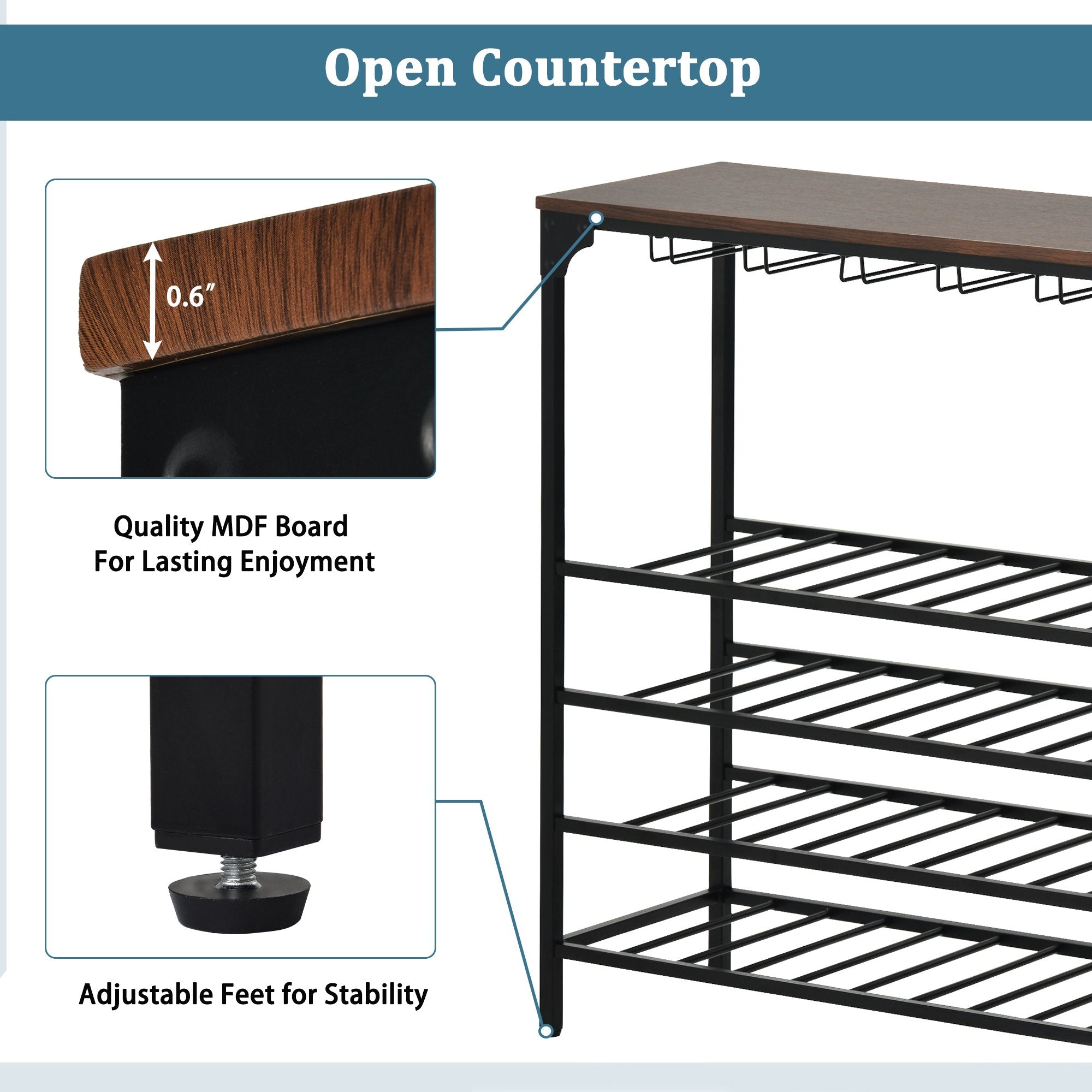 Elegant & Rustic Wine Display Shelves---The rustic wine display shelves will match your home well with its rivet design in each corner. It will decorate your home with a kind of farmhouse style. Heavy frame and adjustable foot in each leg will ensure the rack wobble-free while provide a long time using with its premium MDF and metal material.