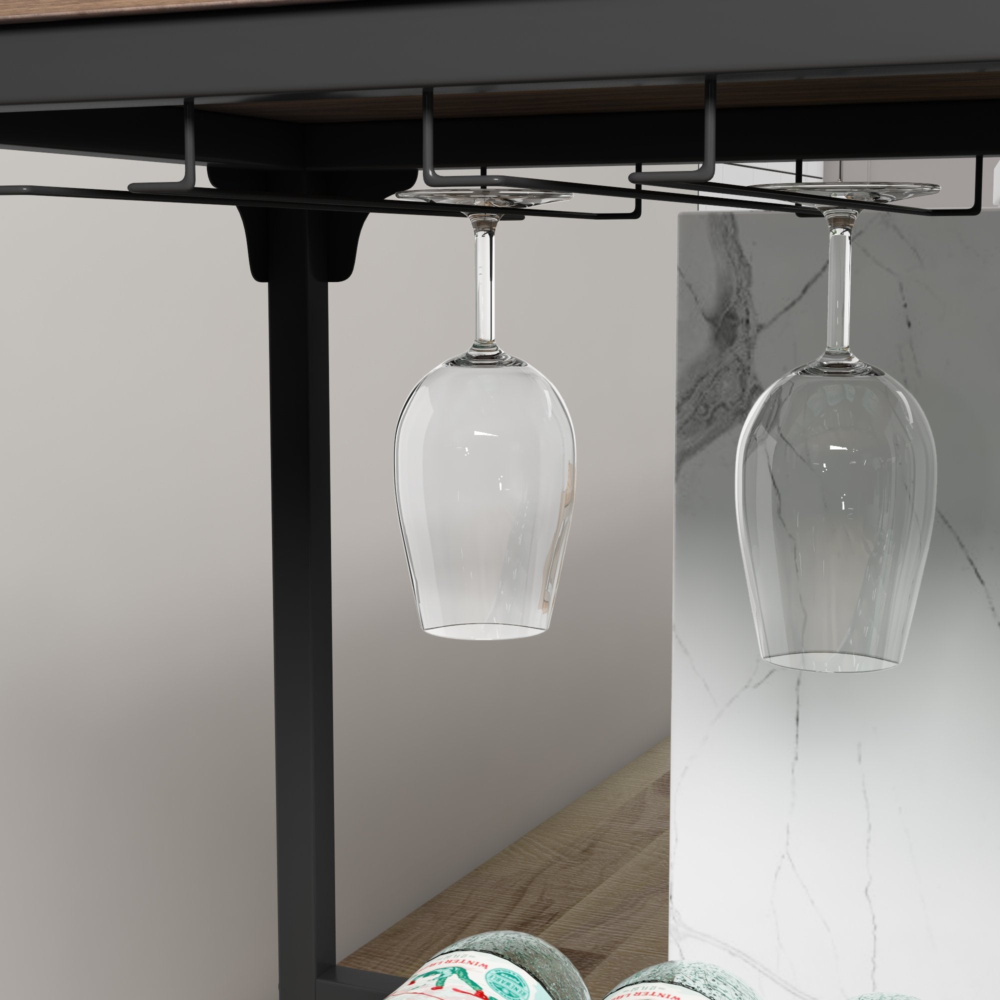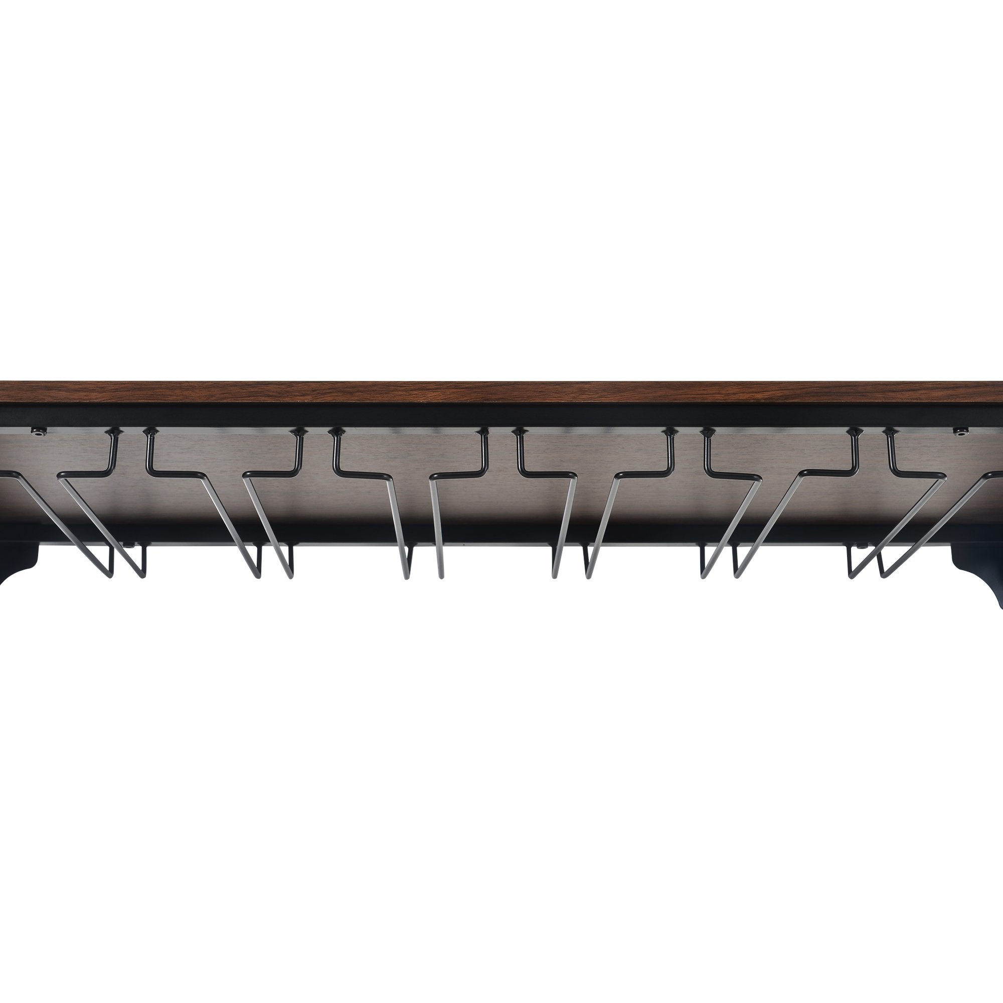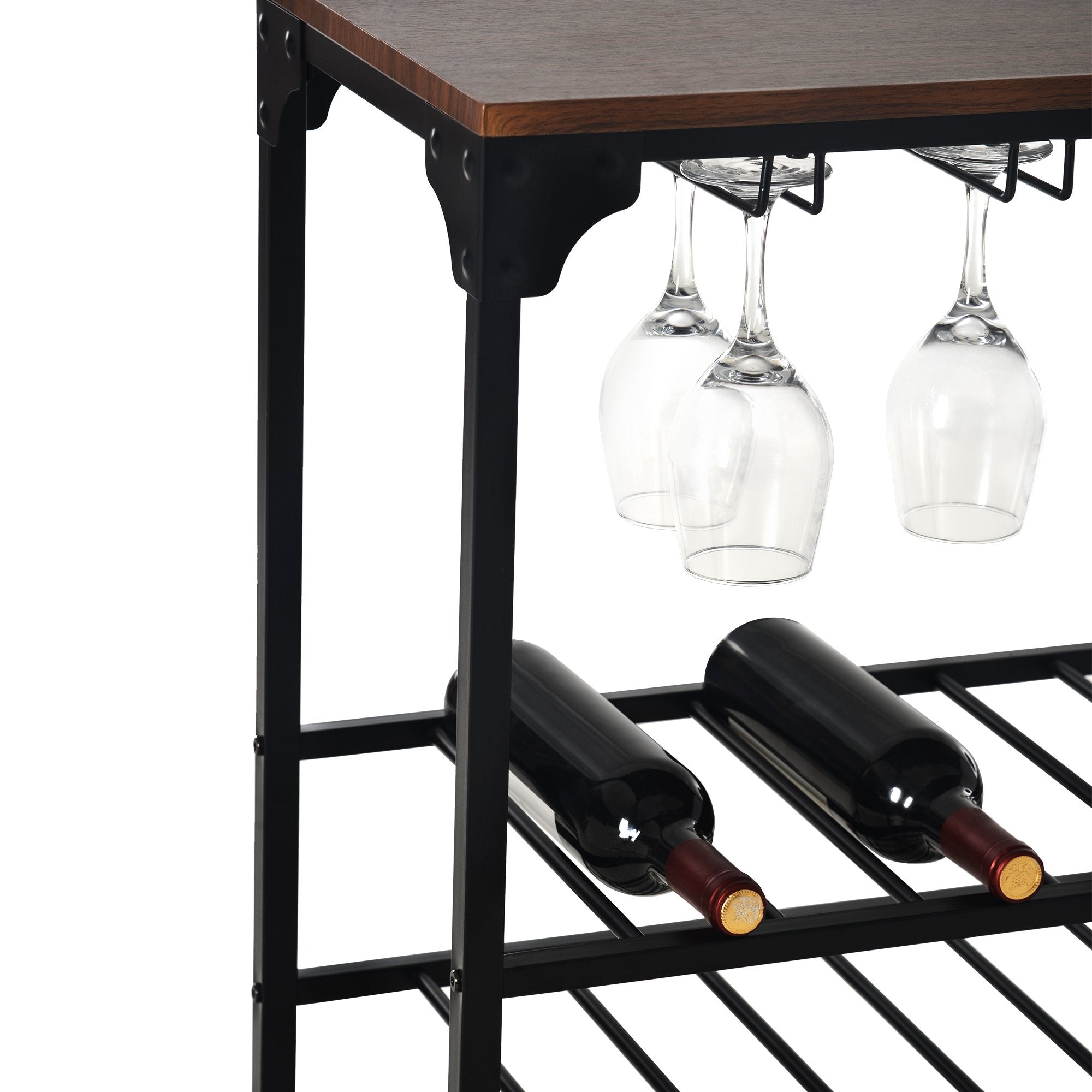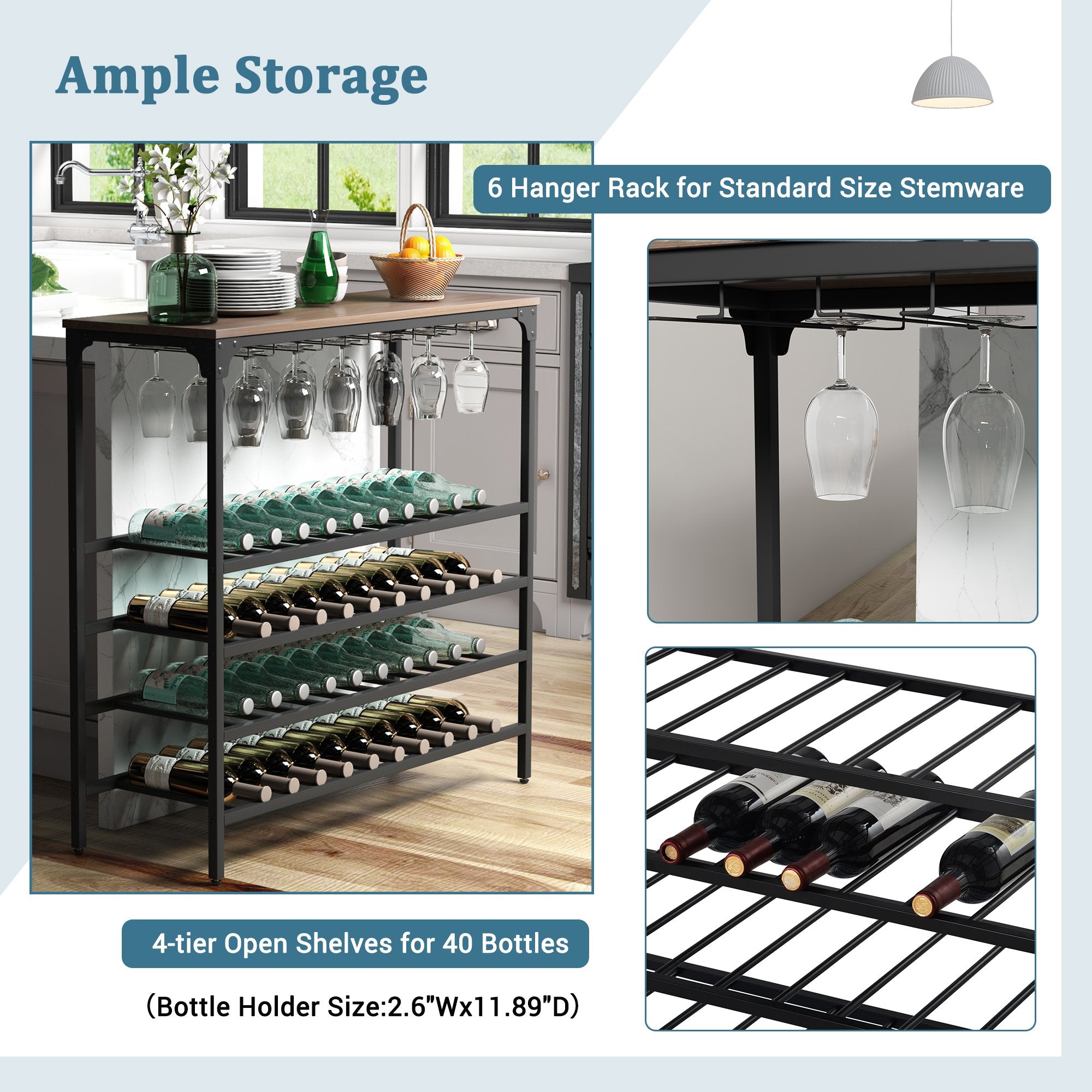 Elegant & Rustic Wine Display Shelves---The rustic wine display shelves will match your home well with its rivet design in each corner. It will decorate your home with a kind of farmhouse style. Heavy frame and adjustable foot in each leg will ensure the rack wobble-free while provide a long time using with its premium MDF and metal material.