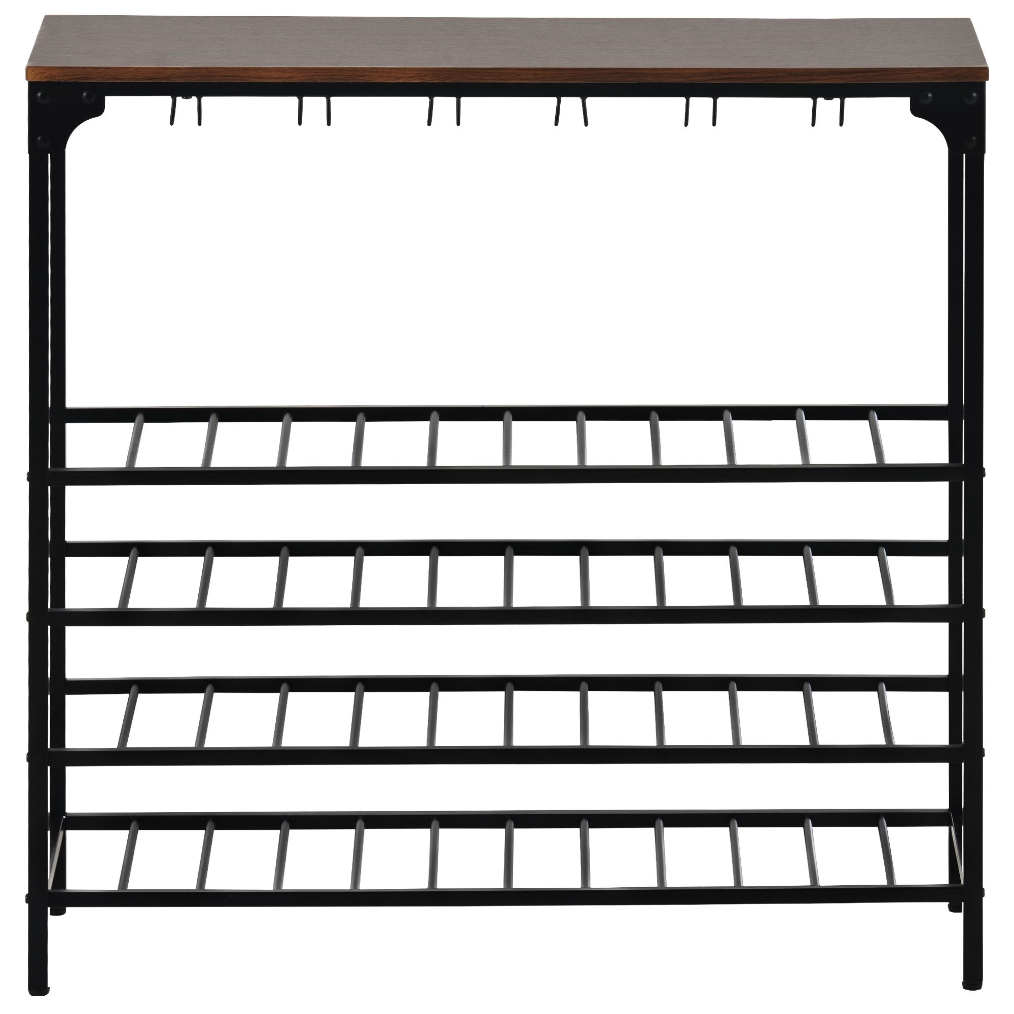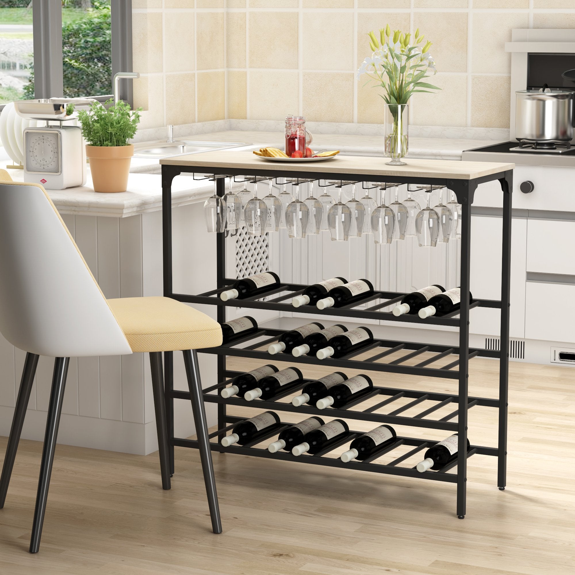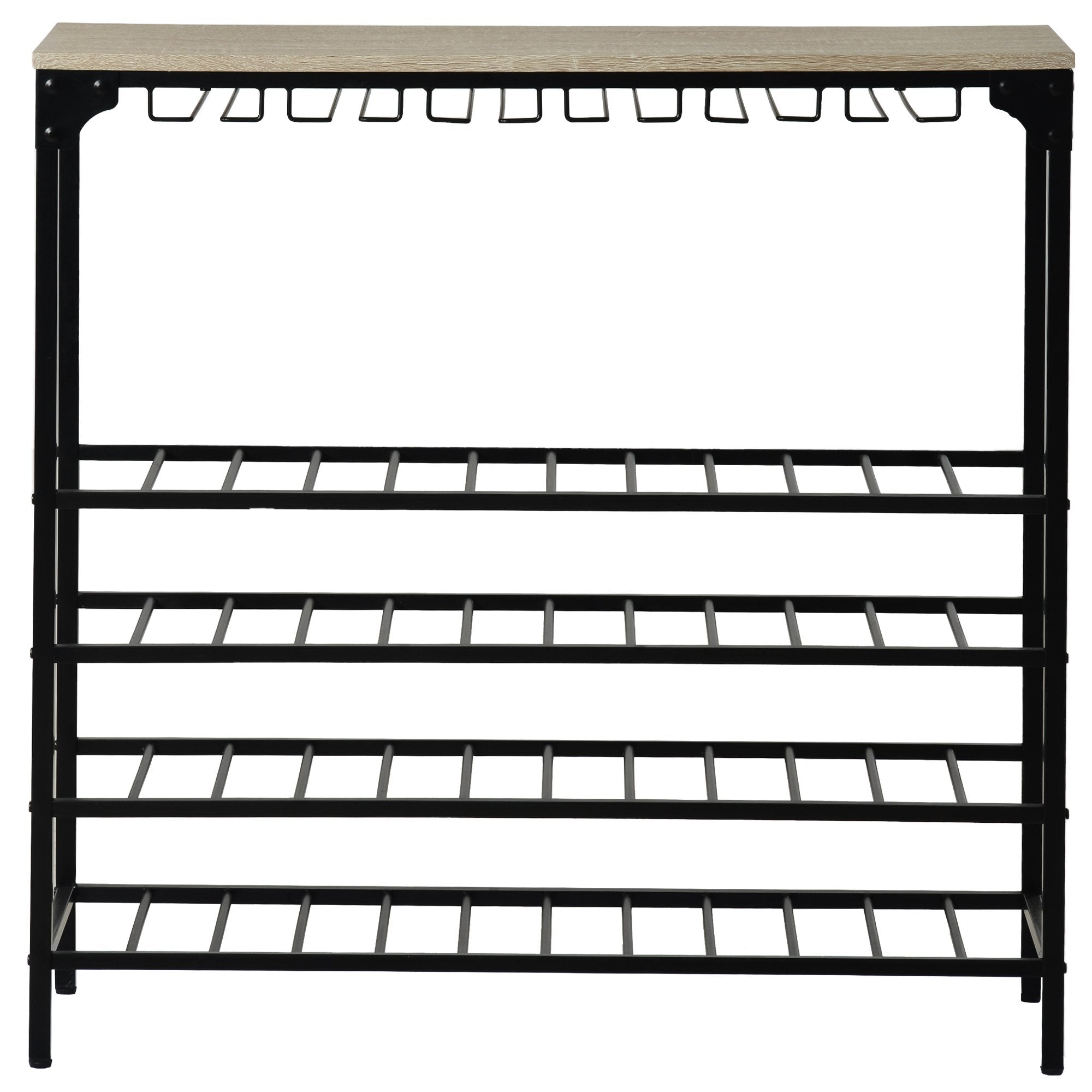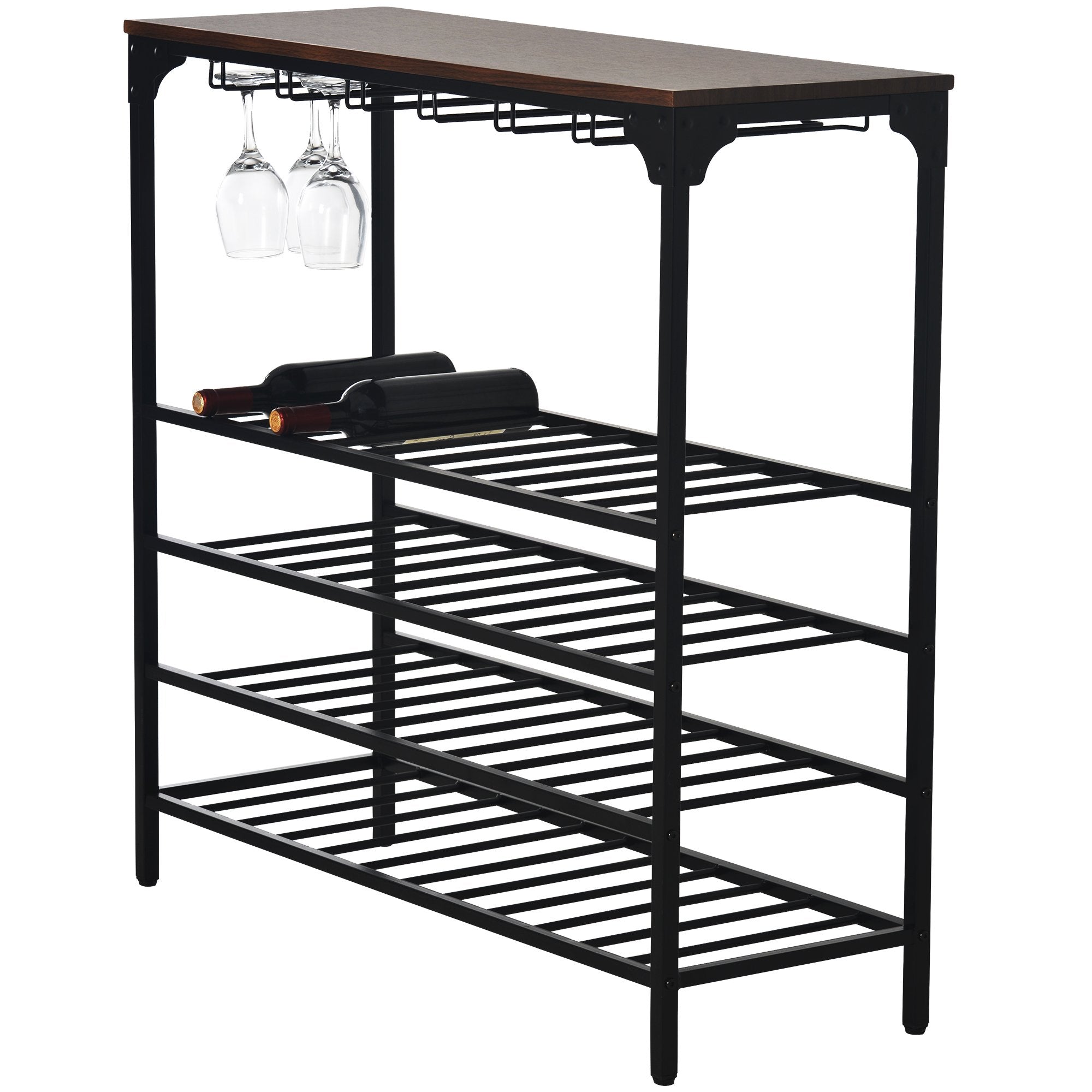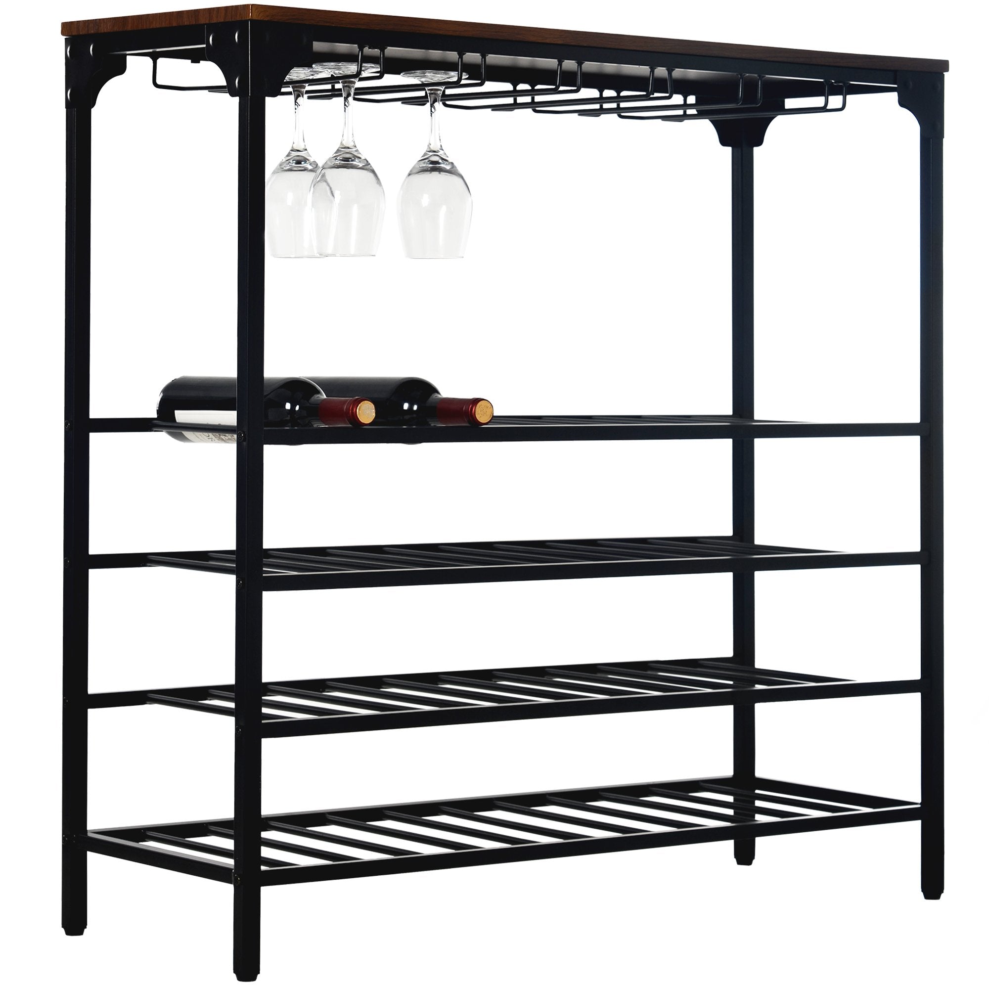 Do you often feel crazy about the wine bottles' chaos and wanna them in the same position but with arm's reach? Then this wine rack will be a great choice for you. Designed to fit in smaller areas and with 5-tier shelves, it is built to hold 40 bottles wine and 12-24 glasses. Just put any wine bottles and liquor you like in it and enjoy your leisure time with your loved one.