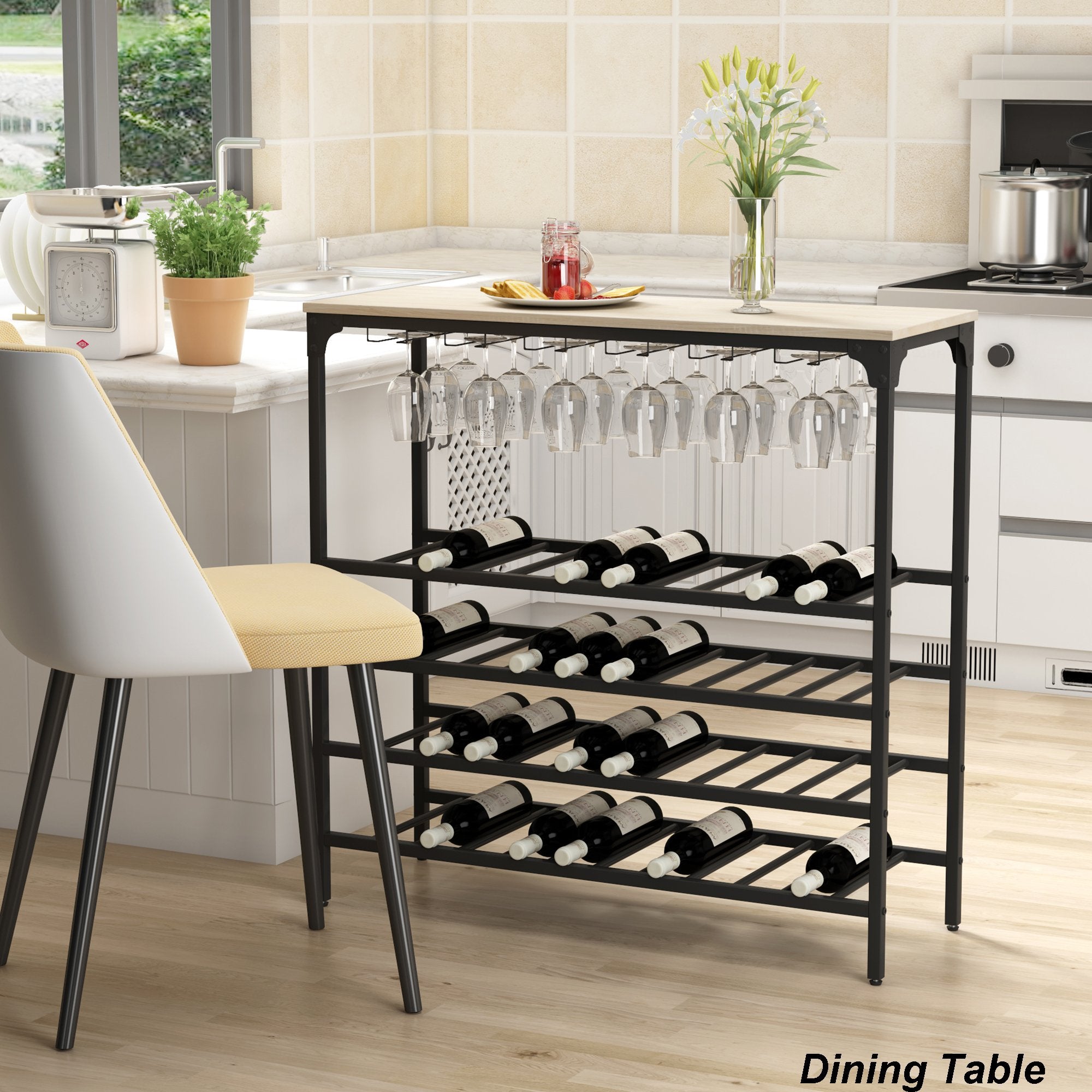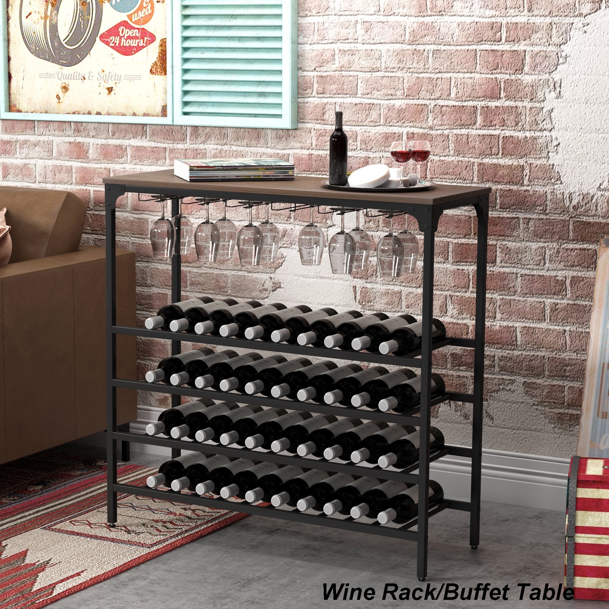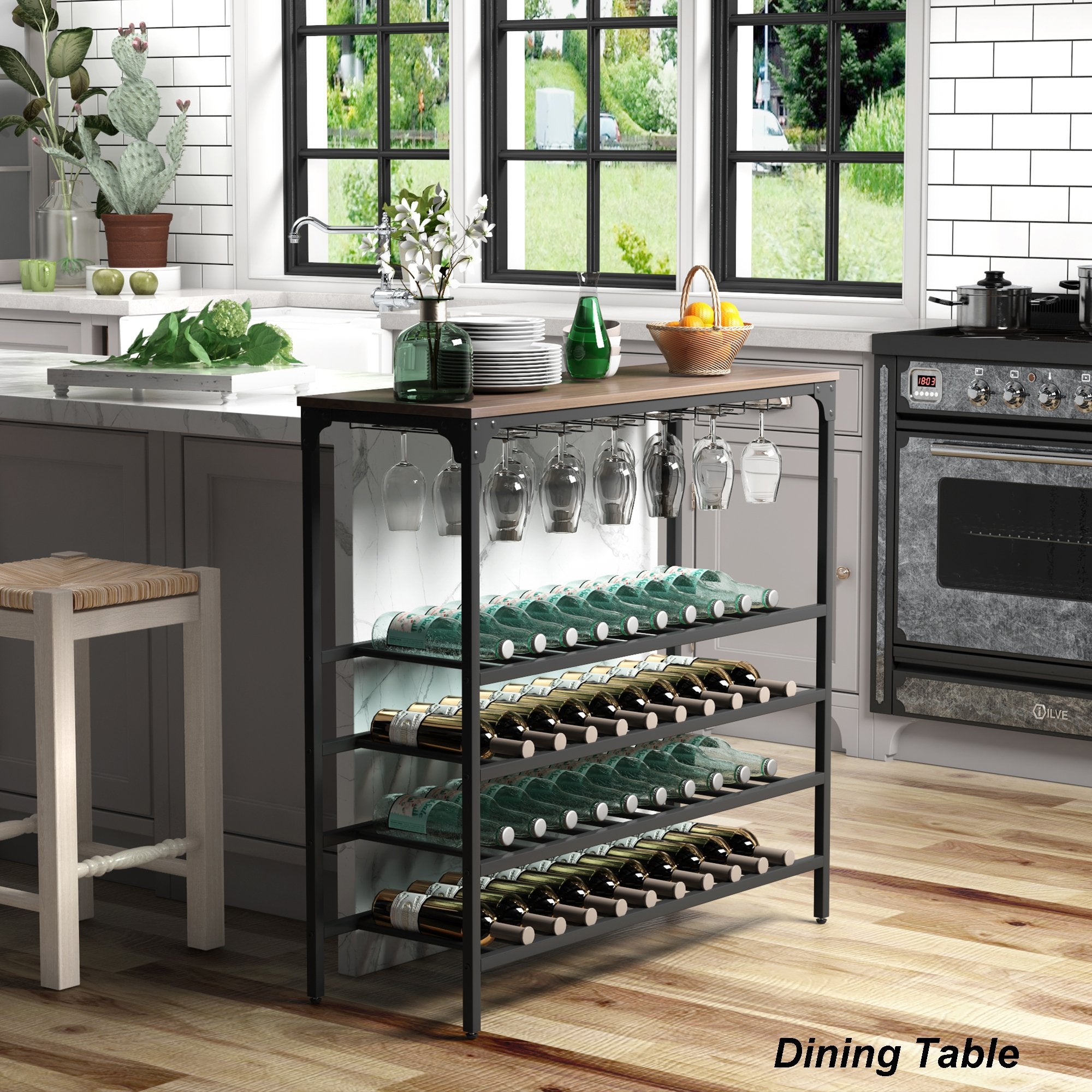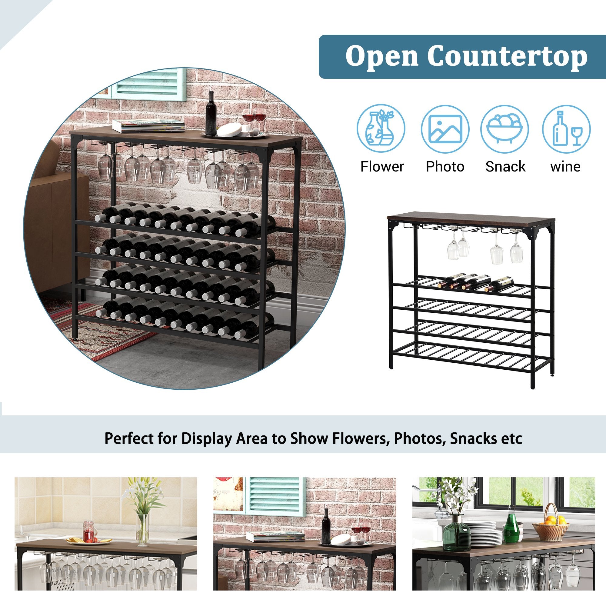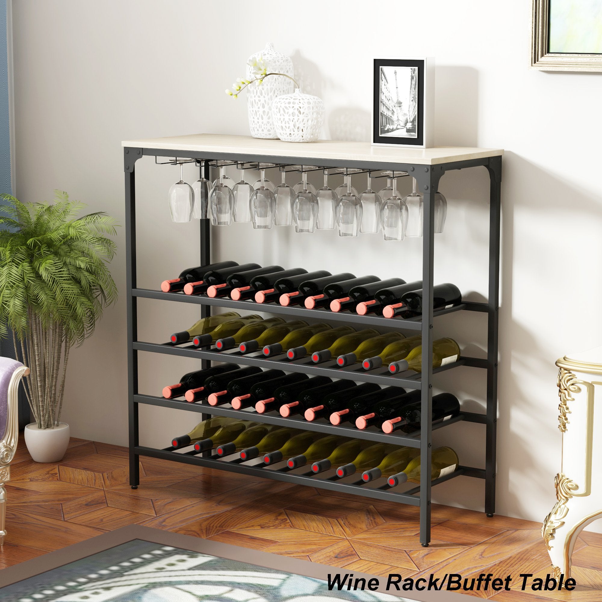 Multifunctional Wine Rack Table---Set the table as a buffet or a serving table or a dining table on a wall for a cocktail party then guests can serve themselves easily. With its open shelves, it can also be a console table for your favorite fruits, flowers, snacks and so on. With its suitable size, it can be ideal for many different places like dining room, kitchen or living room etc.
