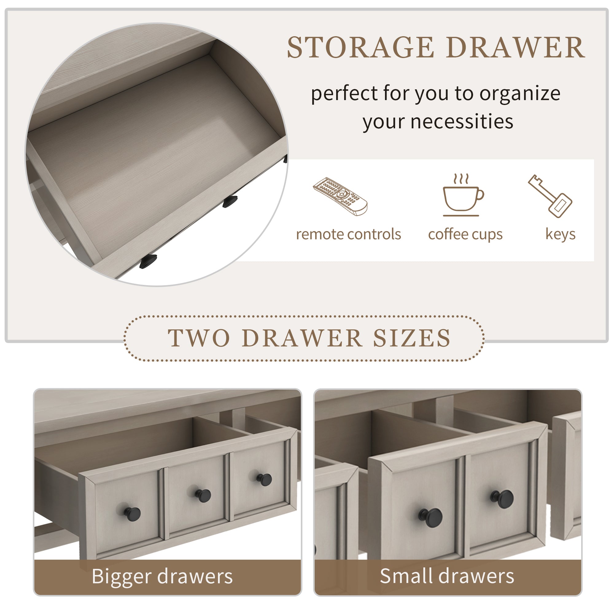 TWO DRAWER SIZES FOR STORAGE CONVENIENCE This side console table features two small drawers and two bigger drawers, perfect for you to organize your necessities and accessories of all different sizes - such as remote controls, cables, keys or coffee cups. With smooth opening and closing, these drawers will keep the dust off, while also providing beautiful external decorations in the form of uniquely patterned knobs.