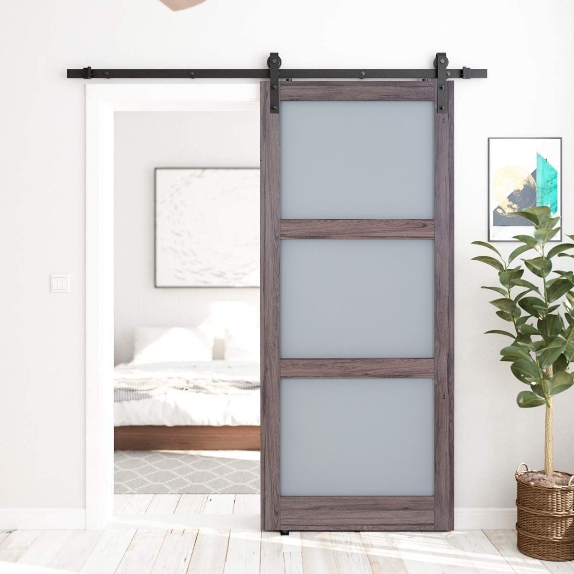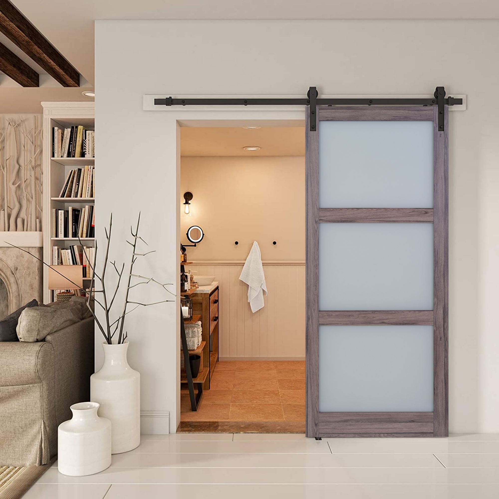 The door hardware will add a unique appearance all while emphasizing rustic charm and be the exact space-saving solution. What makes this door even more special is the trackless design that keeps floors hazard-free in addition to the hardened nylon wheels for quieter and smoother operation.