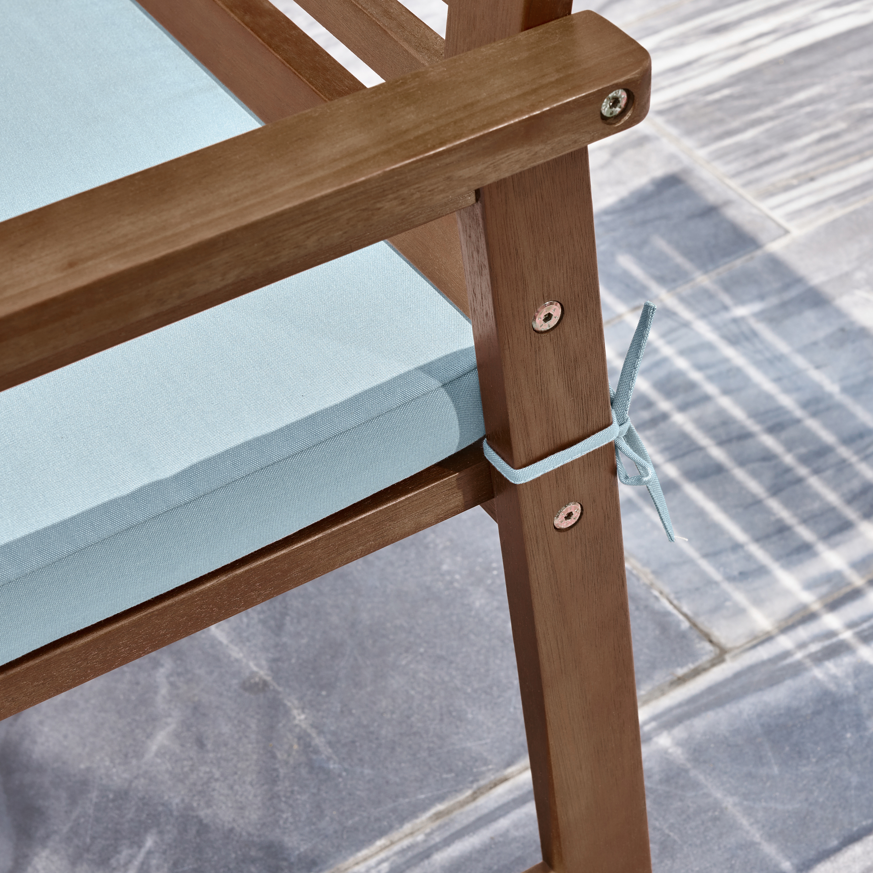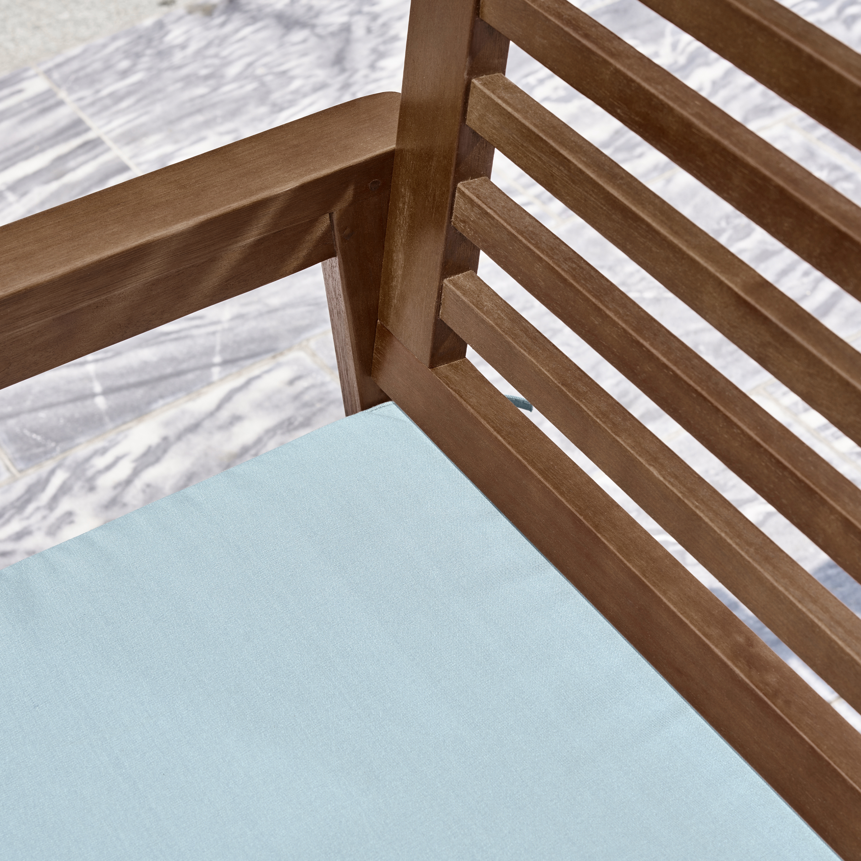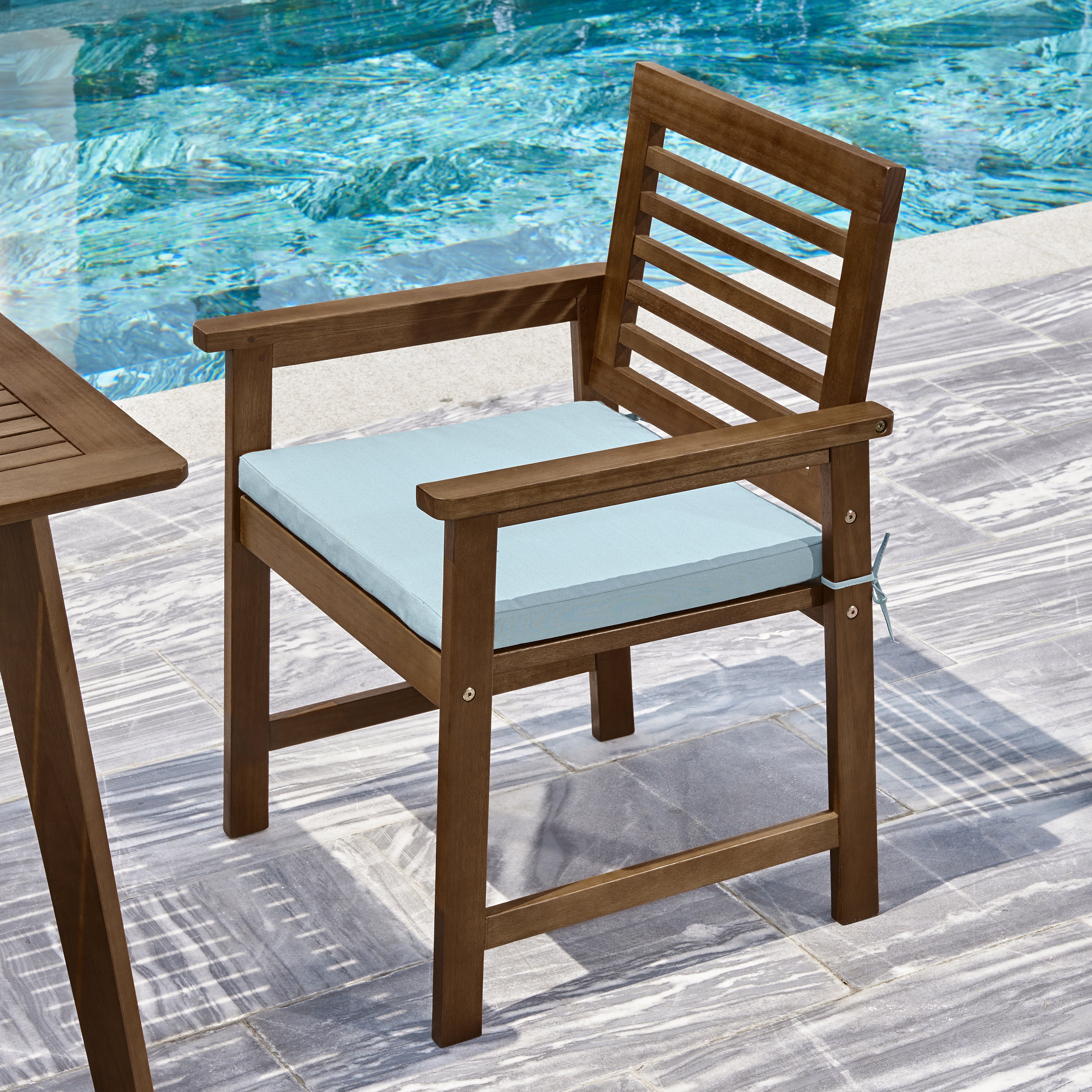- CUSHIONS ARE NOT INCLUDED- Slatted back and seat with sturdy leg design- Space-Saving: chair arms are designed to be easily pushed under the table when not in use- Eucalyptus solid wood construction with weather resistant finish- Fast and easy to assemble, all tools provided- Product Dimensions: 24"L x 24"W x 35"H- Seat Dimensions: 20"L x 20"W- Seat Height: 17"- Arm height: 25"- Weight Capacity: 250 lbs/chairFor better use, the product should be treated with one more layer of transparent hardwood sealer at the first month and apply oil once or twice a year to maintain the color. Product should be covered under harsh weather condition