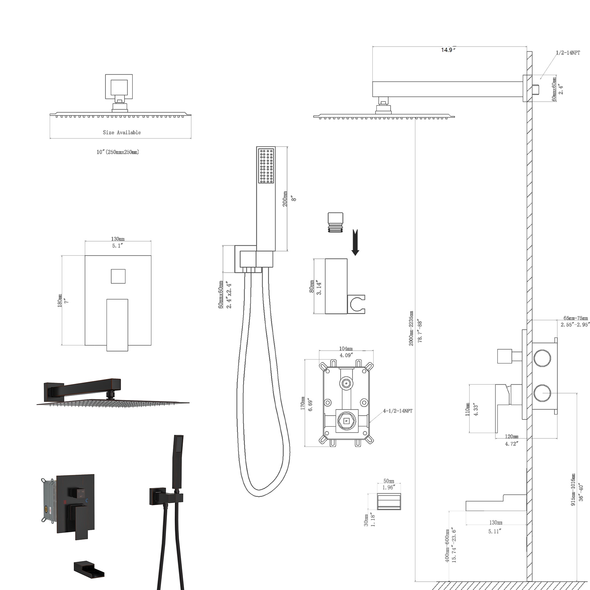 304 stainless steel square shower dual-function shower concealed set with a 360degree rotatable top spray, enjoy the rain screen washing the whole body, 10inch square shower set with the hose, shower arm, spool, etc. easy to install, solid brass shower mixing valve, corrosion resistance, high-temperature resistance, not easy to aging, different functions of the shower to provide you with a comfortable shower so that you are physically and mentally relaxed every day.