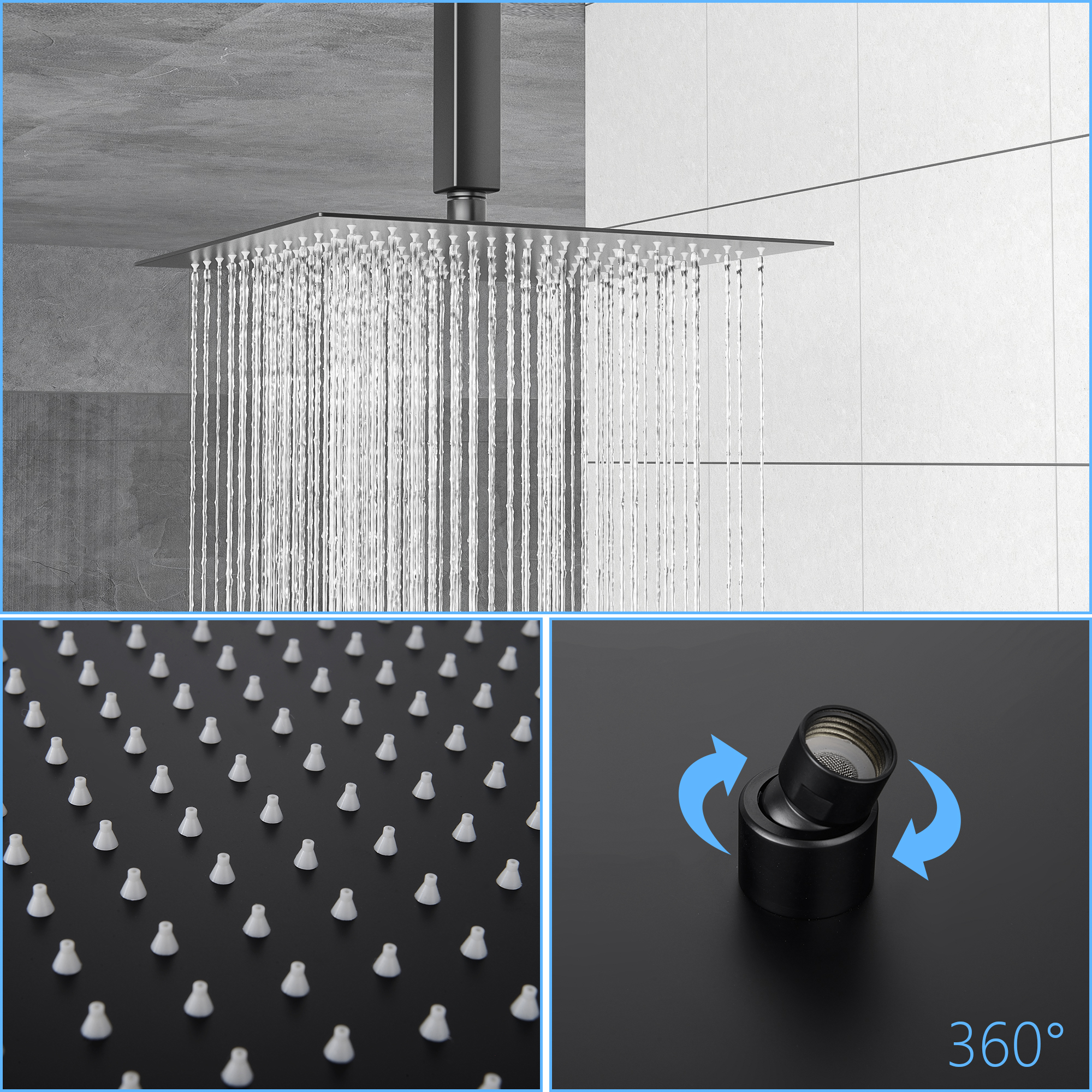 Dual function 304 stainless steel square shower concealed set, solid brass shower mixing valve. 12 inch ceiling mounted shower arm with enamel cover, corrosion resistant, high temperature resistant, not easy to aging, with shower arm, hose easy to install, different function shower to provide you with a comfortable shower, so you have the ultimate bathing experience.