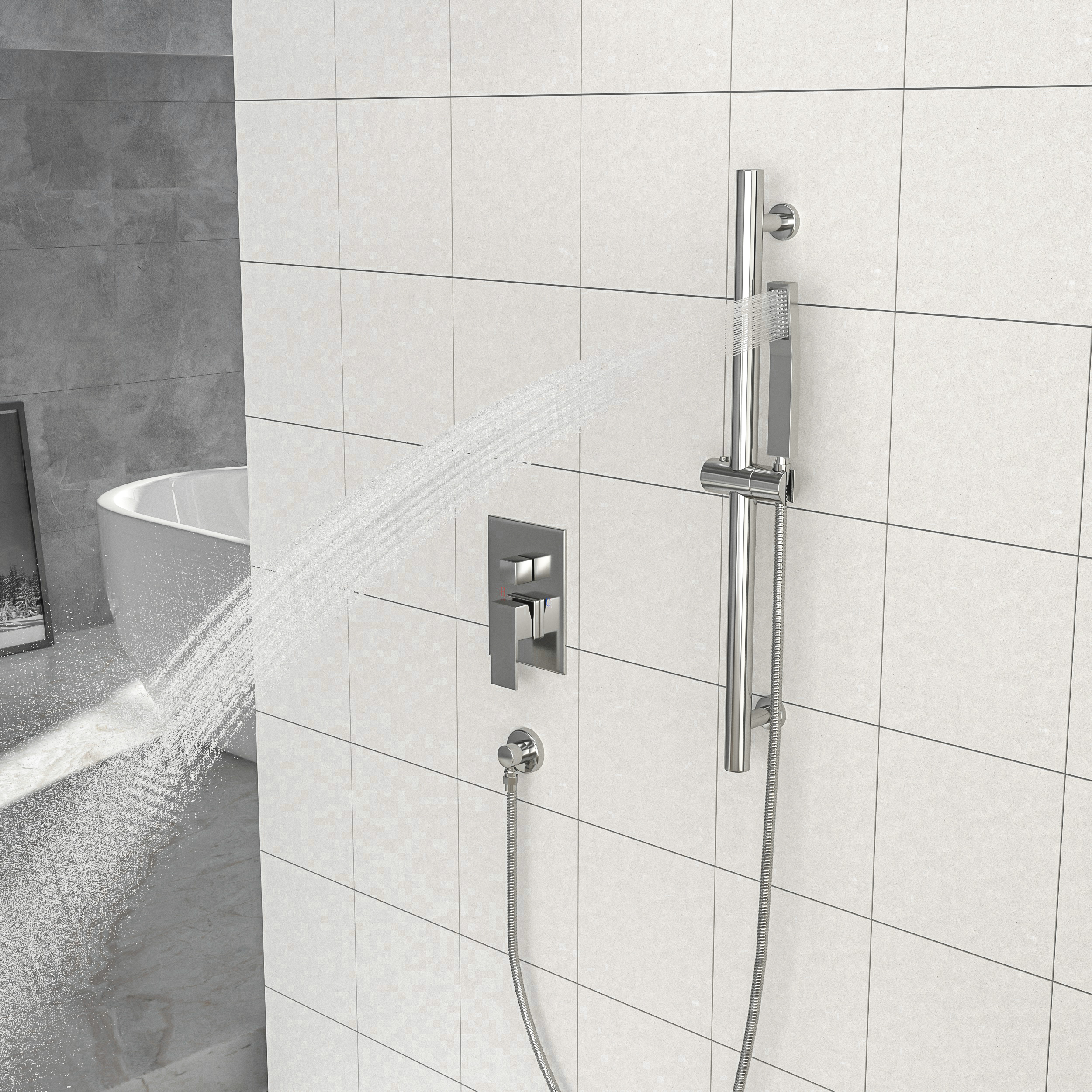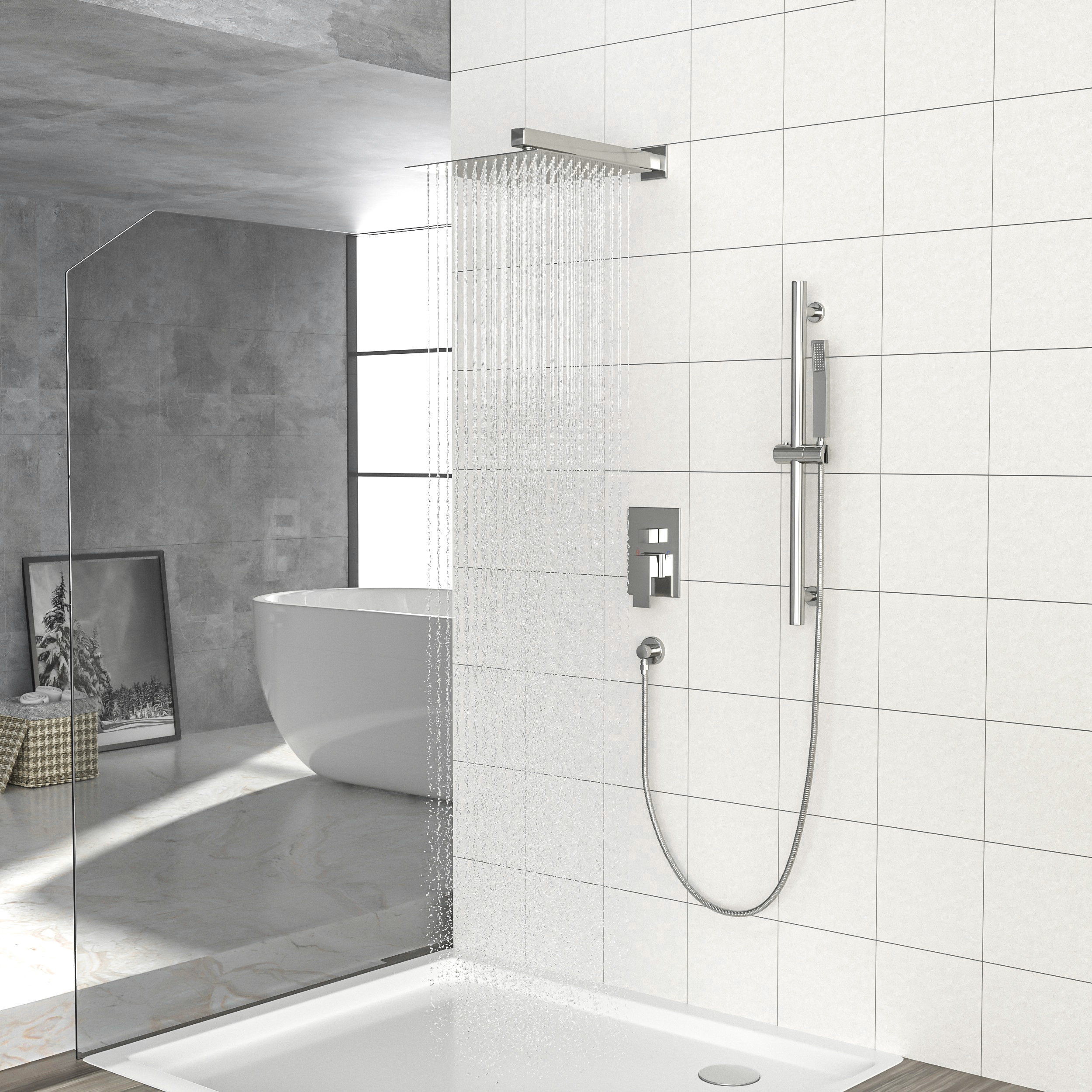 304 stainless steel square shower dual-function shower concealed set with a 360degree rotatable top spray, enjoy the rain screen washing the whole body, 12inch square shower set with the hose, shower arm, spool, etc. easy to install, solid brass shower mixing valve, corrosion resistance, high-temperature resistance, not easy to aging, different functions of the shower to provide you with a comfortable shower so that you are physically and mentally relaxed every day.