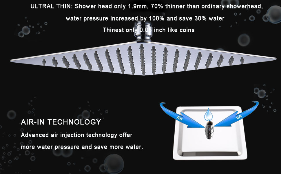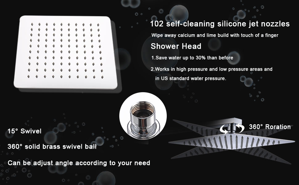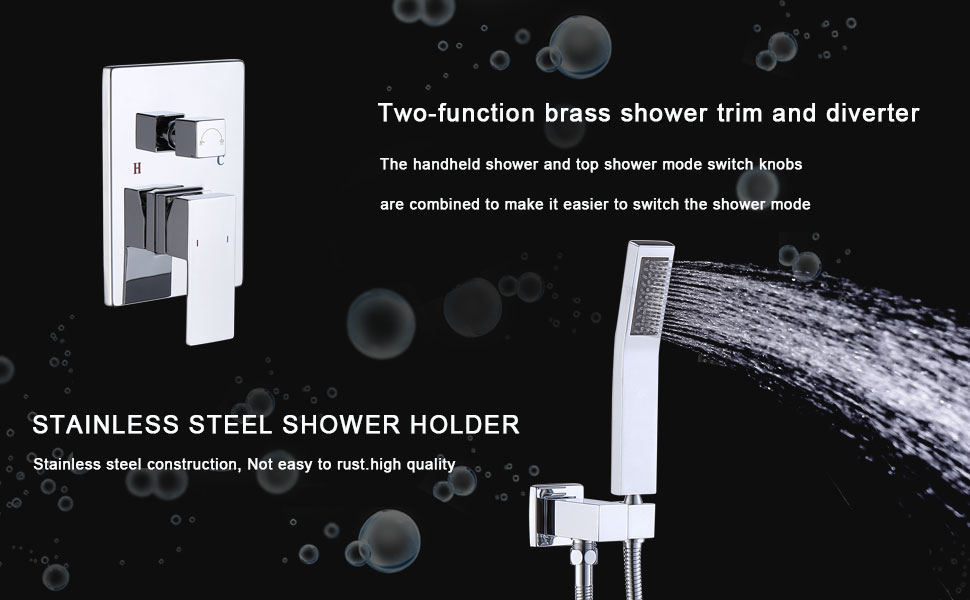 11.Included Components: Shower arm, rain shower head, handheld shower head, Brass valve faucet, shower bracket holder, shower hose