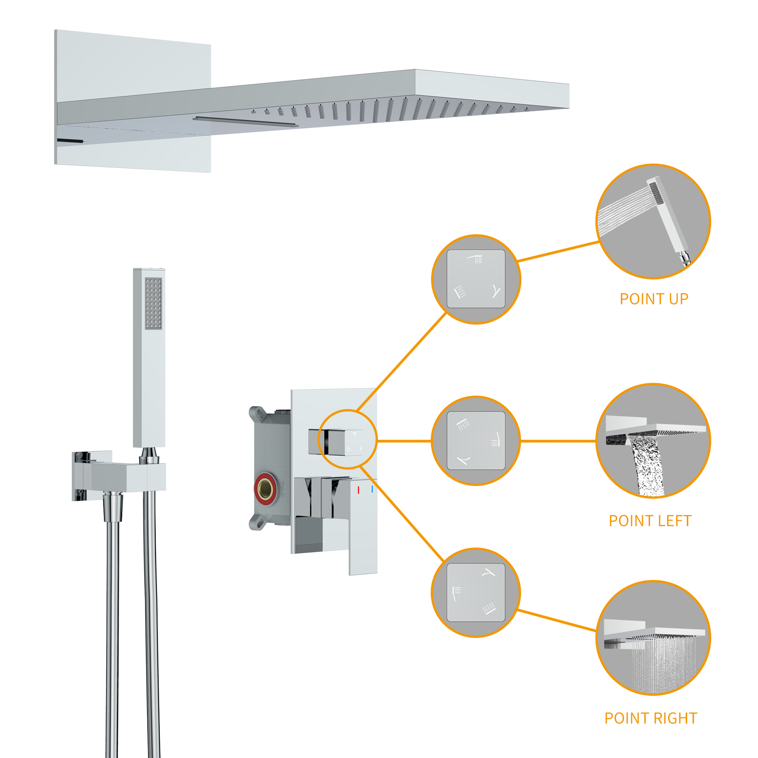 ·The rain shower head can be adjusted to any angle according to your needs.·Made of soft silicone material, you can clean the blockage and scale of the nozzle just by touching it with your hands.The pressure balance valve chamber monitors the water pressure balance to avoid scalding, our mixing valve has an adjustable cold and hot water flow device and a check valve, which helps us to adjust the proper cold and hot water flow when necessary.This shower system can switch the water outlet mode through the knob (shower/hand shower, currently does not support the simultaneous water outlet of the shower and hand shower)