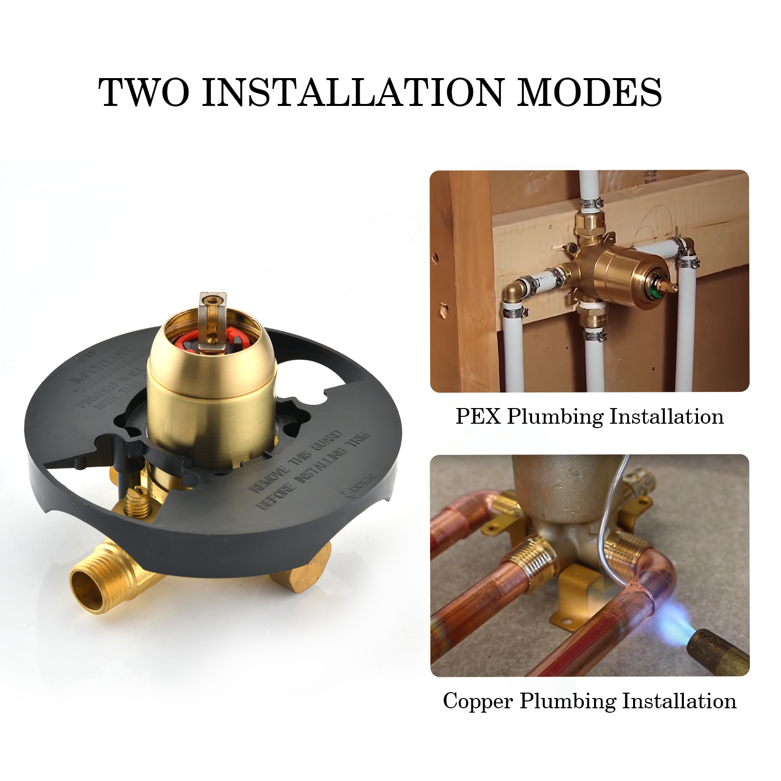 With brass construction, this shower Rough-in Valve will ensure durability and dependability. And the single handle can easily be Controlled by Hot & Cold Water and Volume. The streamlined, slightly angled handle provides a comfortable grip.