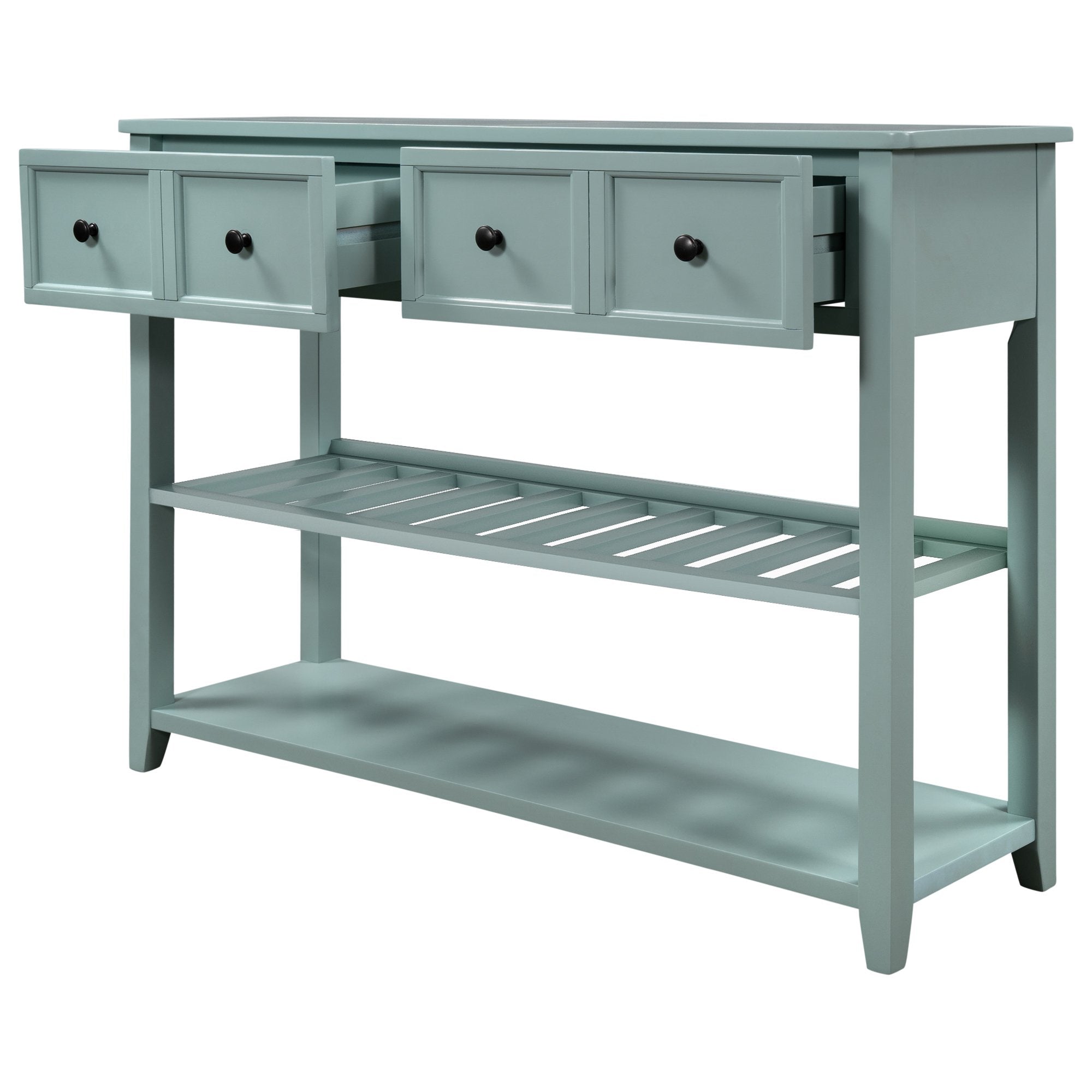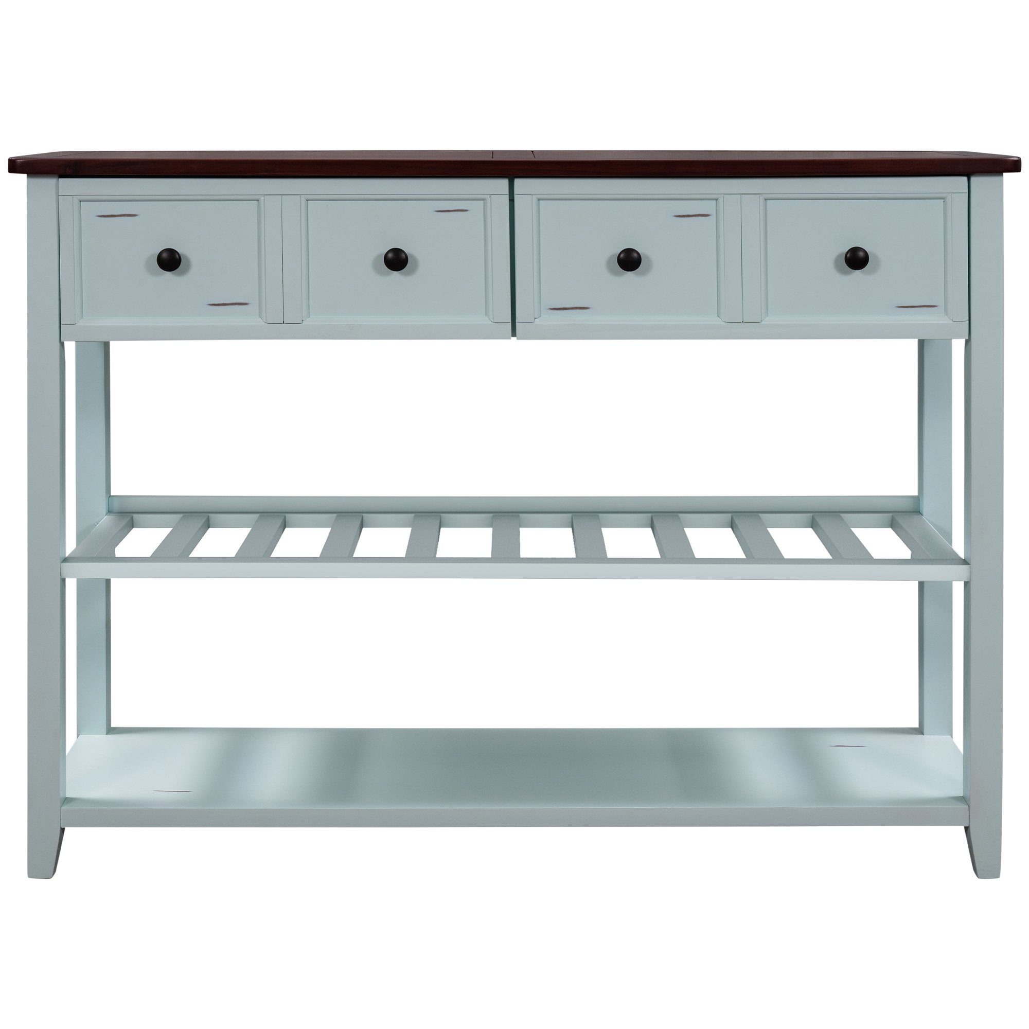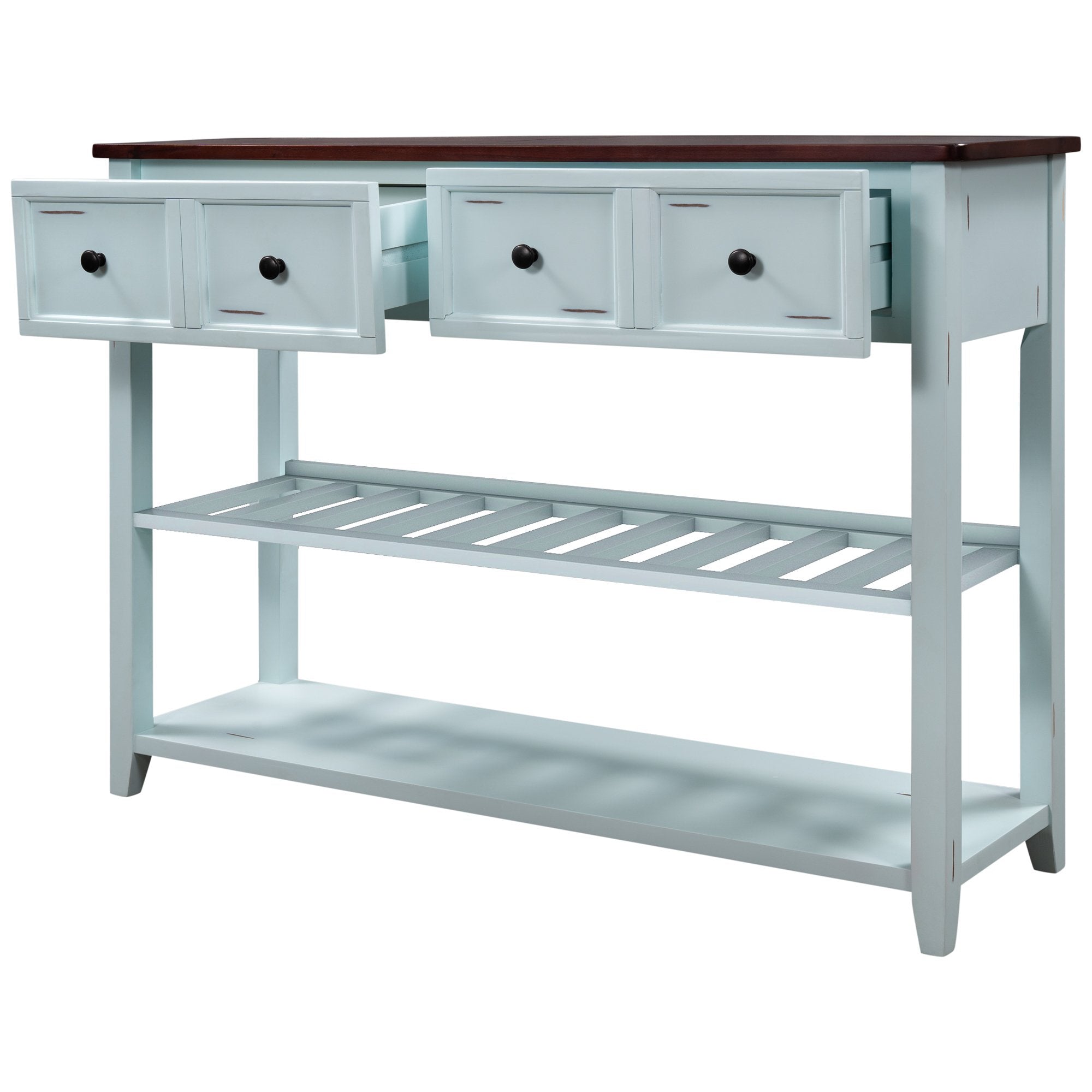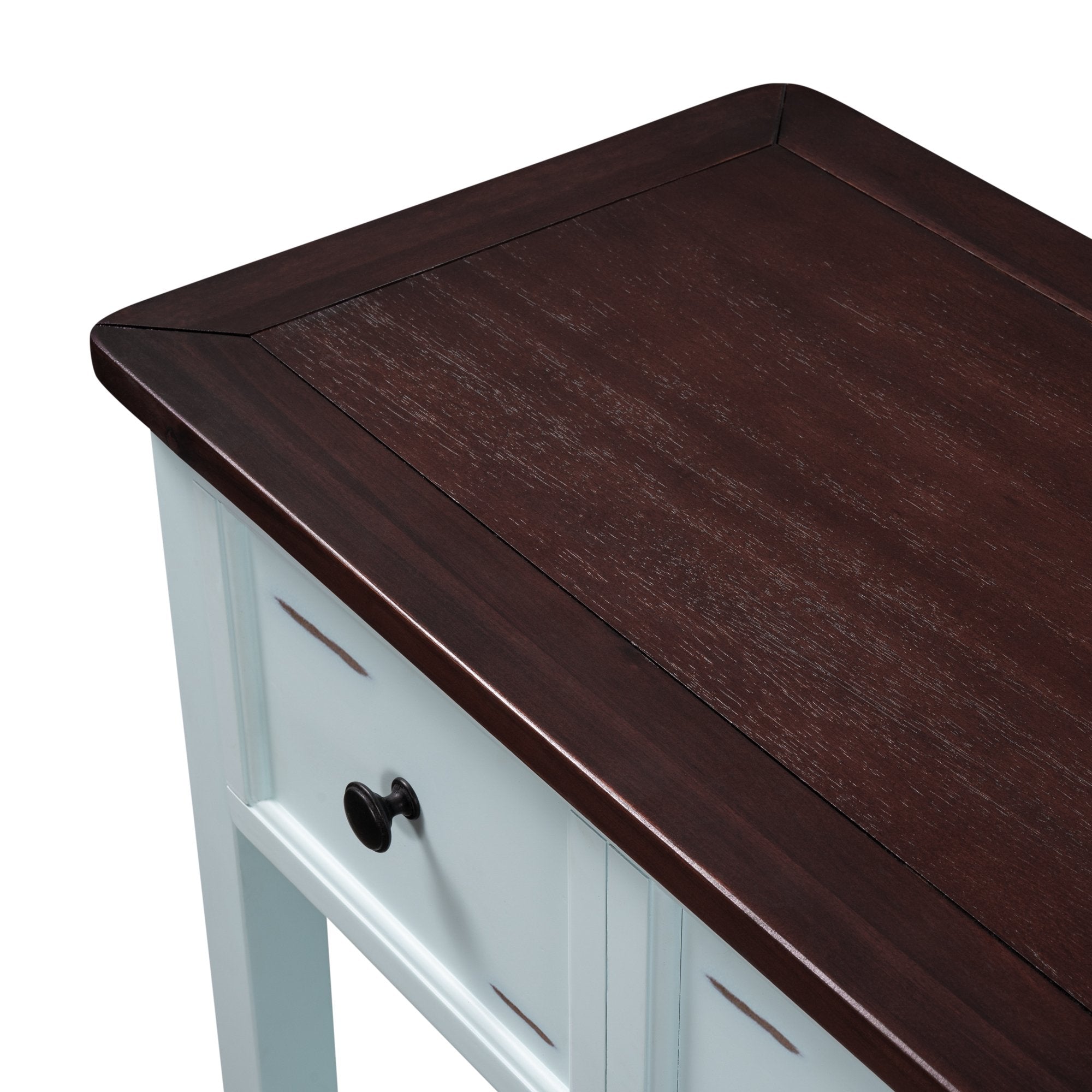 Give an empty space in your home a much needed pick me up with this Victorian era inspired console table. Crafted with a design that exudes elegance, this table features wood accent detailing throughout the strengthened mixed Pinewood frame for a chic overall aesthetic. With plenty of space to offer, utilize the two front facing storage drawers to minimize clutter while keeping select essentials within easy reach, or display your favorite décor on the spacious upper counter or bottom shelf.