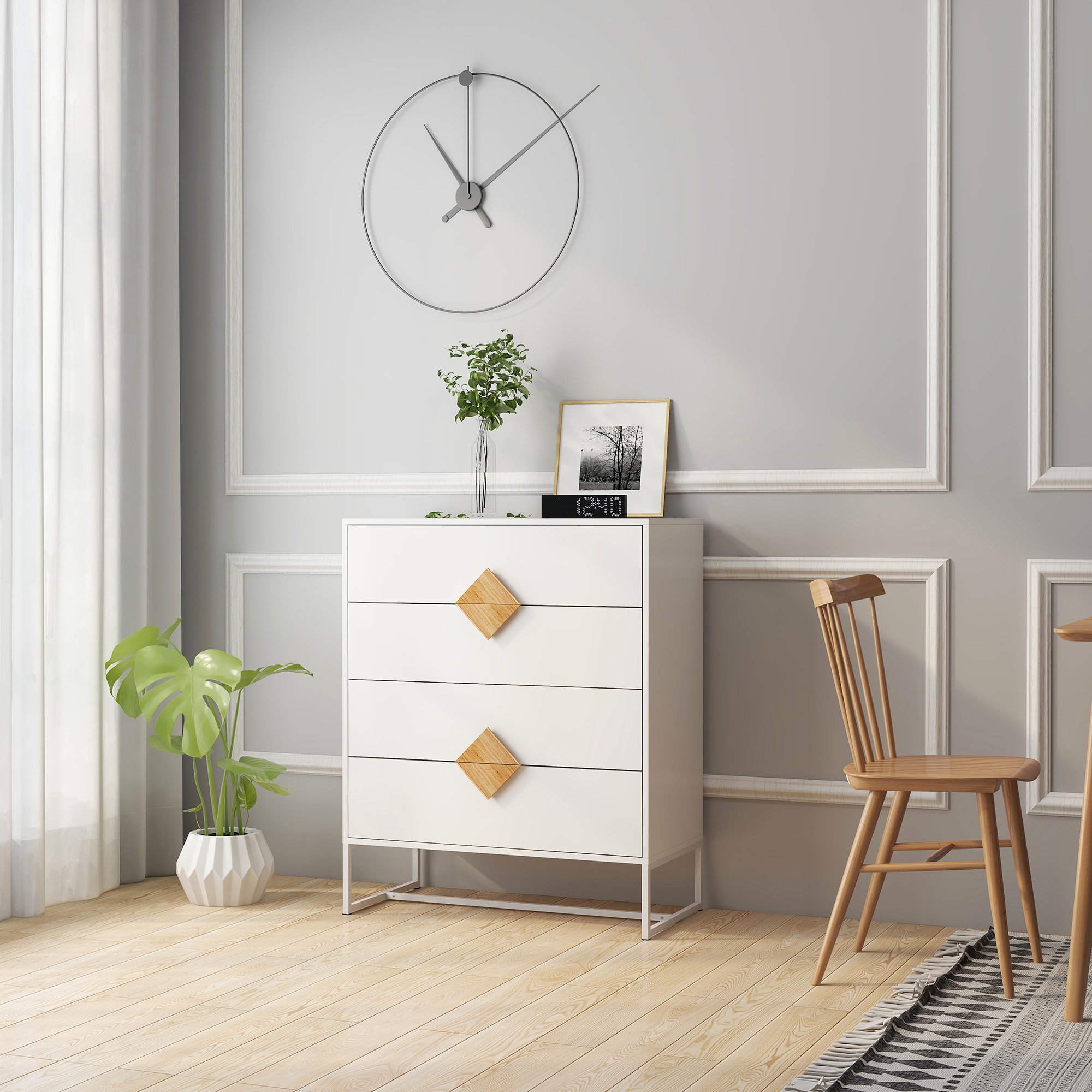 Solid wood special shape square handle design with 4 drawers. The square wooden handle with special shape is simple in design and widely used. You can use it as a bedroom dresser or wardrobe.